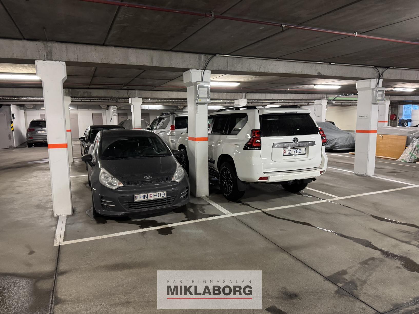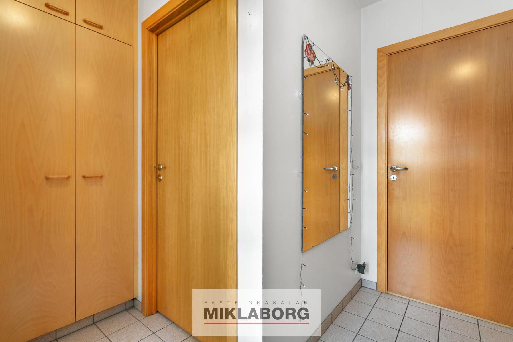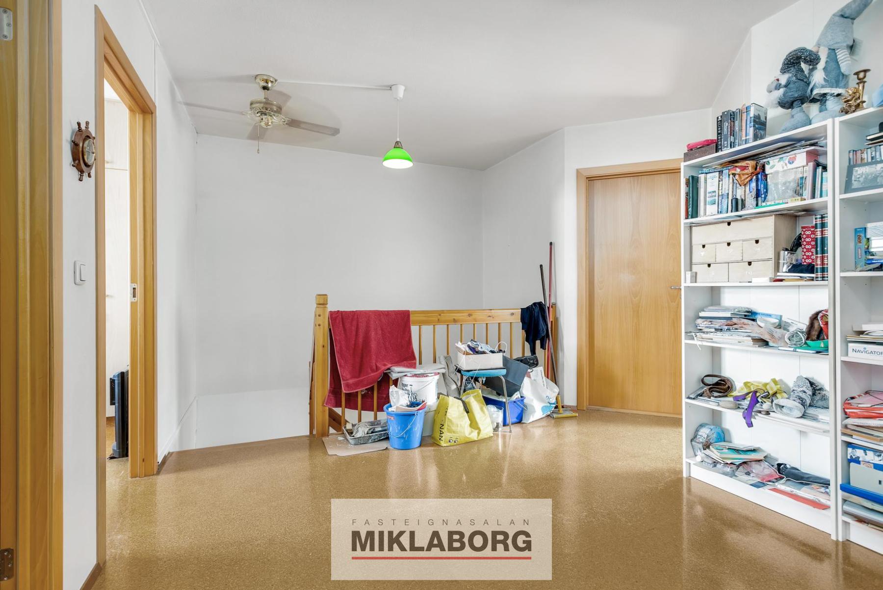 Gengið upp á efri hæð um furustiga. Komið upp á stigapall / hol sem leiðir inn í svefnherbergin þrjú. Stærst er hjónaherbergi með góðum skápum og tvö minni svefnherbergi. Holið nýtist vel sem sjónvarpsrými. Flísalagt baðherbergi með baðkari og sturtu. Gólfefni á hæðinni er korkflísar en flísar á baði. Bílastæði og geymsla eru í lokuðum bílakjallara. Þar er einnig sameiginleg þvottaaðstaða fyrir íbúa með öfliugri þvottavél og þurrkara í eigu húsfélags.