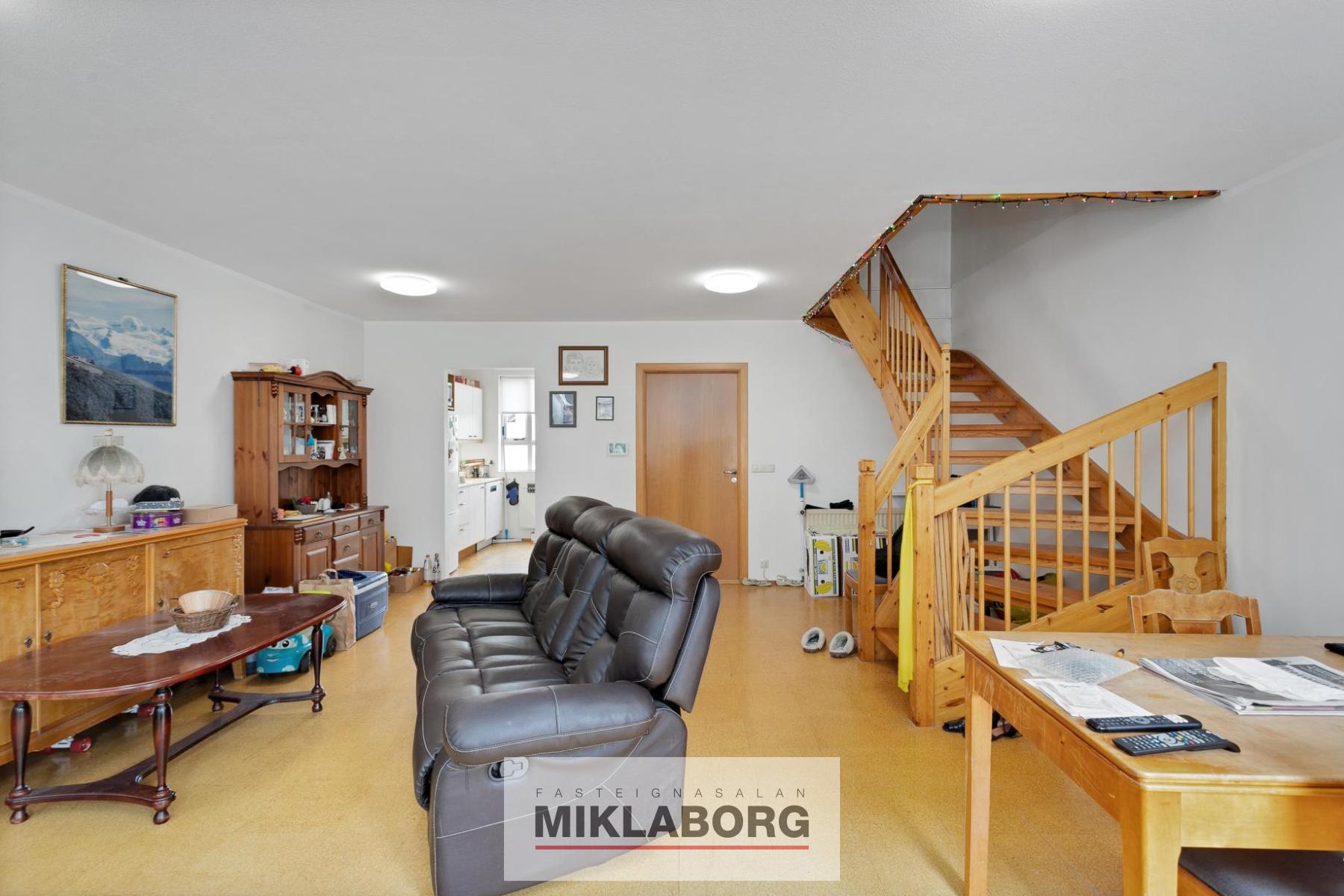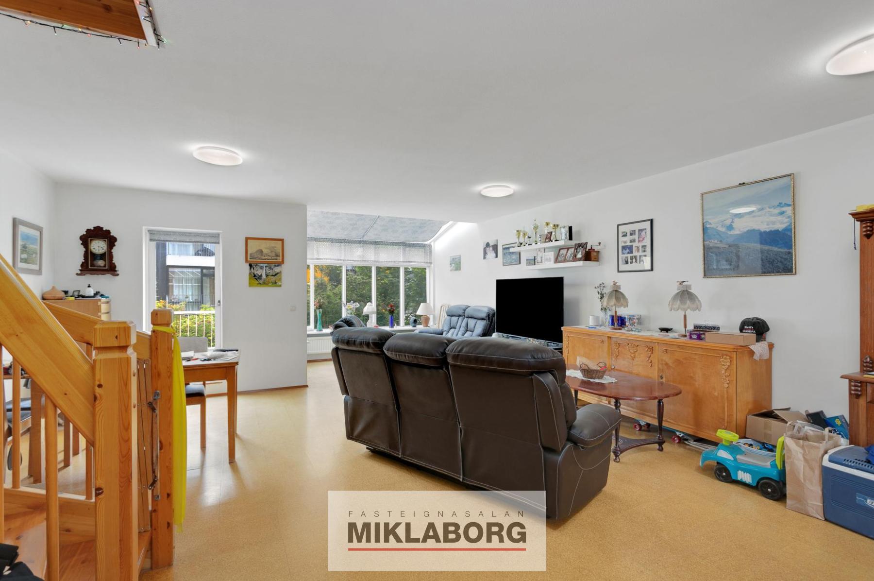 NÁNARI LÝSING: Komið er inn í forstofu með fataskápum. Gestasnyrting þar inn af. Gengið áfram inn í alrými með stórum samliggjandi stofum með sólskála og viðarstiga upp á efri hæð. Úr stofu er gengið út á suðursvalir. Eldhús er á neðri hæðinni. Innrétting er úr hvítu og beyki og hafa uppþvottavél og eldavél verið endurnýjaðar. Korkflísar eru á gólfum neðri hæðar nema á gestasnyrtingu. Þar eru flisar.
