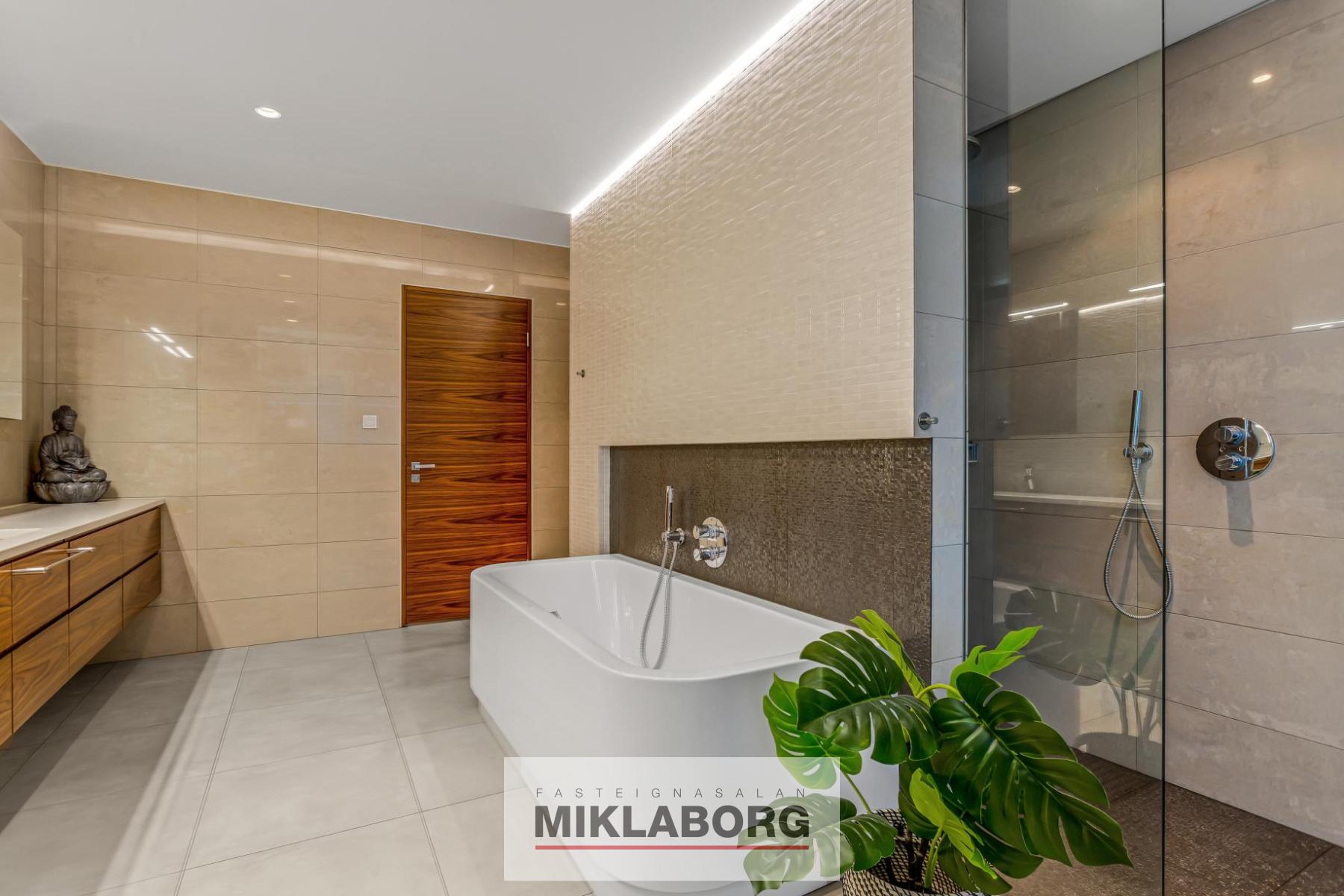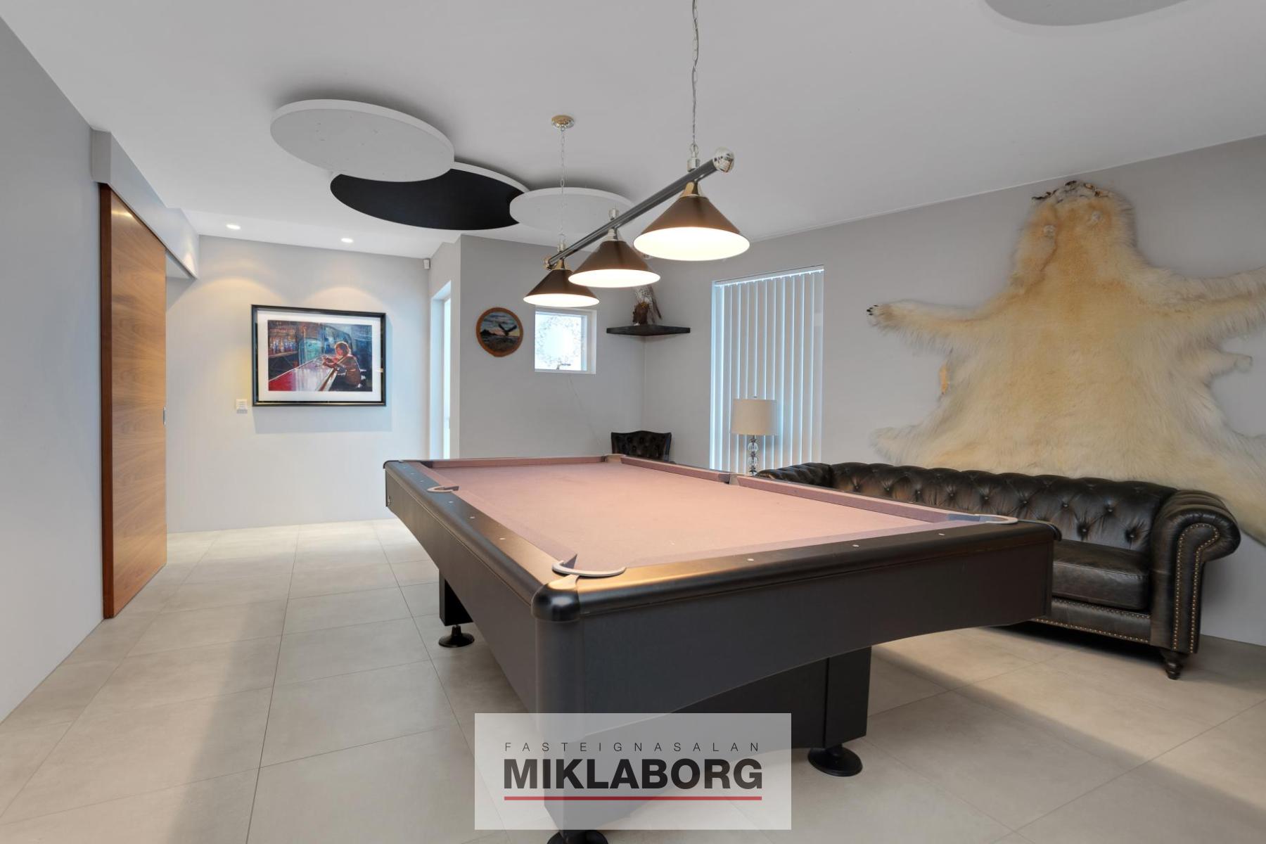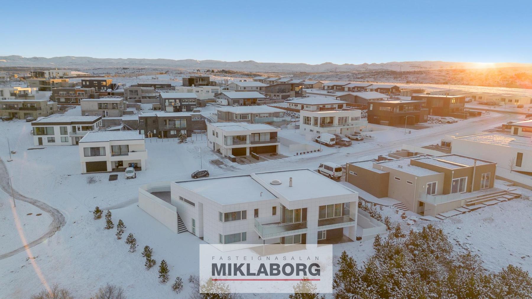 NÁNARI LÝSING: Gengið er inn á efri hæðina í rúmgott anddyri með skápum. Eldhús er með fallegri hvítlakkaðri innréttingu, eldunareyju og stein á borðum. Eldhús er sérlega rúmgott og er opið inn í stórar stofur. Gasarinn í stofu. Gólfsíðir gluggar með óheftu útsýni til vesturs, norðurs og austurs. Rúmgóðar og bjartar stofur. Baðherbergi á efri hæð er með sturtu, rúmgott þvottahús á hæðinni og gott auka svefnherbergi. Vinnukrókur er einnig á hæðinni. Sérlega rúmgóður tvöfaldur bílskúr sem er innangengt í gegnum þvottahús. Gengið er niður steinsteyptan stiga á neðri hæðina niður í hol. Stórt sjónvarpsherbergi og innan við það er "hobby" herbergi með vínkjallara. Hluti af því rými er ekki skráð inn í birta fermetra og er húsið því stærra en skráning segir. Tvö mjög góð svefnherbergi. Hjónasvítan er með stóru baðherbergi með baðkari og "walk in" sturtu, fataherbergi og góðu svefnherbergi. Útgengt er frá baðherberginu út í yfirbyggðan heitan pott og gufu.