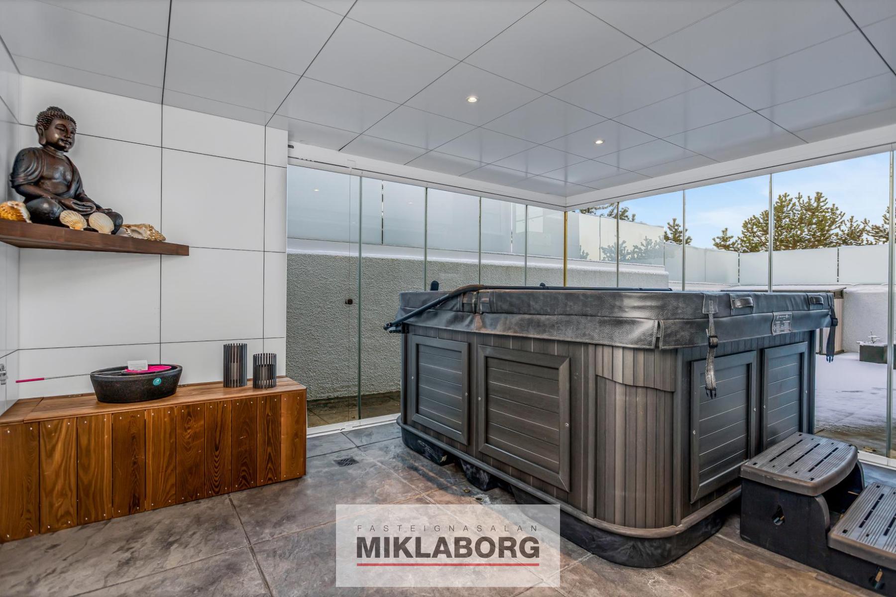 Miklaborg kynnir: Nýlegt og stórglæsilegt 440 fm einbýlishús á einstökum útsýnisstað í Kópavogi. Húsið stendur á einstakri lóð innst í botnlanga við stórt opið grænt svæði ofan við golfvöll GKG. Afstaða hússins er góð, innra skipulag frábært og hönnun falleg. Engu hefur verið til sparað við efnisval. Húsið er einangrað að utan og klætt og því viðhaldslétt.