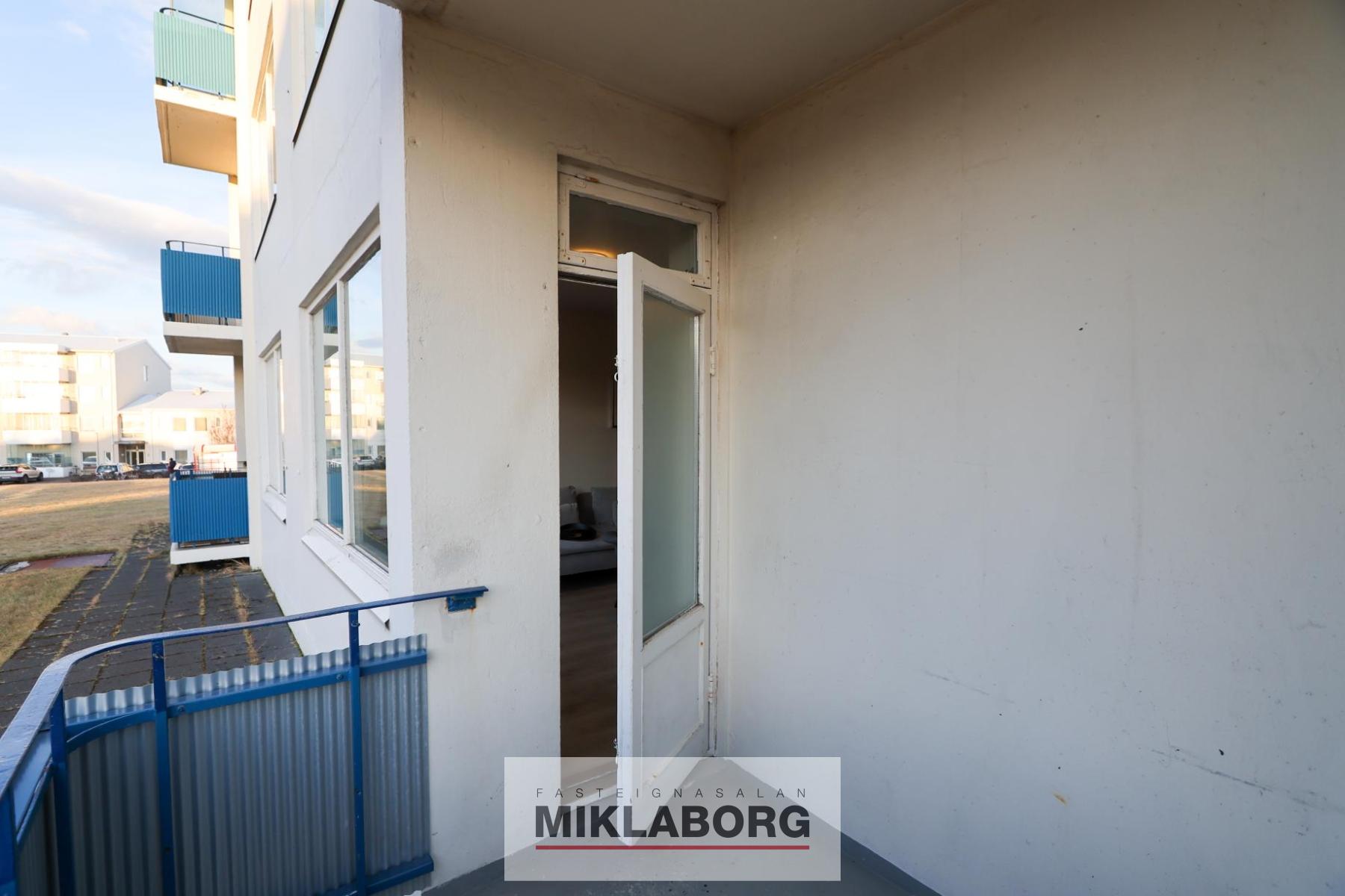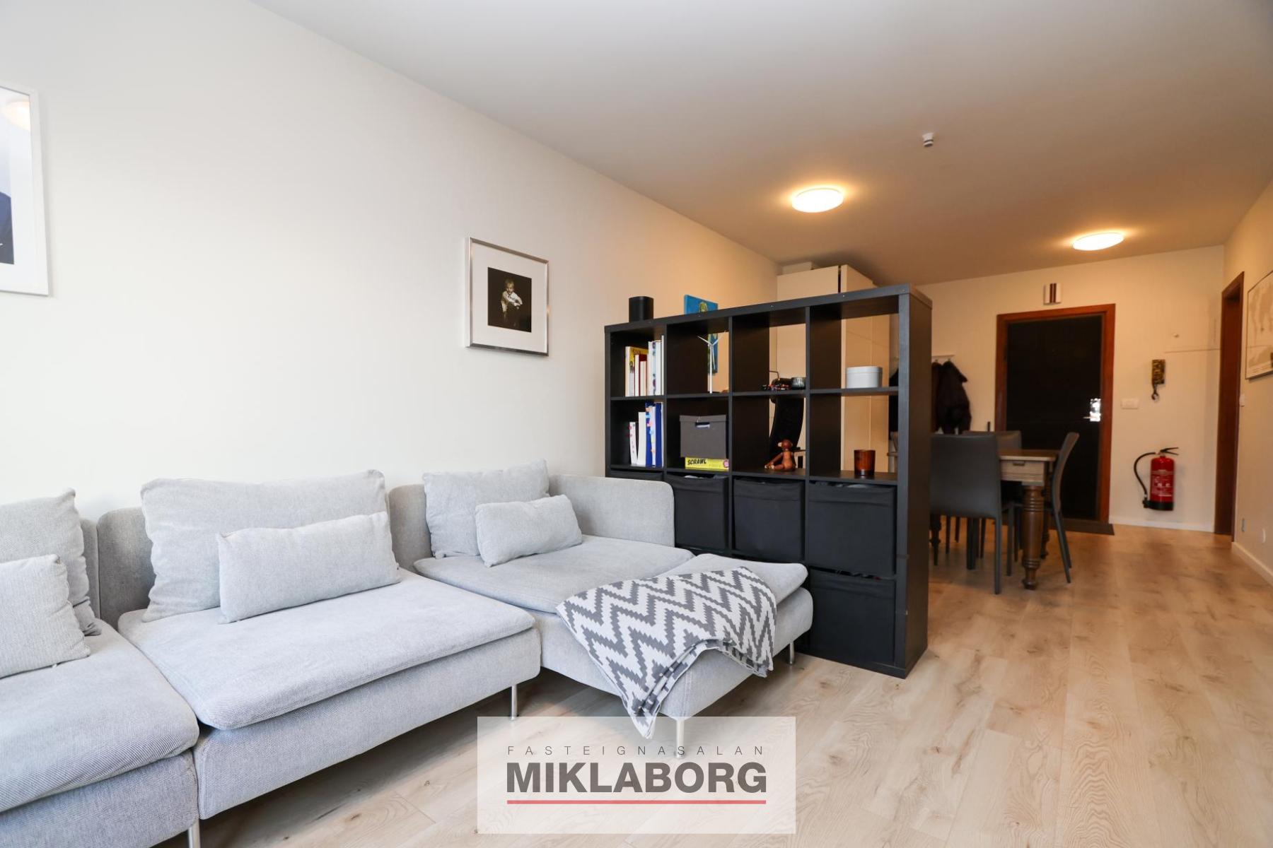 Nánari lýsing: Gengið er inn í rúmgott forstofuhol með stórum hvítum fataskáp. Á vinstri hönd er baðherbergi og þar við hliðina eldhús, en hvort tveggja hefur verið endurnýjað á smekklegan hátt. Baðherbergi er með stæði fyrir þvottavél og þurrkara. Stofan er björt og liggur beint af holi, en inn af henni er svefnherbergi. Frá stofu er útgengt á svalir sem snúa í suðvestur. Á jarðhæð er sameiginlegt þvottahús.