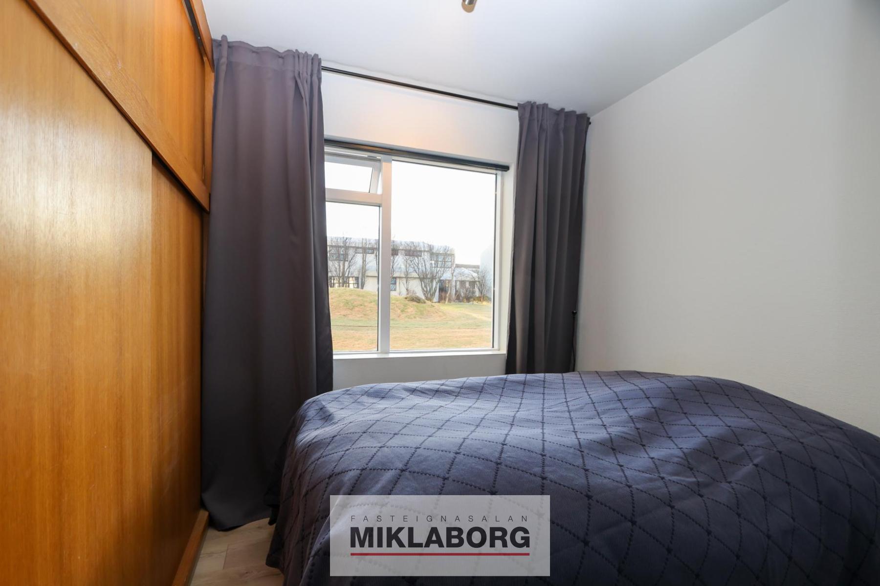 - Svefnherbergi: Parket á gólfi og fataskápur.