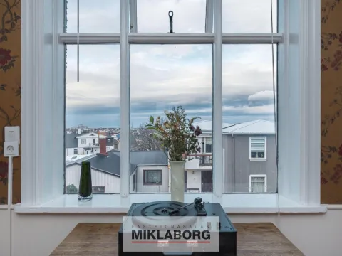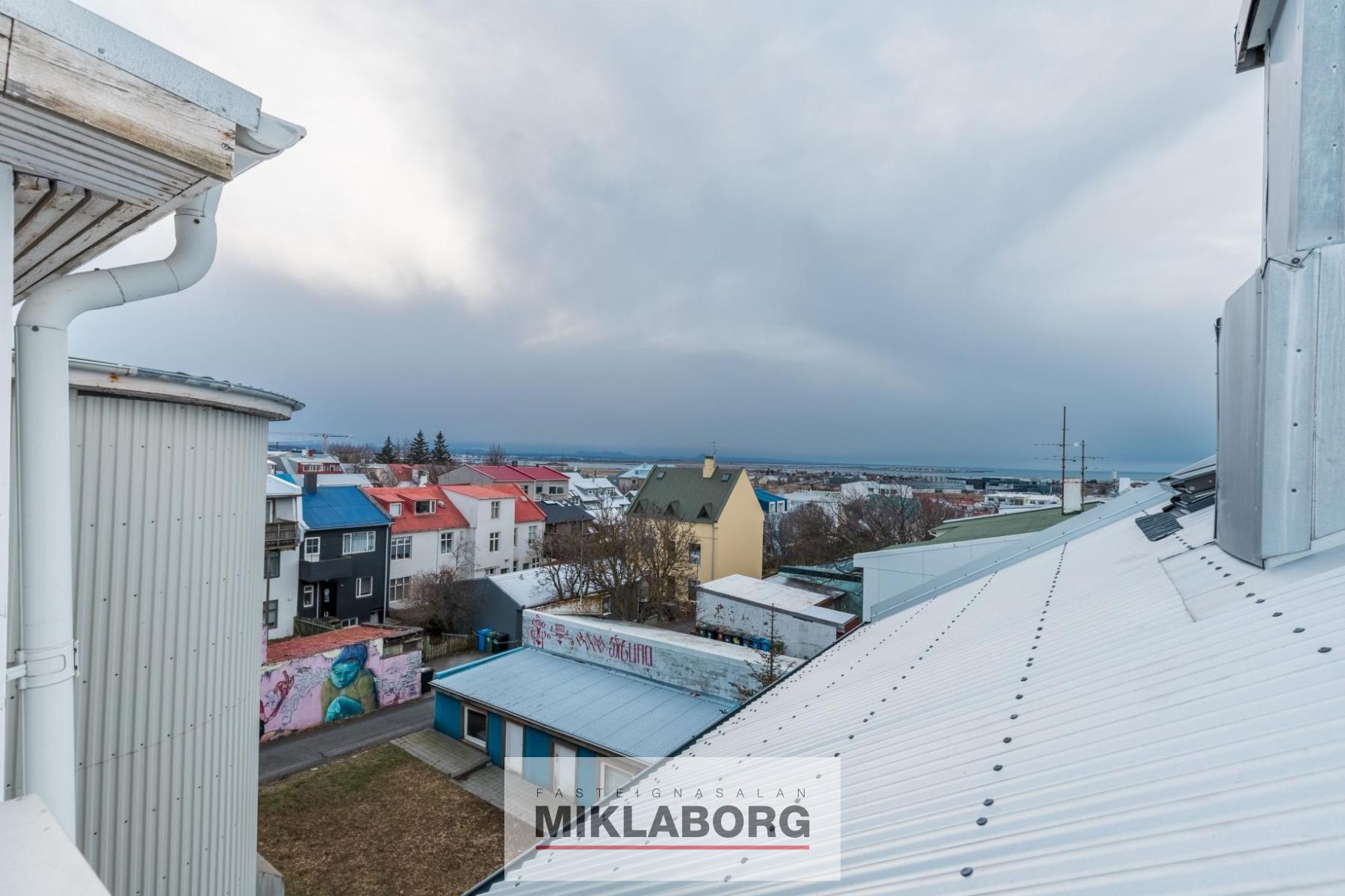 Úr stigagangi er komið inn í bjarta stofu, úr stofu er útsýni yfir miðbæ Reykjavíkur