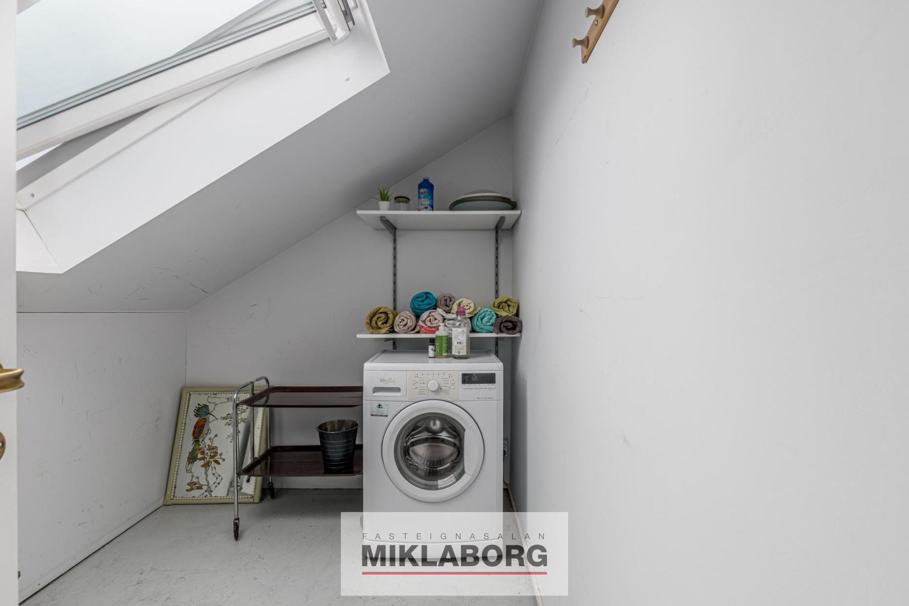 Eigninni fylgir rými í risi með glugga, en þar er tengi fyrir þvottavél og pláss fyrir snúrur