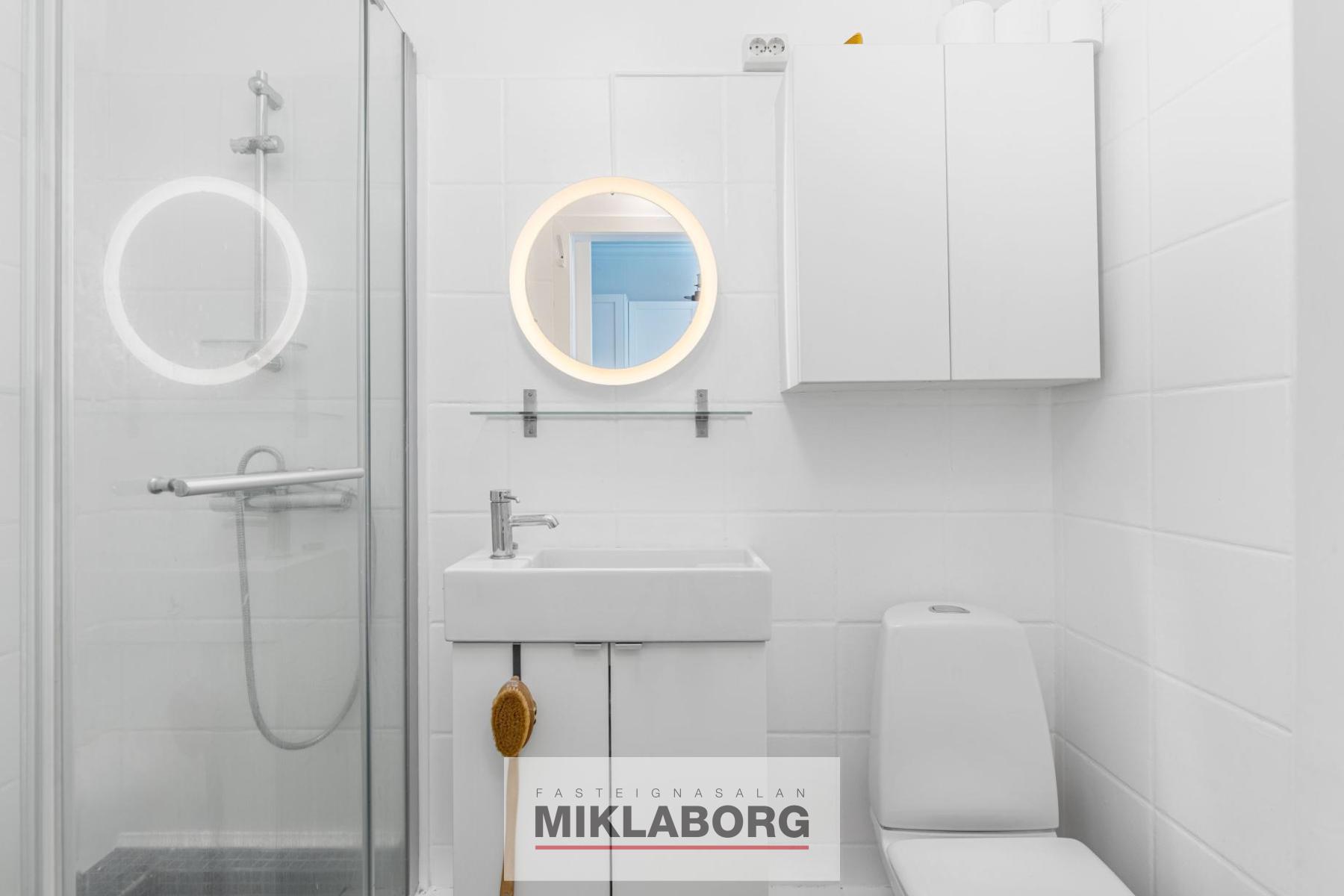 Baðherbergið: er flísalagt, þar er sturta og skápur á vegg
