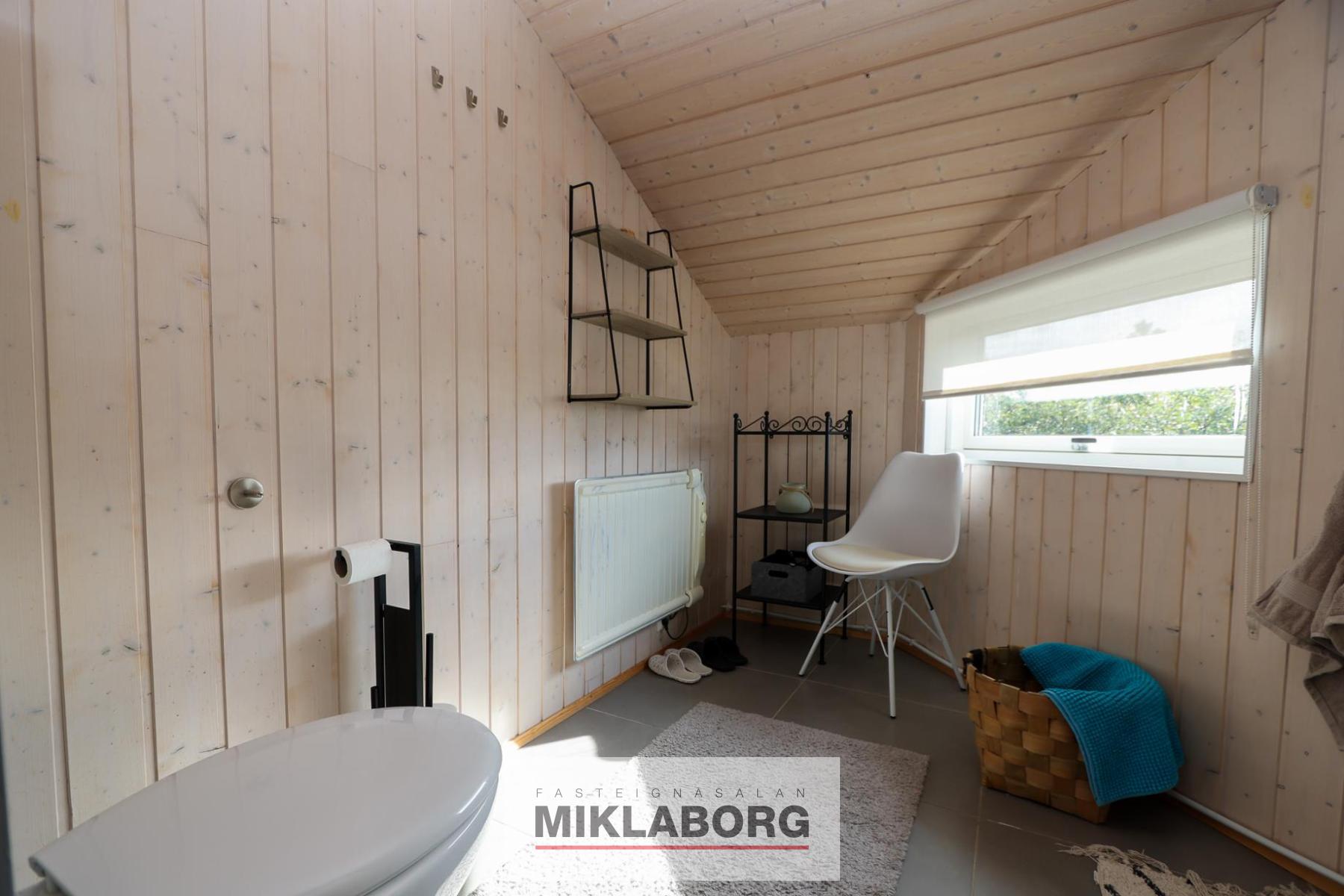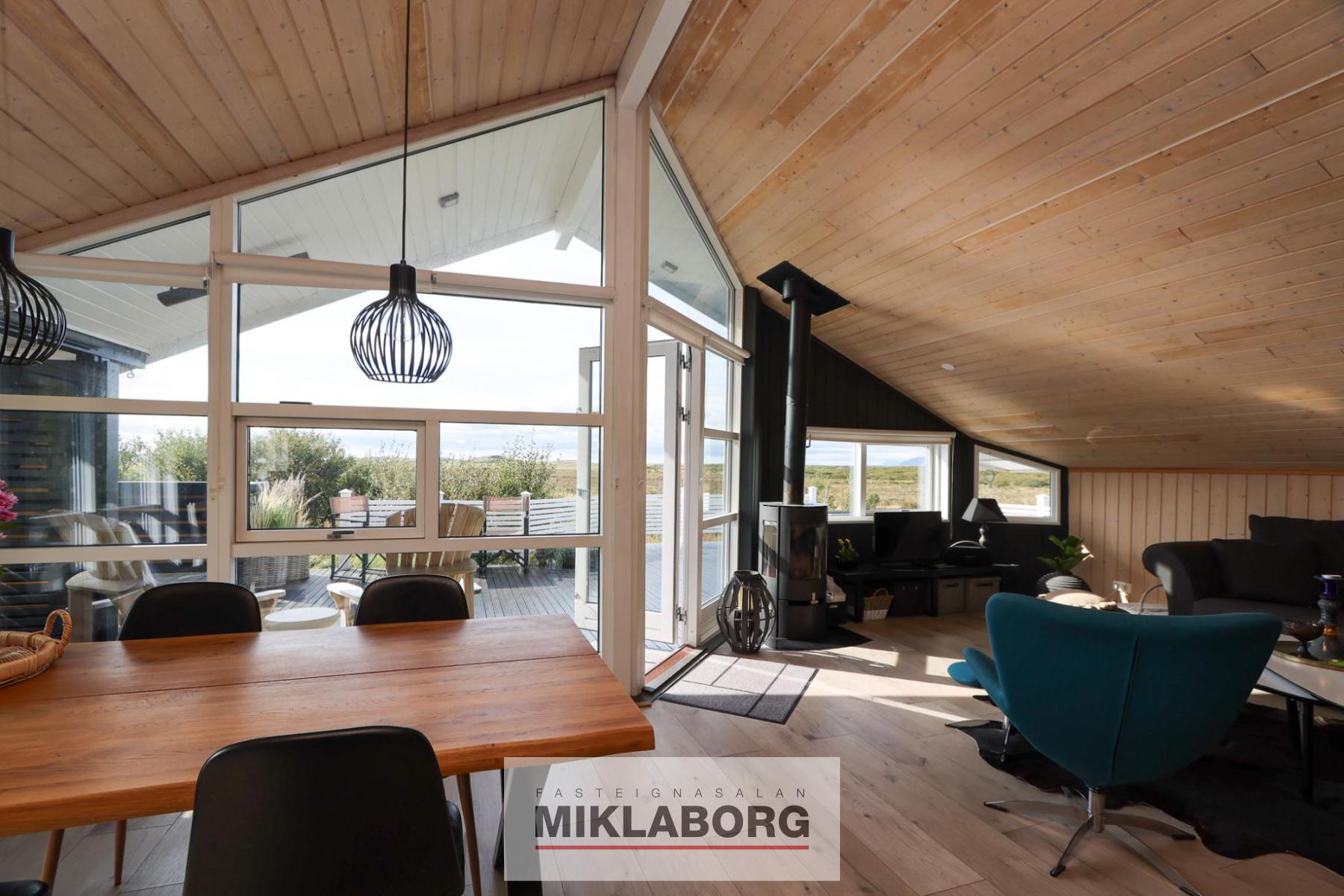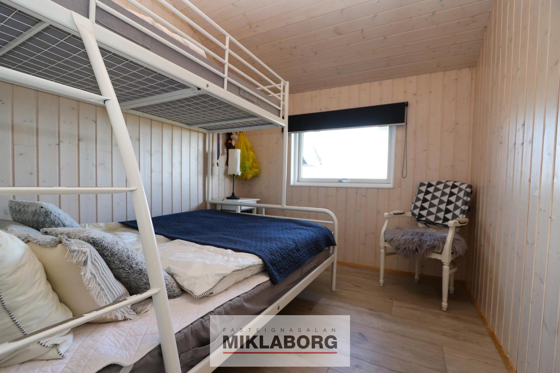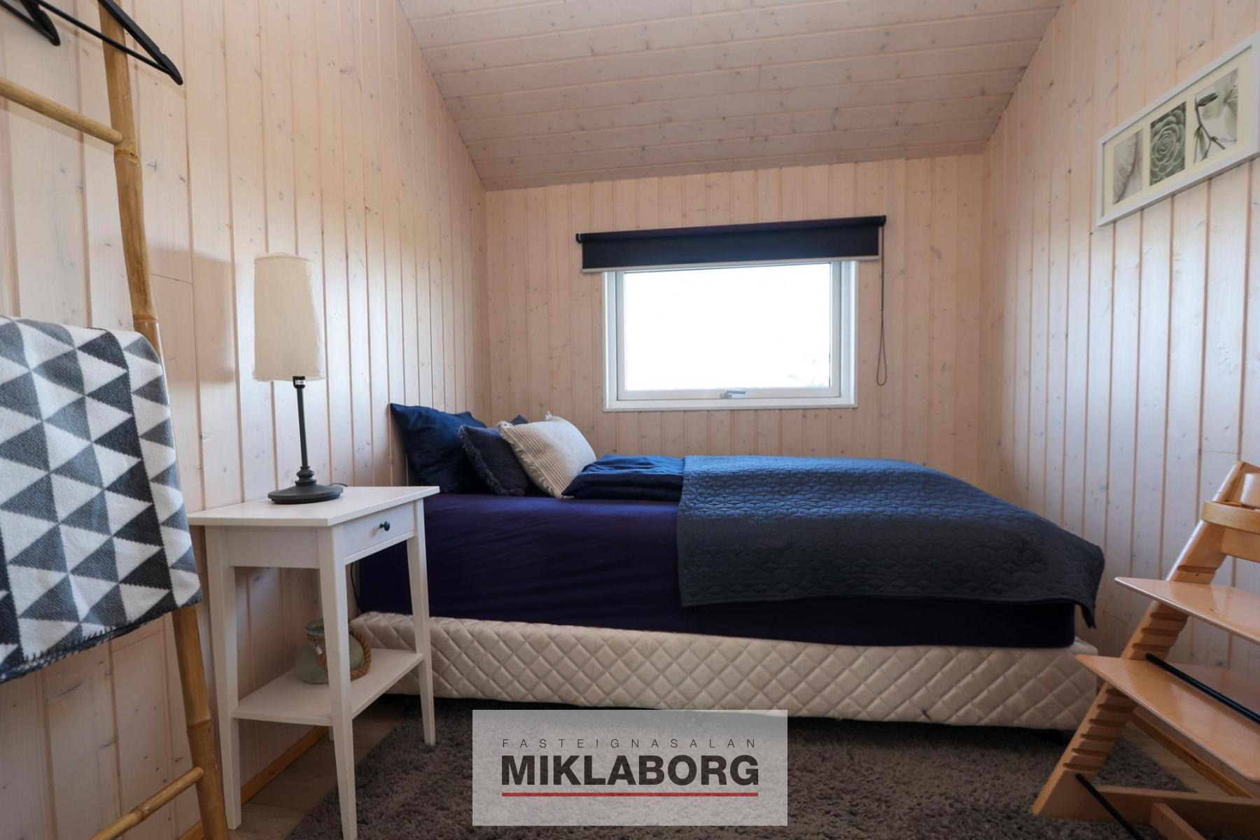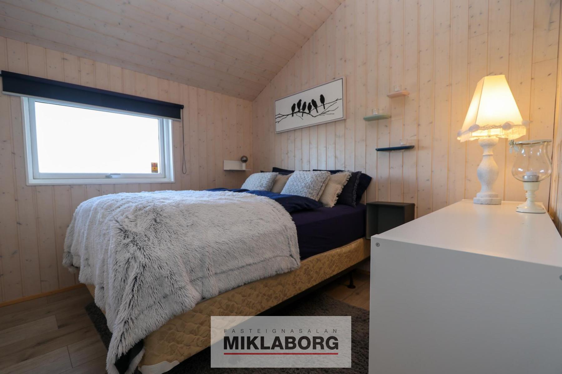 Tveir inngangar: bakdyramegin inn á svefnherbergisgang og framdyramegin beint inn í stofu. Hvíttuð fura er í loftum og á veggjum. Fallegt harðparket á öllum gólfum nema í geymslu og á baði. Ofnar eru í húsinu en rekstur er hagkvæmur með varmadælu.