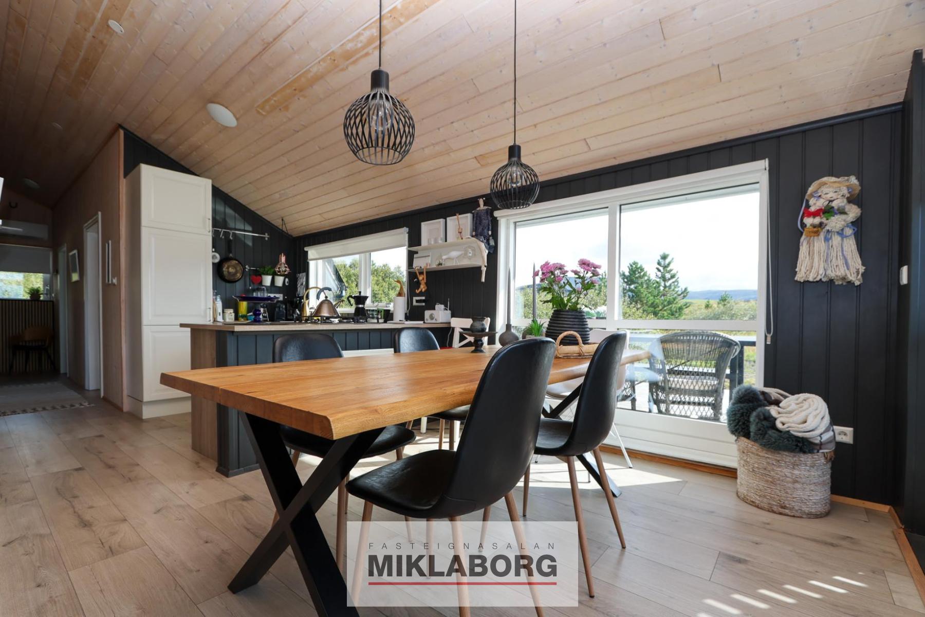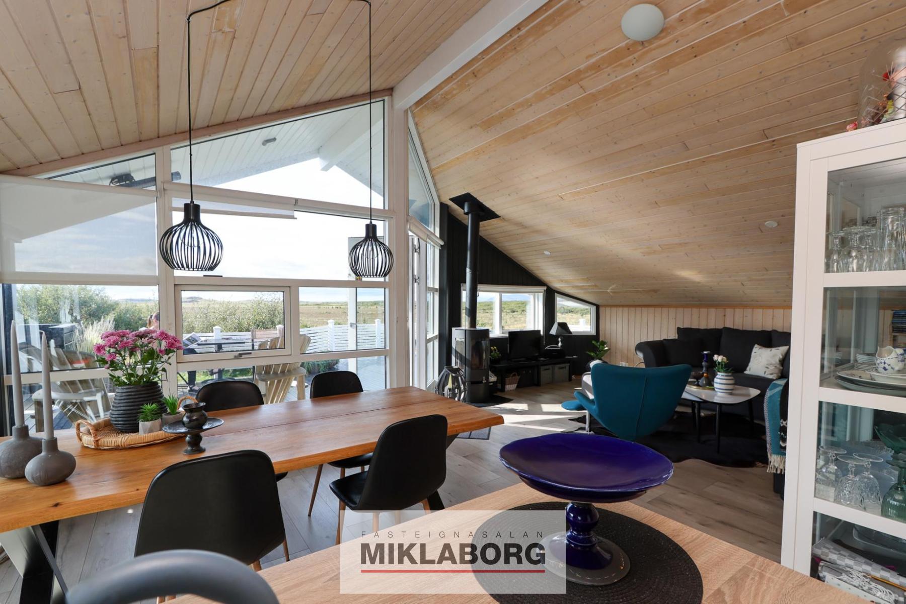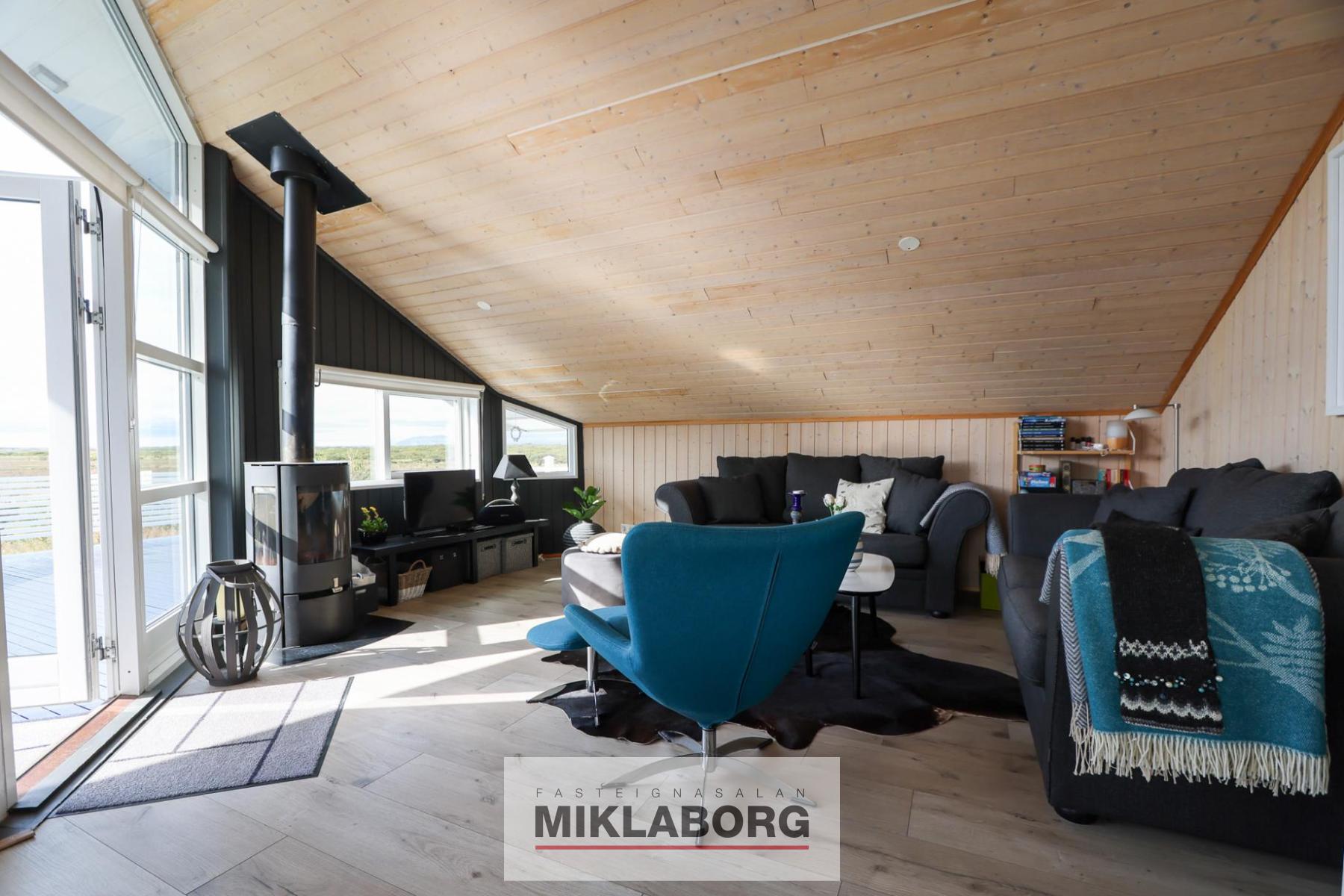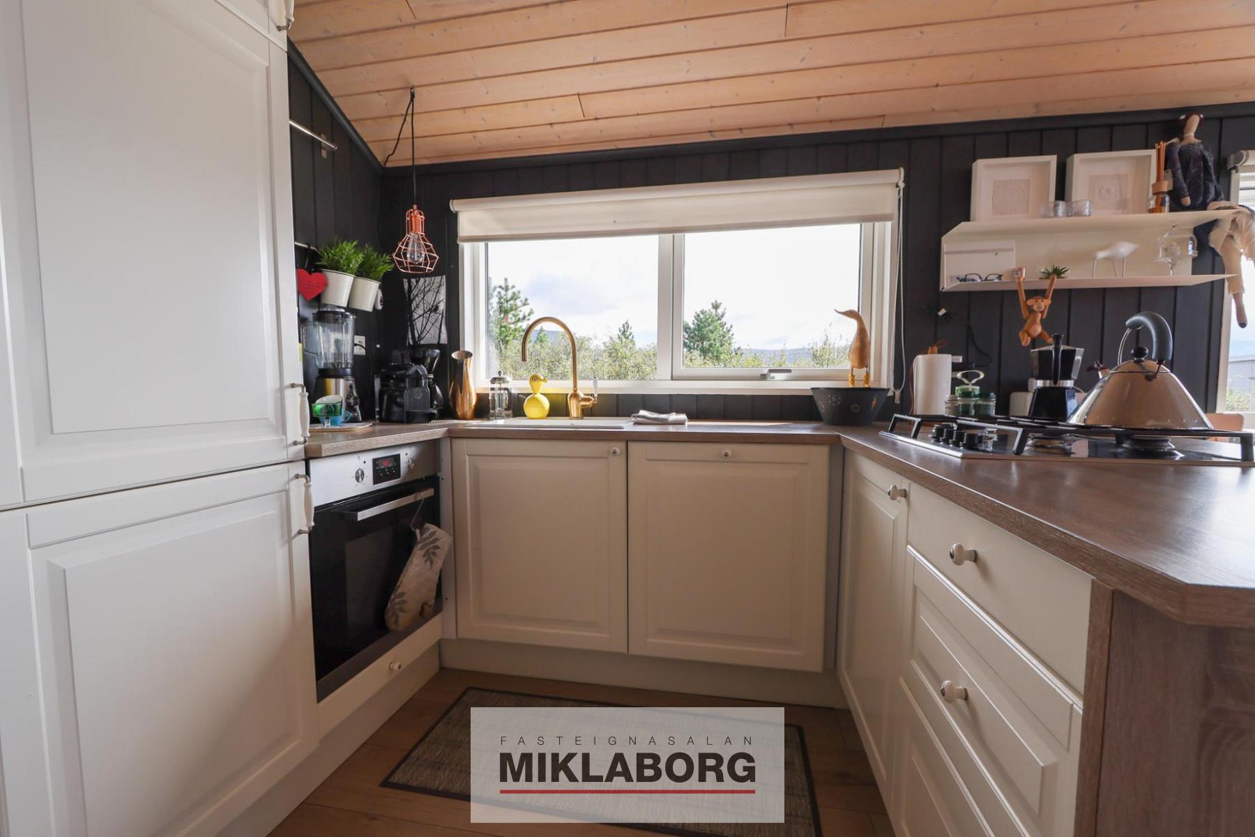 Alrými – eldhús/stofa/borðstofa: Eitt opið og bjart rými. Í eldhúsi er IKEA-innrétting, keramikhelluborð og ný uppþvottavél. Stofan er mjög rúmgóð og með notalegri kamínu fyrir vetrarkvöldin. Borðstofuhluti er fyrir framan eldhús og þaðan er útgengt út á pall.