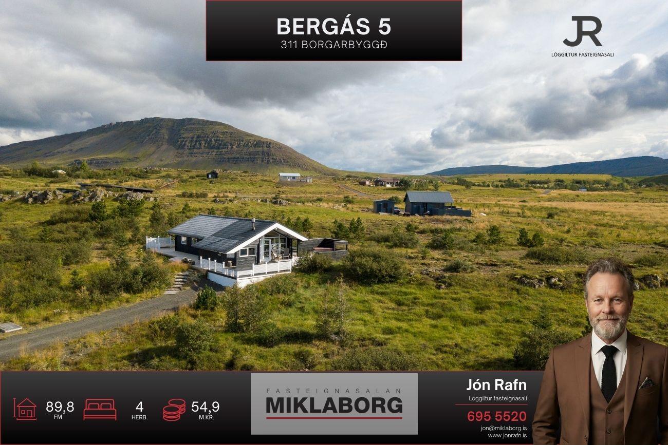 Húsið er danskt EBK-hús, svart með svörtu þaki. Pallur liggur kringum húsið og heitur pottur er í skjóli skjólveggja. Aðkoma er einföld; ekið er eftir Borgarfjarðarbraut að Fossatúni og skammt þar frá inn í lítið en gróskumikið sumarhúsasvæði. Sjá má staðsetningu hússins hér https://ja.is/kort/?x=376519&y=457651&nz=12.95&type=aerial&page=1&q=berg%C3%A1s%205