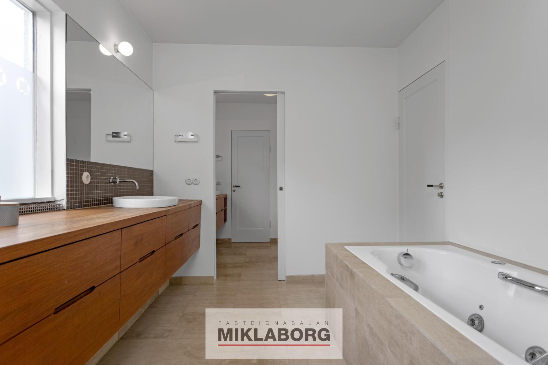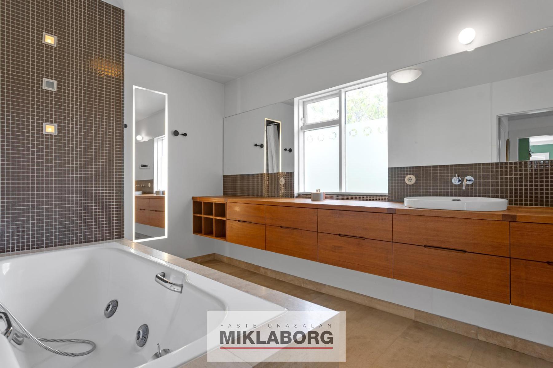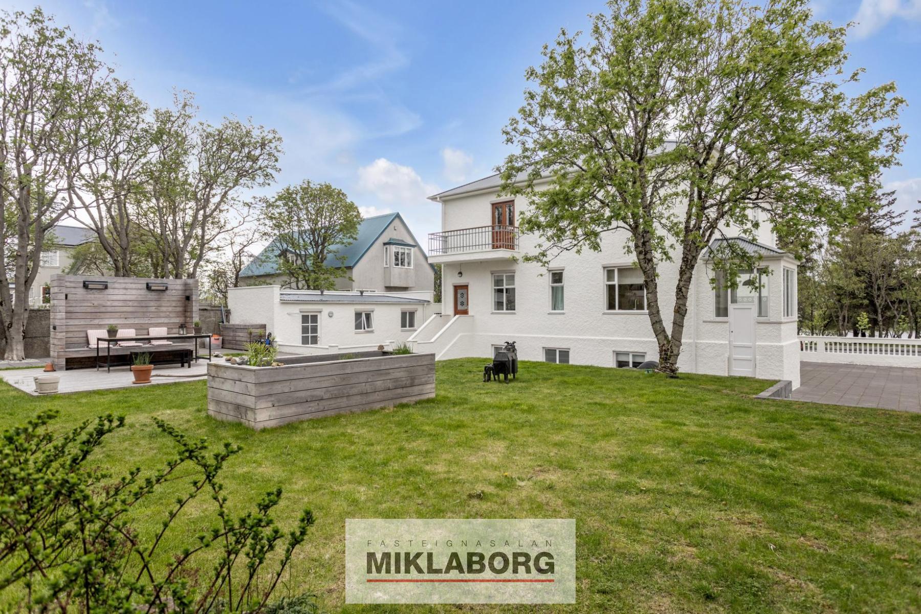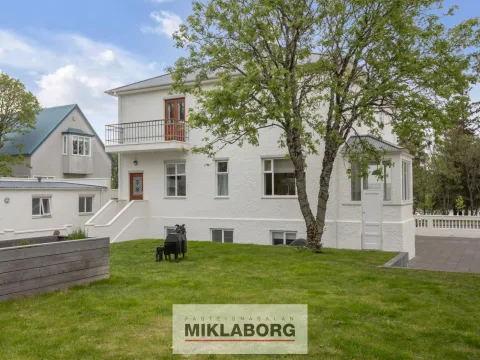 Nánari lýsing: Komið er inn í forstofu og til hliðar eru stórar og bjartar stofur með mikilli lofthæð. Eldhús er opið við stofur og er glæsilegt með eldunareyju. Útgengt er úr eldhúsi í stóran skjólgóðan suðurgarð. Til hliðar við eldhús og á móti stofum er baðherbergi með sturtu. Á efstu hæð hússins eru tvö mjög stór svefnherbergi ásamt öðru minna. Stórt baðherbergi er á hæðinni ásamt þvottaherbergi. Fallegar suð-vestur svalir snúa að bakgarði. Á rislofti eru geymslur. Á jarðhæðinni er rúmlega 120 m2 íbúð með sérinngangi og þar eru í dag 2 stór svefnherbergi, stór stofa, baðherbergi, eldhús og geymsla. Hægt er að opna á milli hæðanna en það var áður opið á milli þeirra. Í dag er þessi íbúð í leigu. Bílskúr hefur verið breytt í stúdío-íbúð sem er í leigu. Glæsilegur garður er umhverfis húsið. Húsið hefur nýlega verið málað að utan. Eignin er öll nýendurnýjuð hið ytra auk þess sem skipt hefur verið um klóak- og drenlagnir og öll inntök í húsið eru nýleg. Eins hafa raflagnir verið endurnýjaðar og hluti neysluvatnslagna auk þess sem tölvulagnir hafa verið dregnar í allt húsið. Bæði ljósleiðari og ljósnet eru komin inn í húsið.