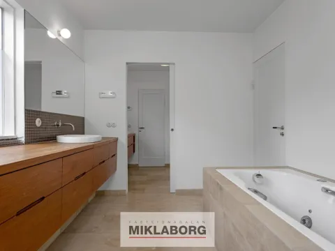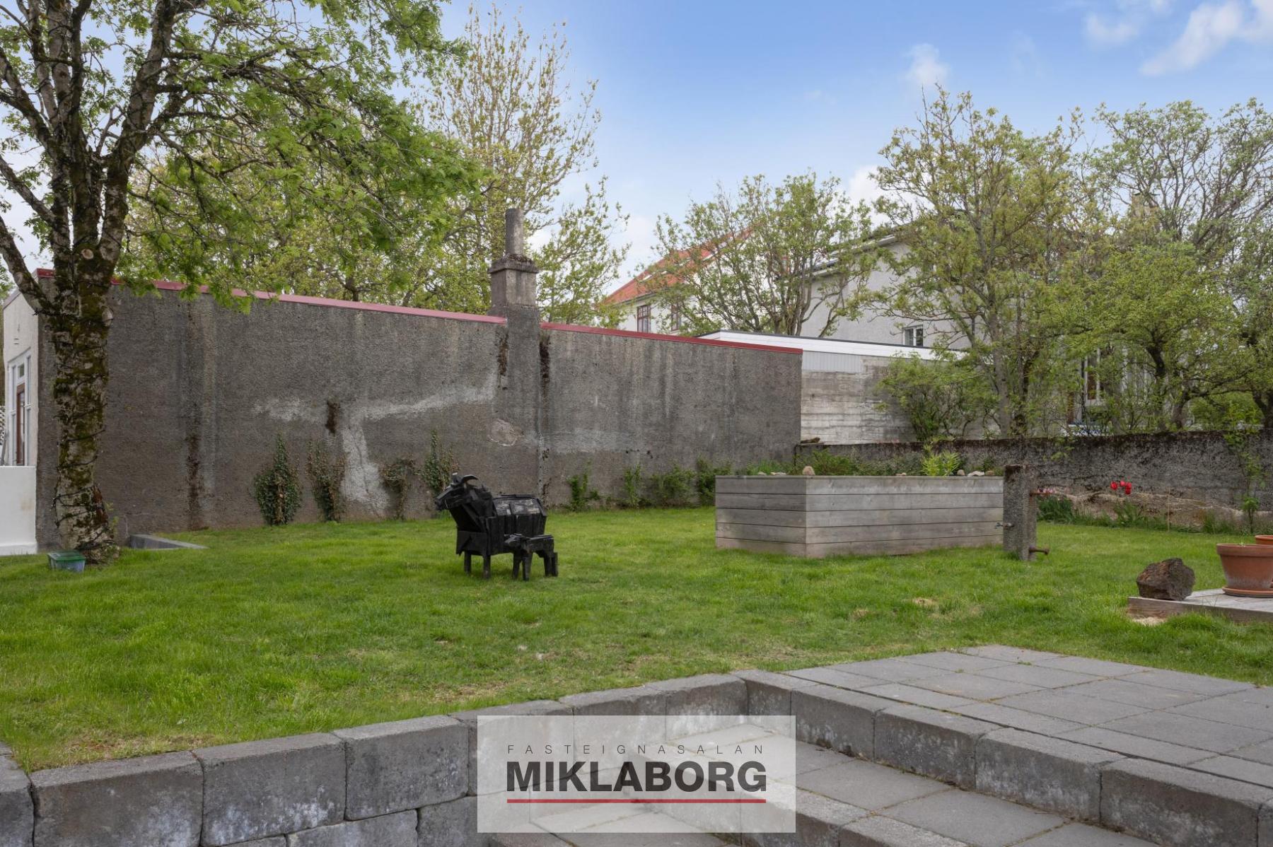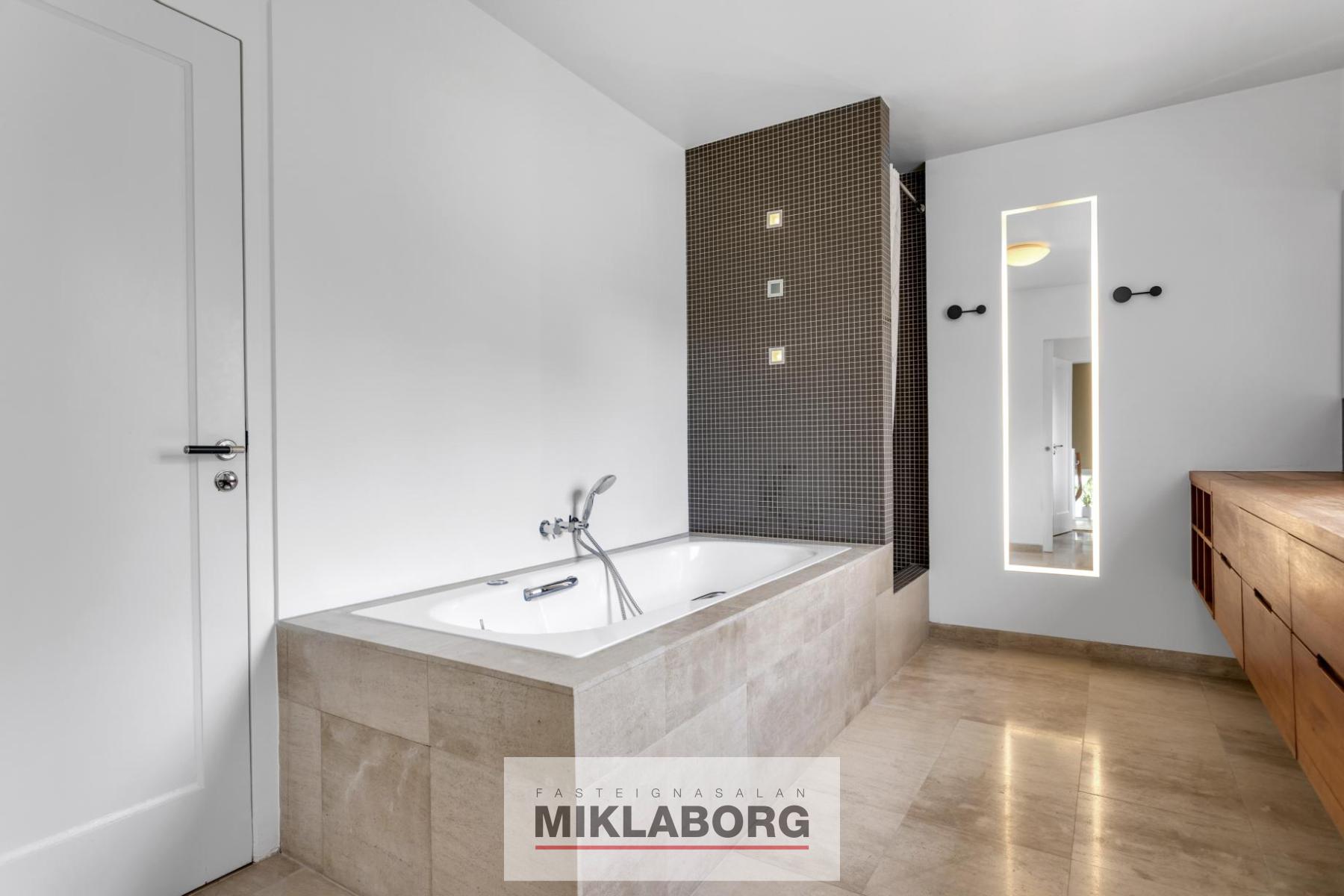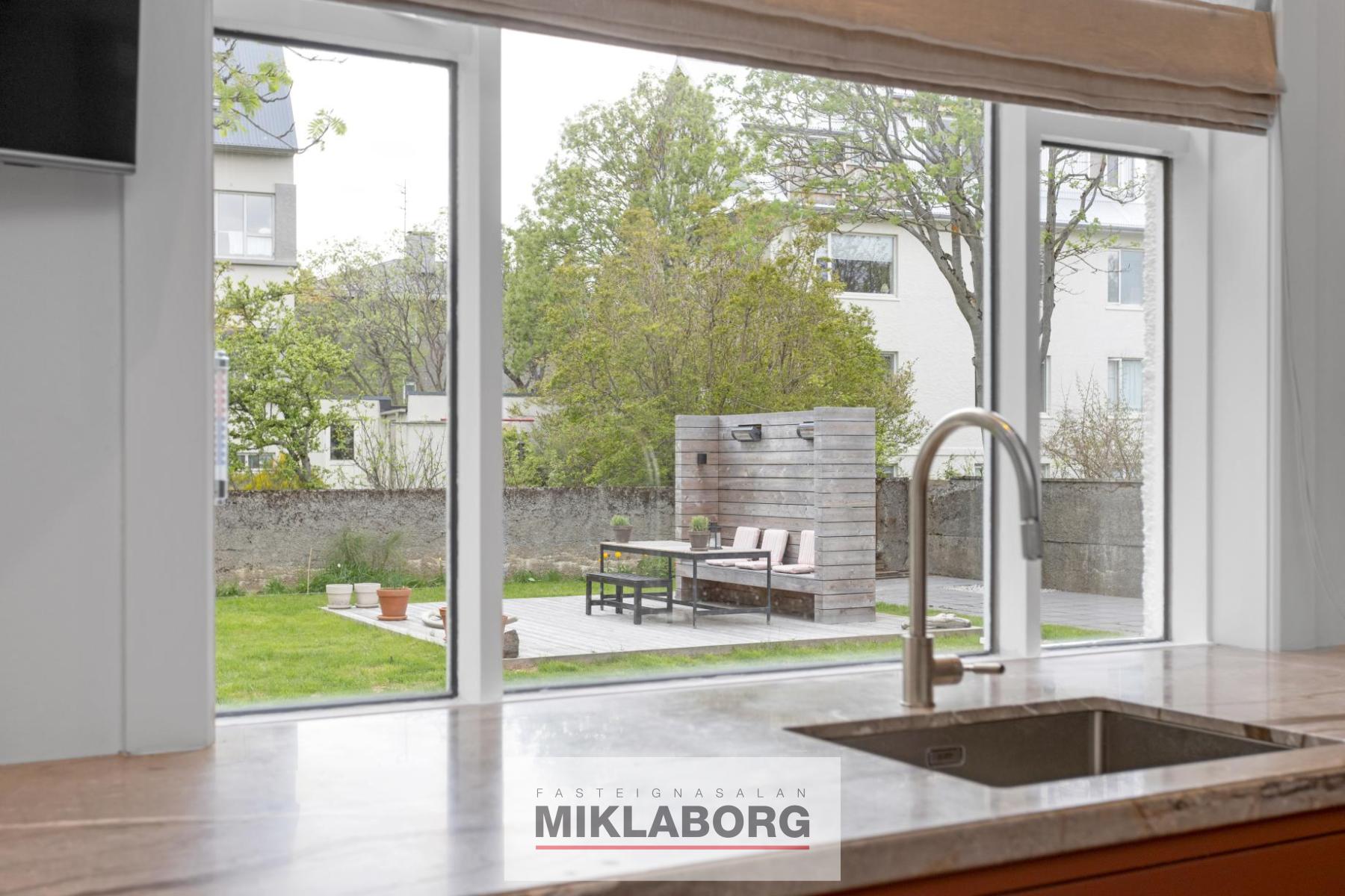 Nánari lýsing: Komið er inn í forstofu og til hliðar eru stórar og bjartar stofur með mikilli lofthæð. Eldhús er opið við stofur og er glæsilegt með eldunareyju. Útgengt er úr eldhúsi í stóran skjólgóðan suðurgarð. Til hliðar við eldhús og á móti stofum er baðherbergi með sturtu. Á efstu hæð hússins eru tvö mjög stór svefnherbergi ásamt öðru minna. Stórt baðherbergi er á hæðinni ásamt þvottaherbergi. Fallegar suð-vestur svalir snúa að bakgarði. Á rislofti eru geymslur. Á jarðhæðinni er rúmlega 120 m2 íbúð með sérinngangi og þar eru í dag 2 stór svefnherbergi, stór stofa, baðherbergi, eldhús og geymsla. Hægt er að opna á milli hæðanna en það var áður opið á milli þeirra. Í dag er þessi íbúð í leigu. Bílskúr hefur verið breytt í stúdío-íbúð sem er í leigu. Glæsilegur garður er umhverfis húsið. Húsið hefur nýlega verið málað að utan. Eignin er öll nýendurnýjuð hið ytra auk þess sem skipt hefur verið um klóak- og drenlagnir og öll inntök í húsið eru nýleg. Eins hafa raflagnir verið endurnýjaðar og hluti neysluvatnslagna auk þess sem tölvulagnir hafa verið dregnar í allt húsið. Bæði ljósleiðari og ljósnet eru komin inn í húsið.