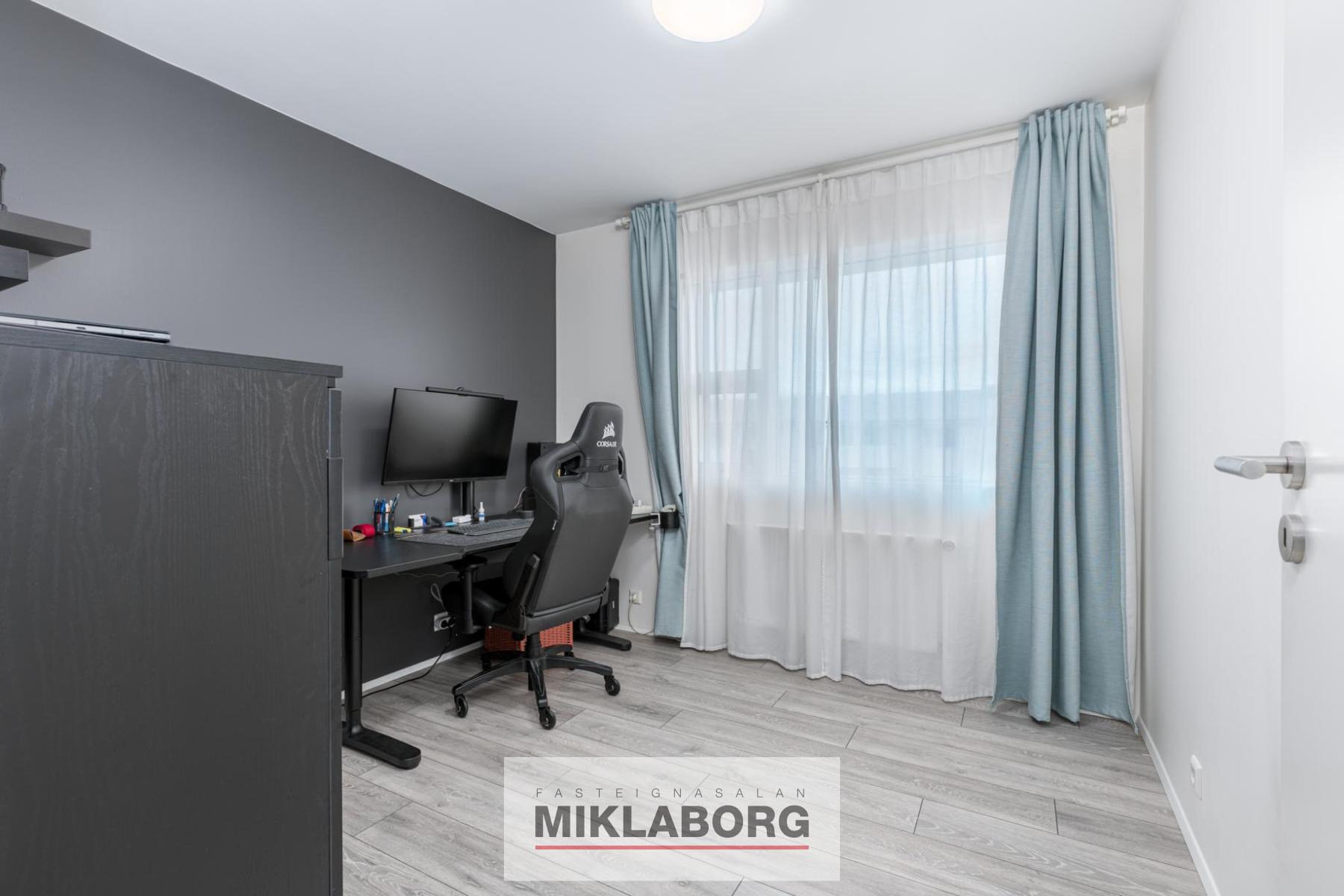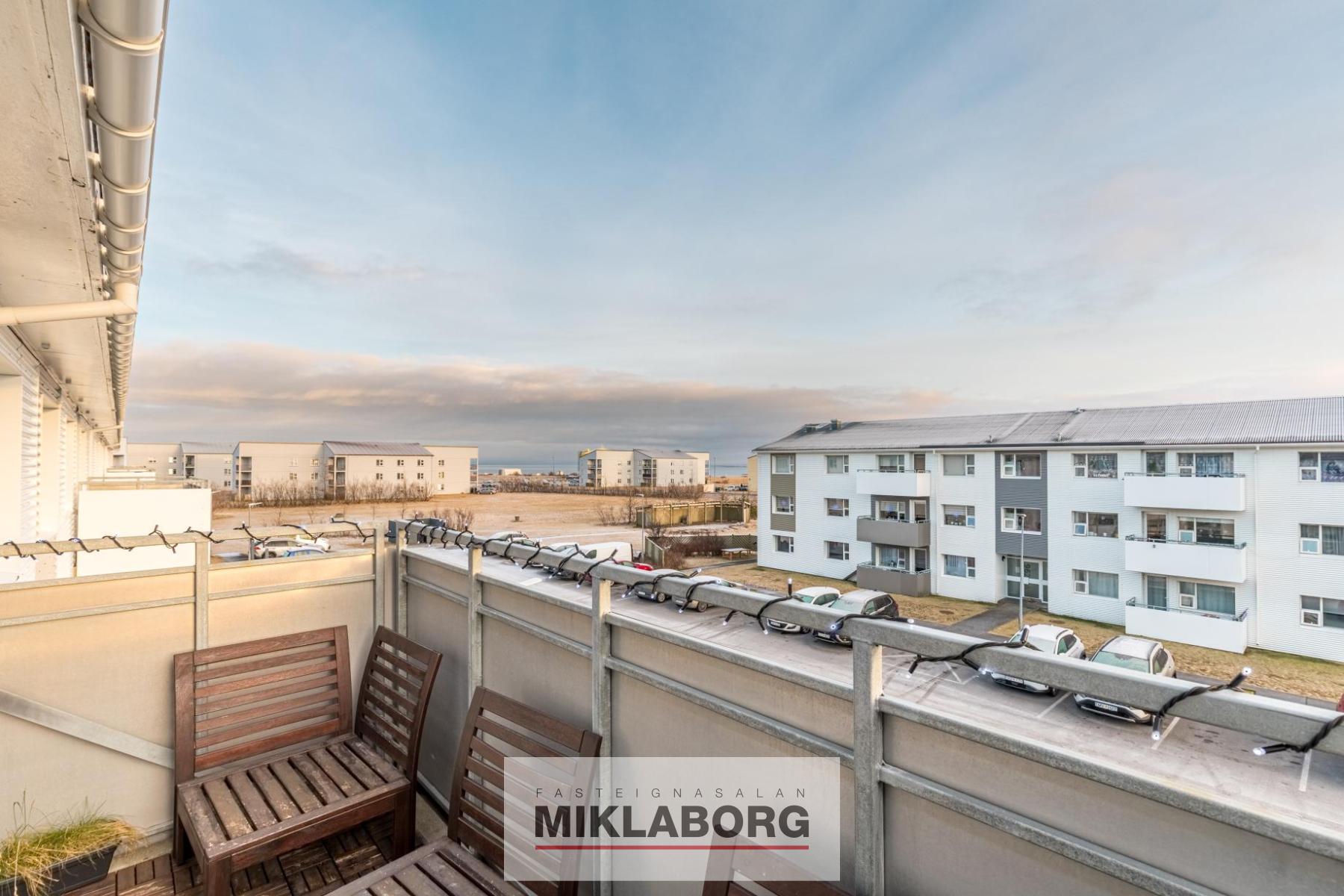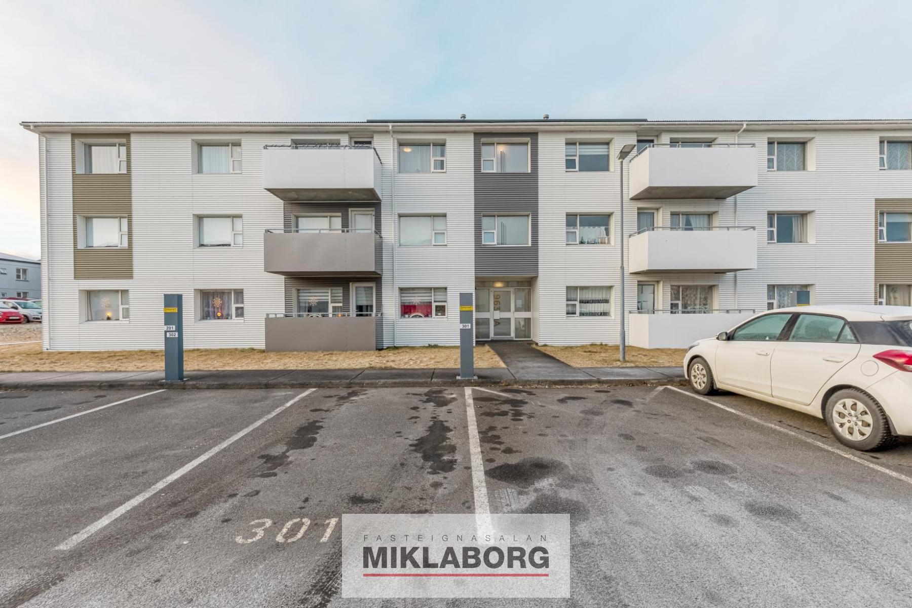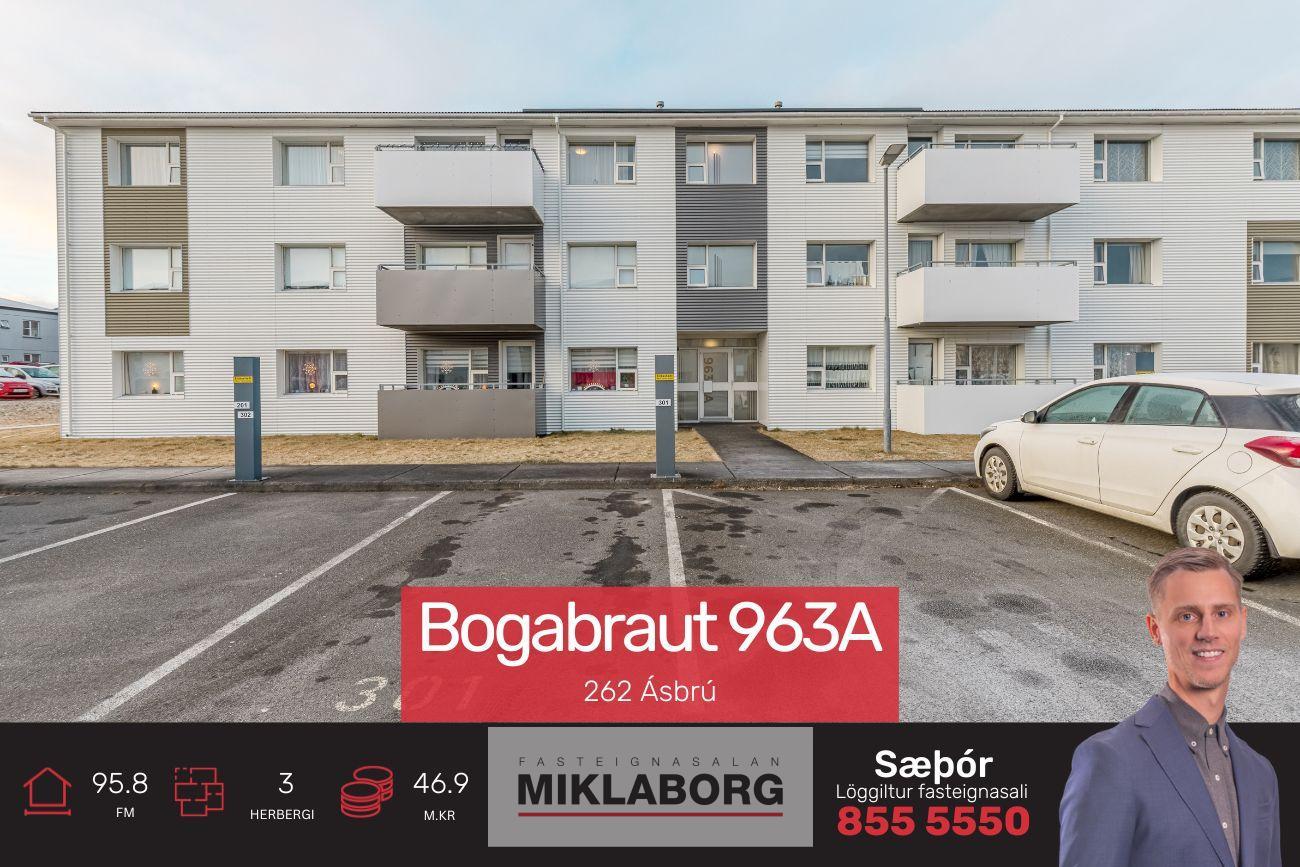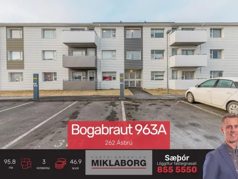 Bjarta, rúmgóða og vel skipulagða þriggja herbergja á 3. og efstu hæð við Bogabraut 963A, 262 Reykjanesbæ. Íbúðin og húsið allt var mikið endurnýjað árið 2019. Merkt bílastæði og uppsettir staurar fyrir rafmagnshleðslu.