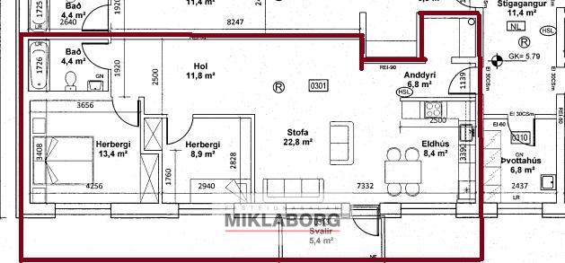 Íbúðin er merkt 301 og er skráð stærð hennar 92,2fm henni fylgir 3,6fm merkt geymsla. Samtals stærð 95.8fm