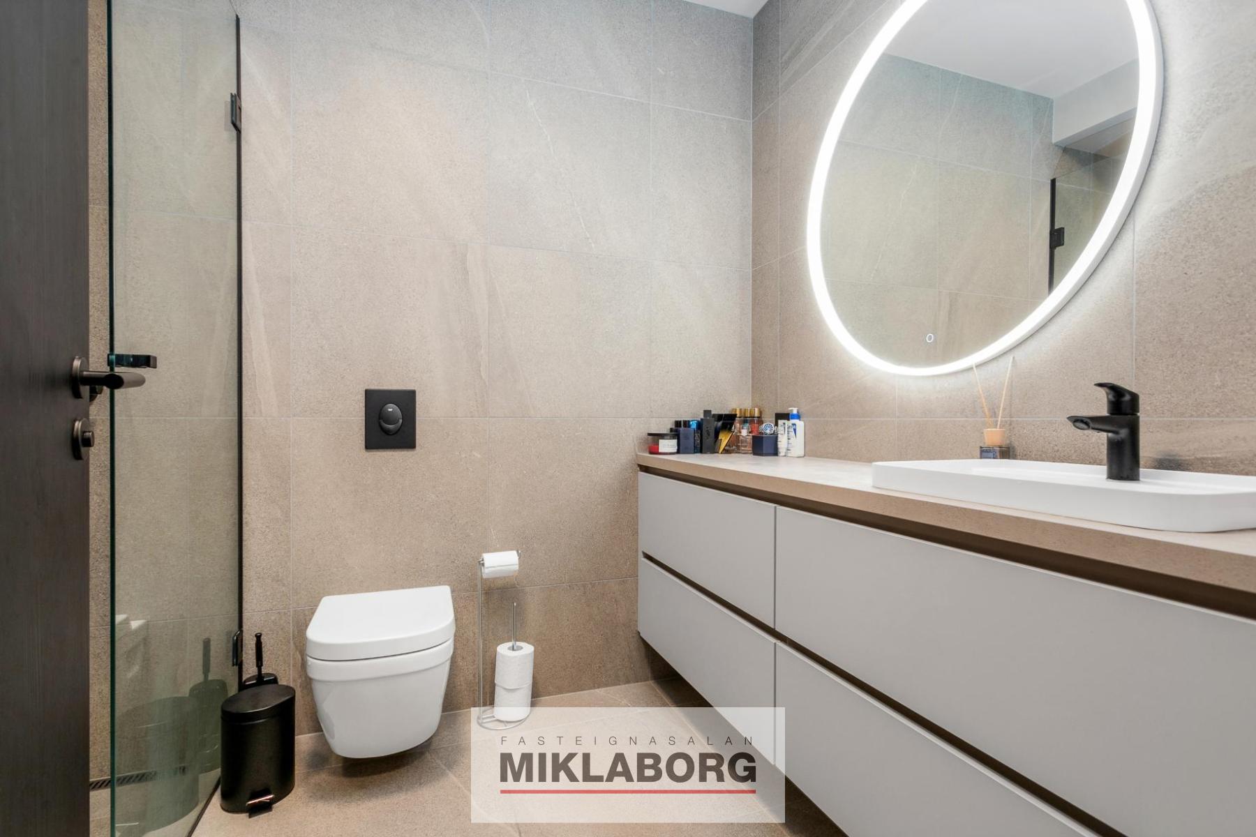Baðherbergi er með sturtu, fallegri innréttingu með hringlaga upplýstum spegli fyrir ofan innréttingu. Tengi fyrir þvottavél og þurrkara inná baðherbergi. Ljós gráar flísar á gólfi og hluta að veggjum. Svört blöndunartæki í sturtu og handlaugartæki við vask.