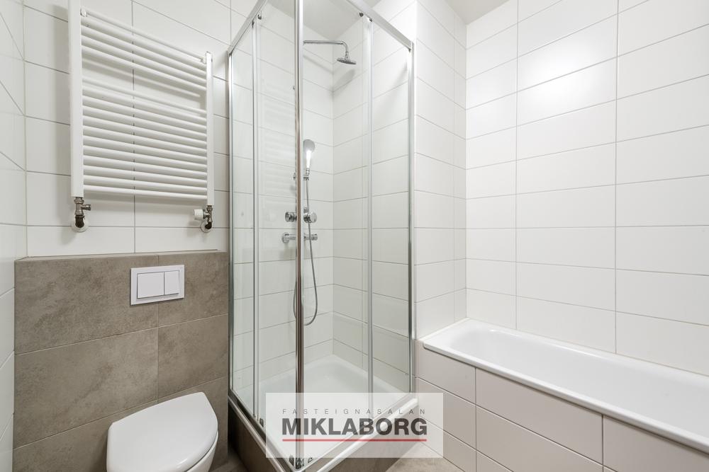 Baðherbergi er flísalagt með rúmgóðri sturtu og baðkari.