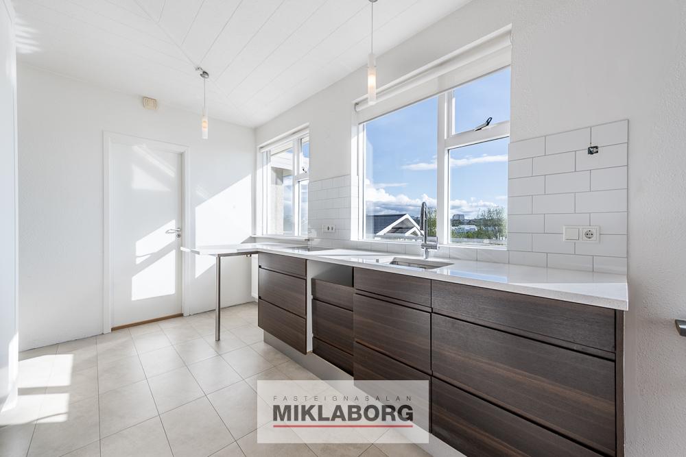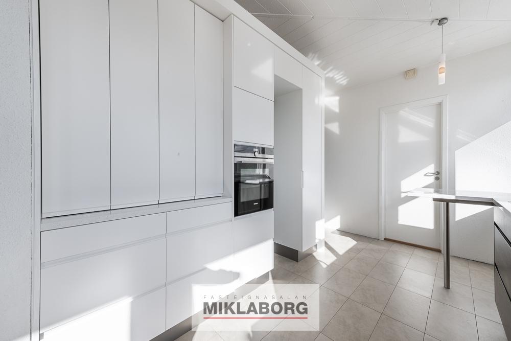 Rúmgott nýlegt eldhús með góðu skápaplássi ásamt eyju. Flísar eru á gólfum og granítt á borðum, góð lofthæð.