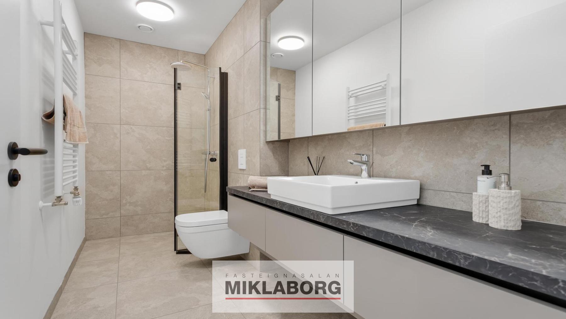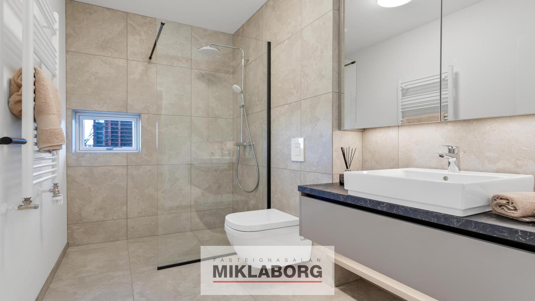 Baðherbergi: Tvö baðherbergi með flísum á gólfi og veggjum að hluta. Sturtur í báðum baðherbergjum með Unidrain línurist og sturtugleri. Vegghengd salernisskál frá GROHE m. mjúklokandi setu. Öll blöndunartæki ásamt handlaug sem situr ofan á borðplötu frá GROHE.