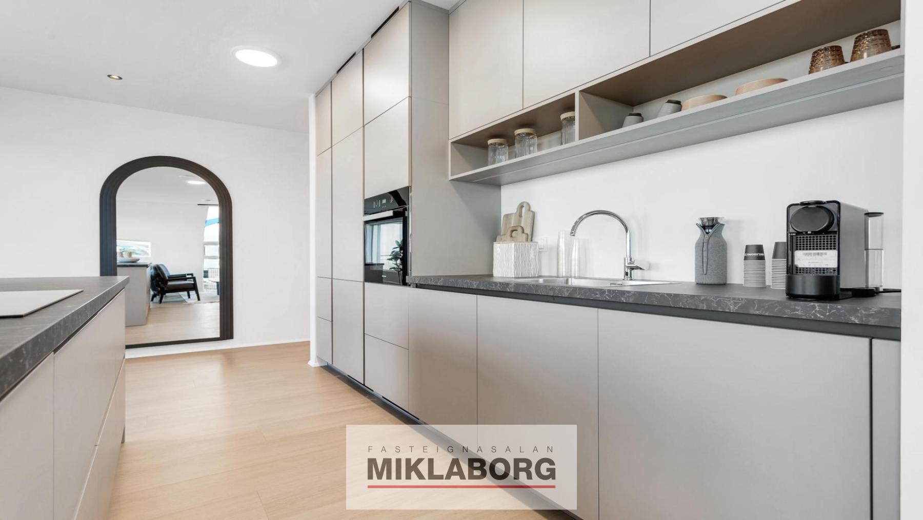 Eldhús: er opið og tengist við stofu. Falleg sérsmiðuð innrétting. Eldhús skilast með veggofni og span-helluborði. Tæki eru frá Miele.