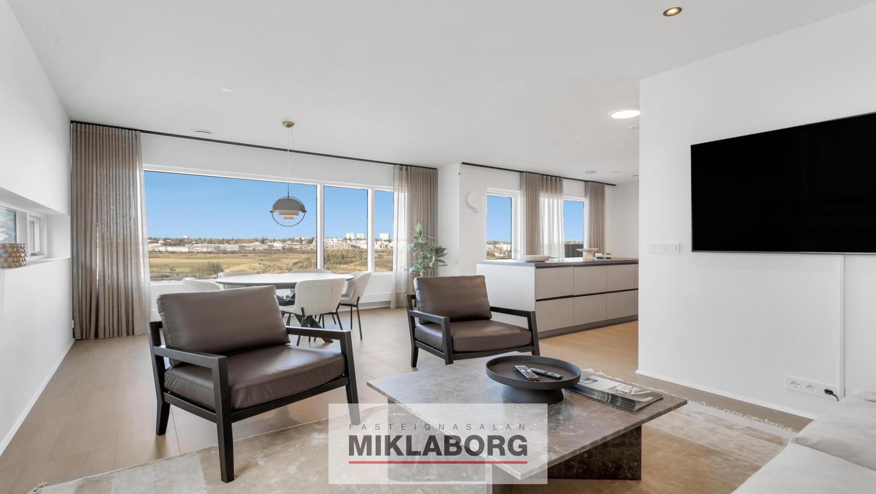 Íbúð 101 er 4ra herbergja vel skipulögð íbúð á 1.hæð með víðáttumiklu útsýni og bílastæði í bílakjallara. Hlýlegt heimili með sérsmíðuðum Voké-III innréttingum, baðherberbergjum og gólfi í þvottahúsi. Miele eldhústæki fylgja (ofn, span-helluborð). GROHE tæki eru á baði og í eldhúsi. Stílhrein hönnun og vönduð gæði. Íbúðin er með vélrænni loftræstingu. Litaþema íbúðar er Grásteinn. Íbúðin afhendist fullbúin án megin gólfefna.