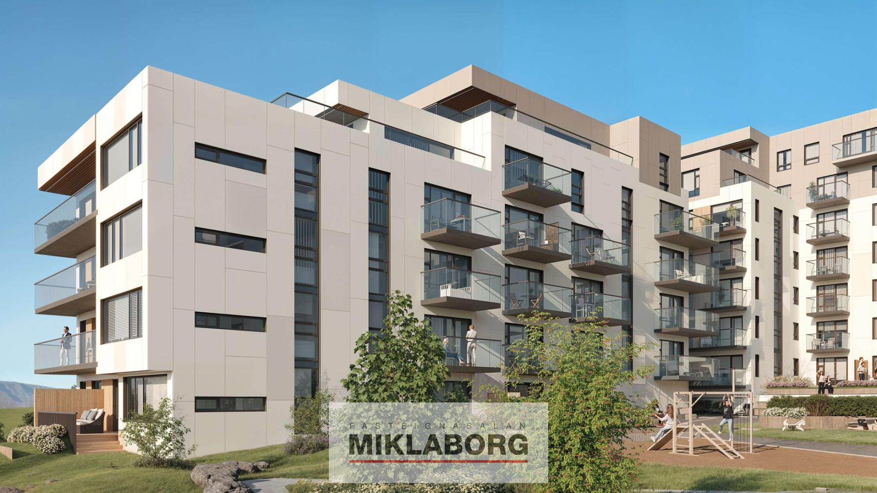 Miklaborg kynnir: Íbúð 201 er 4ra herbergja vel skipulögð íbúð á 2. hæð með víðáttumiklu útsýni og bílastæði í bílakjallara. Hlýlegt heimili með sérsmíðuðum Voké-III innréttingum, flísalögðu anddyri, baðherberbergjum og gólfi í þvottahúsi. Miele eldhústæki fylgja (ofn, span-helluborð). GROHE tæki eru á baði og í eldhúsi. Stílhrein hönnun og vönduð gæði. Íbúðin er með vélrænni loftræstingu. Litaþema íbúðar er Snjór. Íbúðin afhendist fullbúin án megin gólfefna.