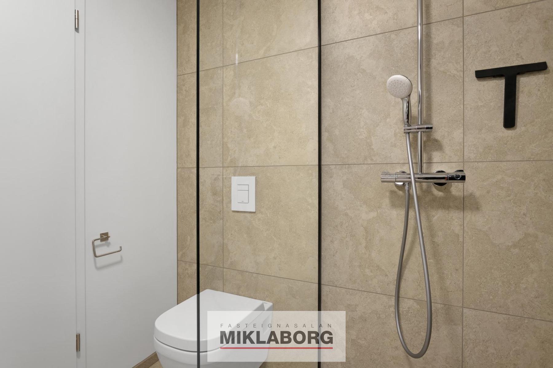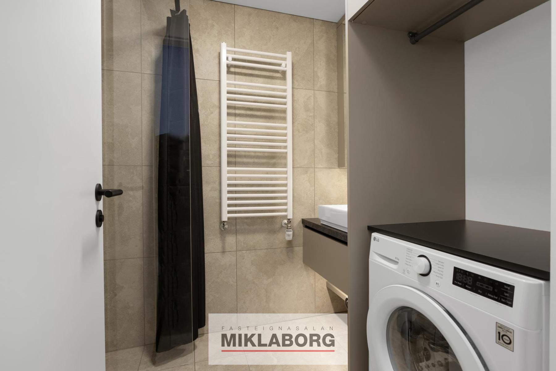 Baðherbergi: Baðherbergi er með flísum á gólfi og veggjum að hluta. Sturta með Unidrain línurist og sturtugleri. Vegghengd salernisskál frá GROHE með mjúklokandi setu. Öll blöndunartæki ásamt handlaug sem situr ofan á borðplötu frá GROHE. Skápainnrétting fyrir þvottavél og þar fyrir ofan er slá en nægt rými er fyrir þurrkara.