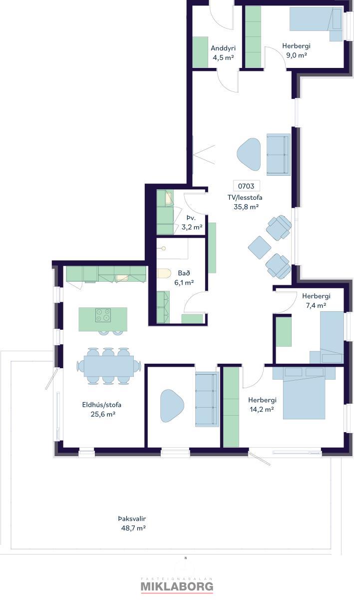 Þaksvalir: 56,1 fm þaksvalir út frá stofu og eldhúsi.