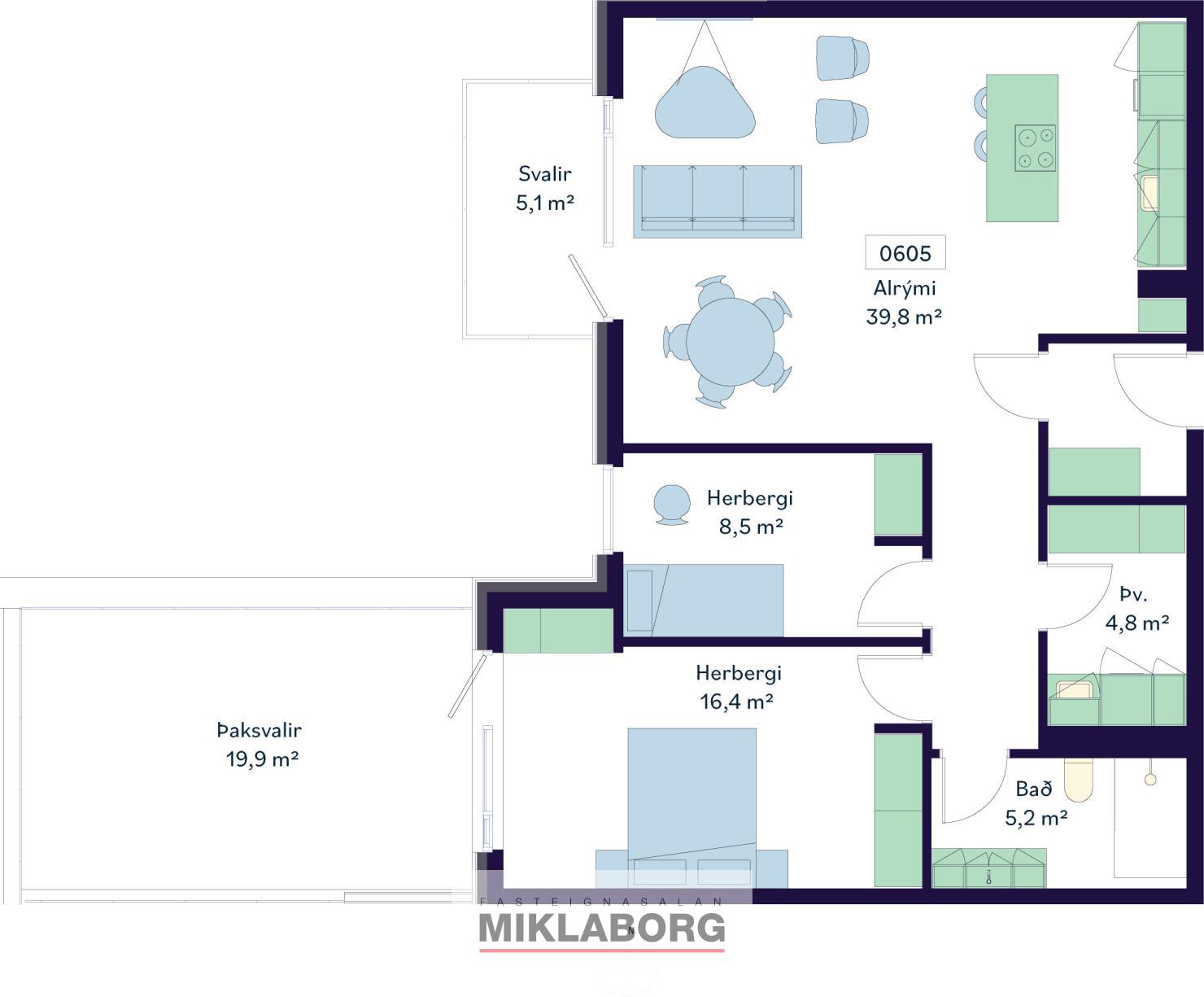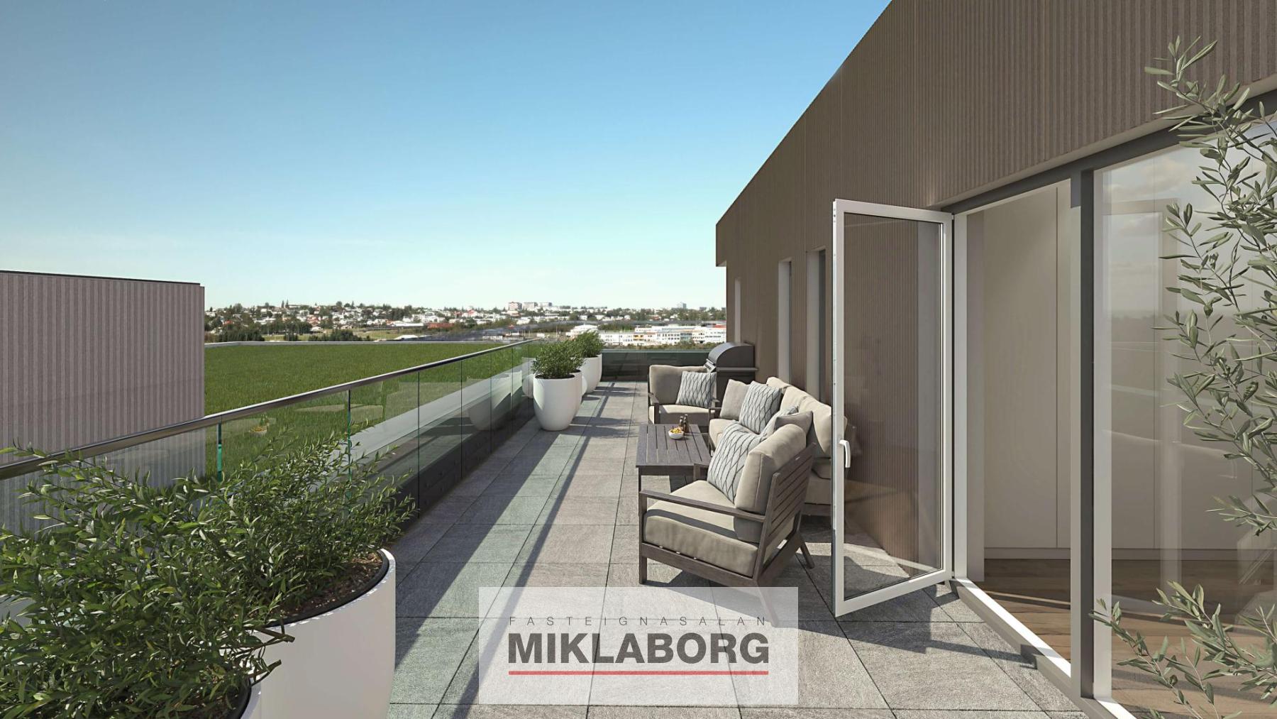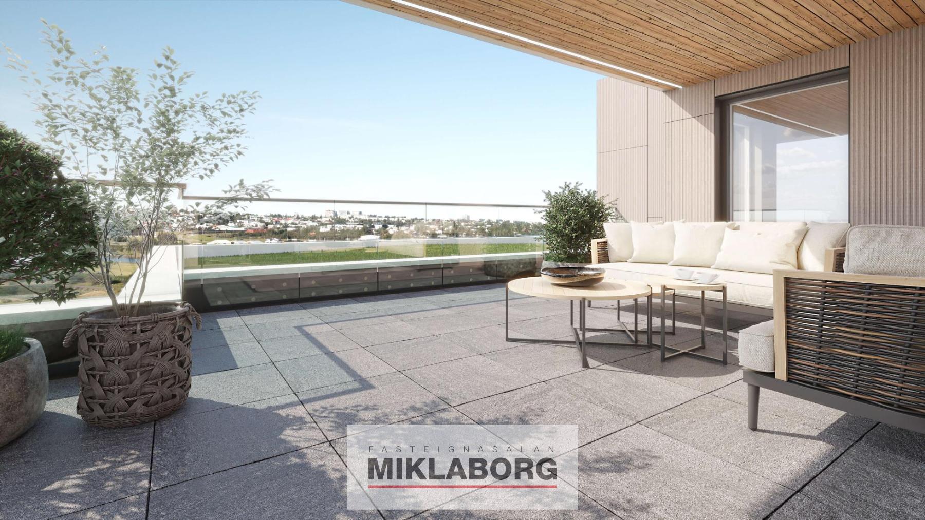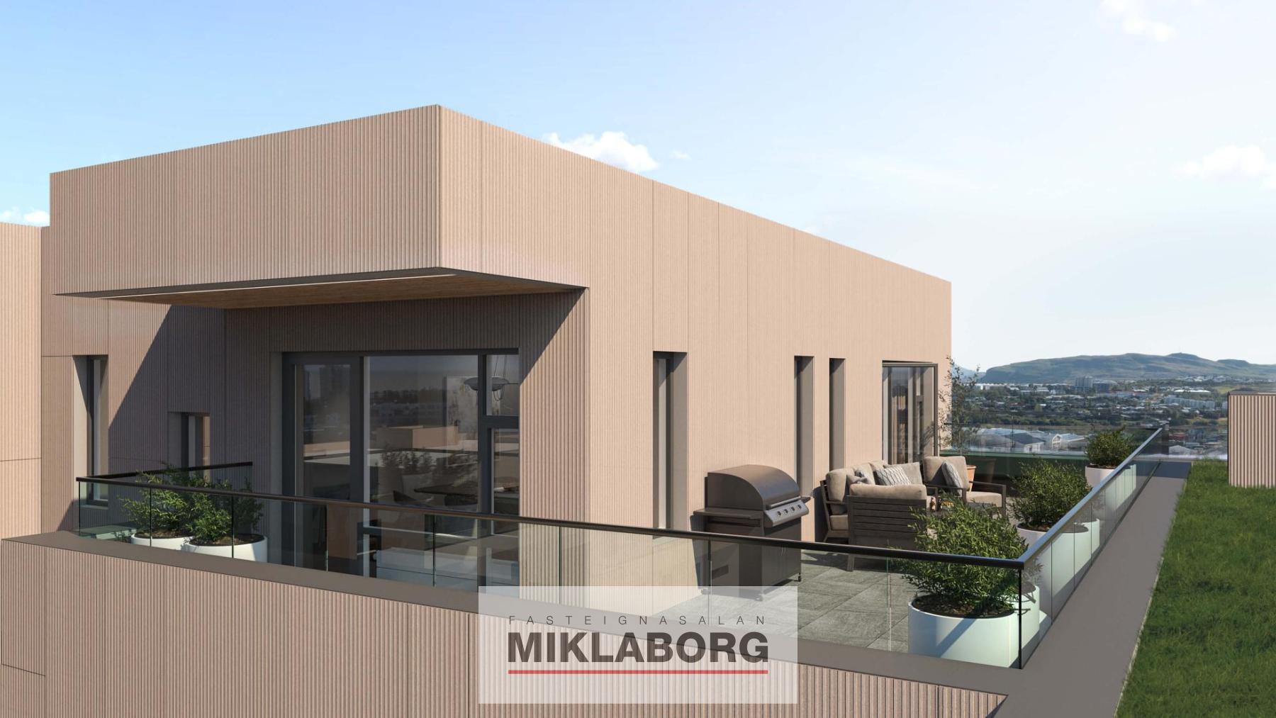 Íbúð 605 er 3ja herbergja vel skipulögð íbúð á 6. hæð með þaksvölum auk hefðbundinna svala og stæði í bílakjallara. Glæsilegt heimili með sérsmíðuðum innréttingum frá Voké-III, Quartz borðplötum, Miele tækjum og GROHE blöndunartækjum. Flísalagt baðherbergi, vélræn loftræsting og vönduð hönnun Rut Kára skapa einstaka samsetningu þæginda og gæða. Einstök eign. Litaþema Náttúru grár. Íbúðin afhendist fullbúinn án gólfefna.