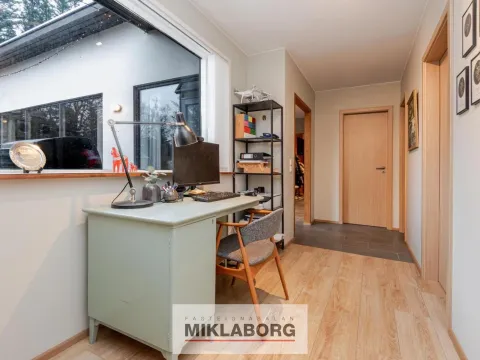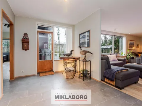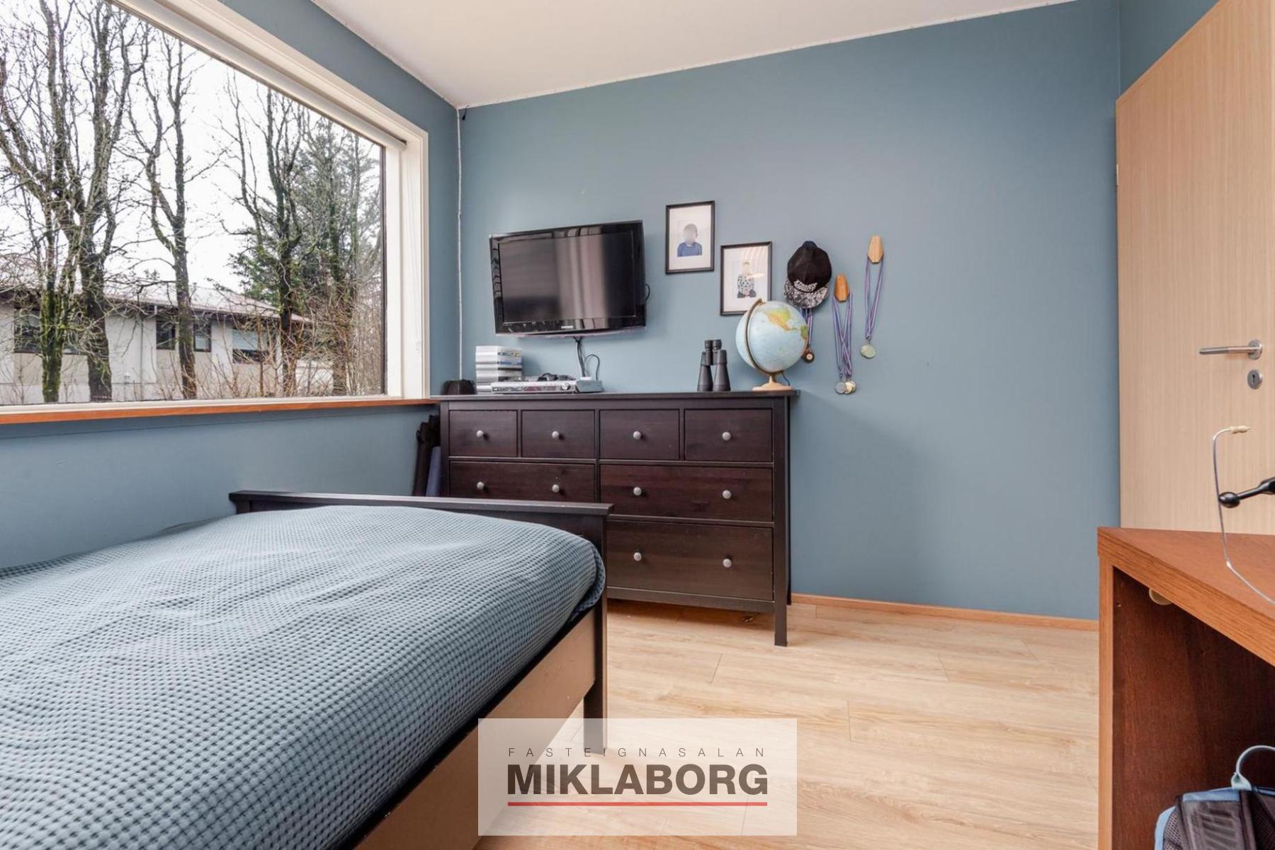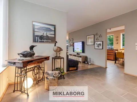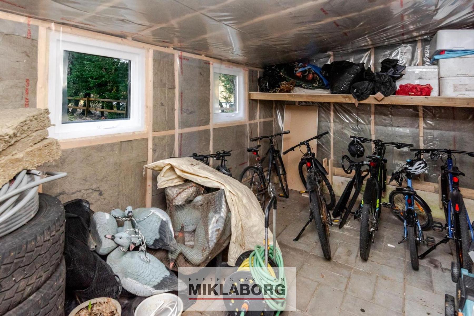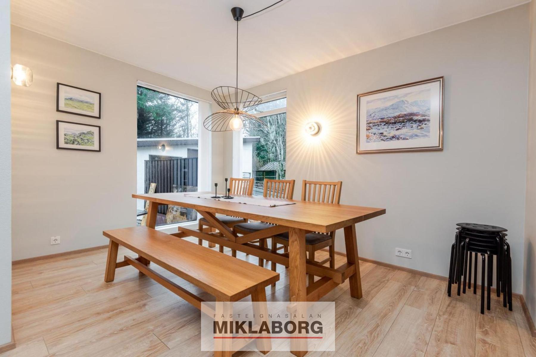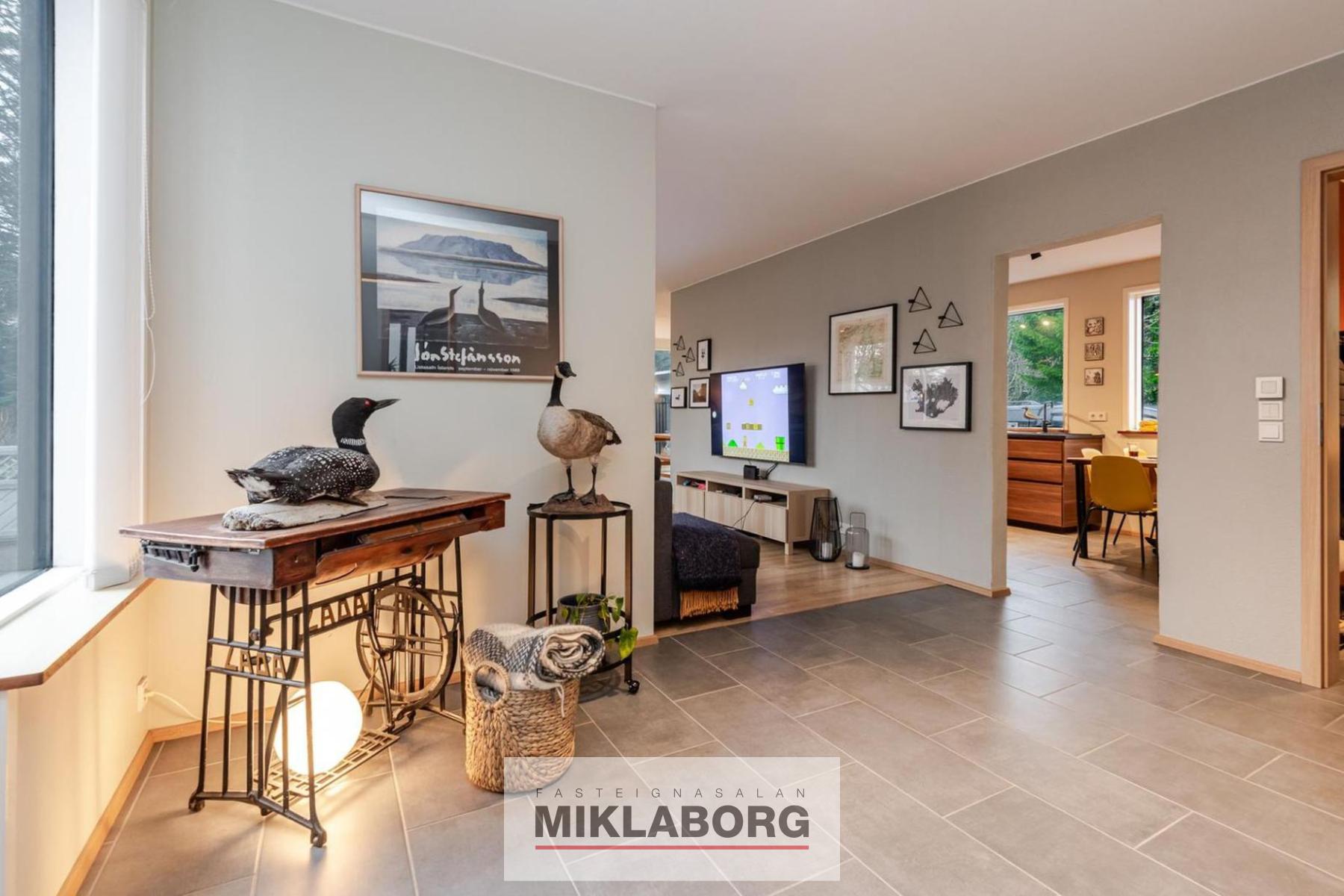 Komið er forstofu með flísum á gólfi. Eldhús með flísum á gólfi, nýlegri innréttingu úr hnotu með ofni og örbylgjuofni í vinnuhæð, innbyggðri uppþvottavél, helluborði með háf fyrir ofan. Inni í eldhúsi er pláss fyrir setkrók. Borstofa með parketi á gólfi og tveimur gólfsíðum gluggum sem skapa fallega byrtu. Stofa með parketi á gólfi og stórum glugga til suðurs út í stóran garð með palli. Arinstofa með parketi á gólfi og fallegum steyptum arni. Hol með flísum á gólfi og útgengi á góðan sólpall til suðurs. Þvottahús með flísum á gólfi hvítri innréttingu með plássi fyrir þvottavél og þurrkara í vinnuhæð og vask, útgengi er úr þvottahúsi út í garð. Baðherbergi með flísum á gólfi og veggjum að hluta, innréttingu með vask og speglaskáp, upphengt salerni, baðkar með sturtuaðstöðu. Barnaherbergin eru þrjú á herbergjagangi öll með parketi á gólfi. Hjónaherbergi er við forstofu með parketi á gólfi, góðum fataskápum og salerni. Bílskúr er tvískiptur, annarsvegar bílskúr með innkeyrslu og gönguhurð, lítlu geymslu lofti, rafmagni og heitu og köldu vatni. og svo geymsla þar sem er gönguhurð. Í garði er búið að reisa ca 25 fm sólskála á steyptum grunni.