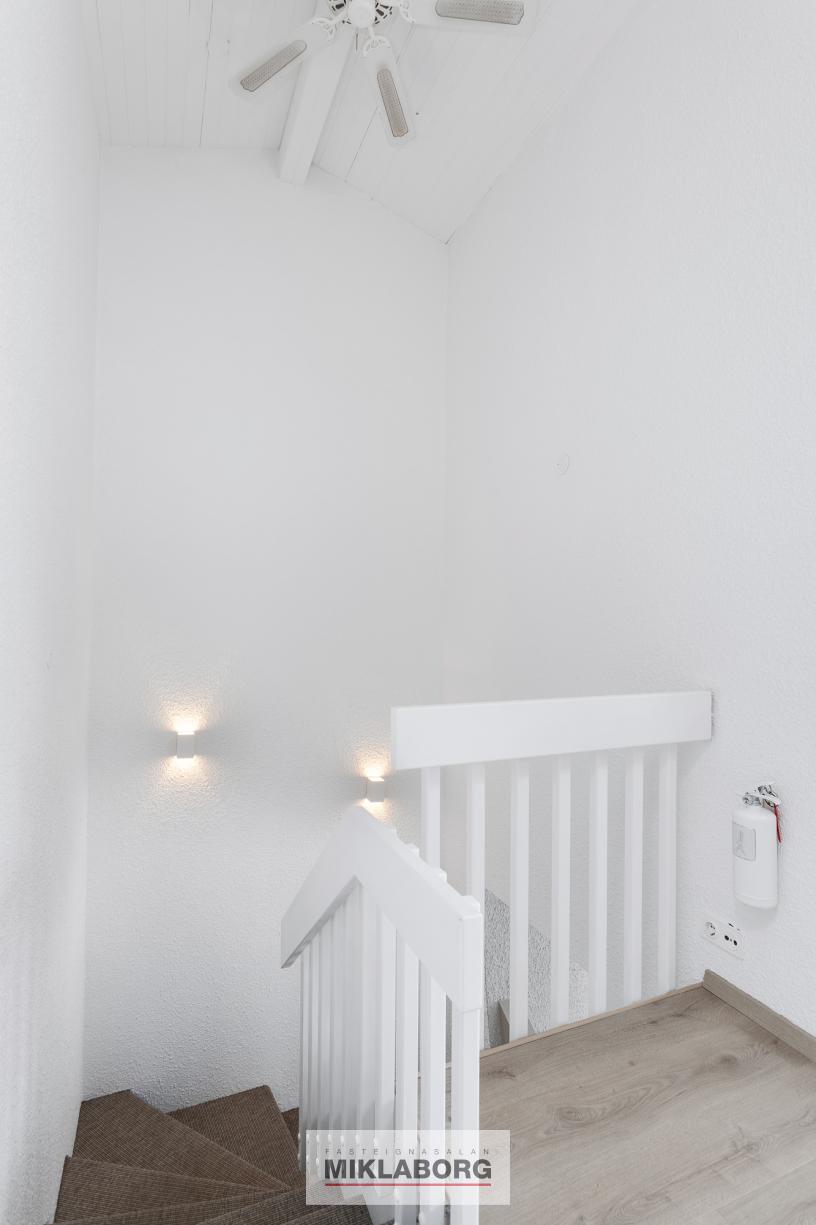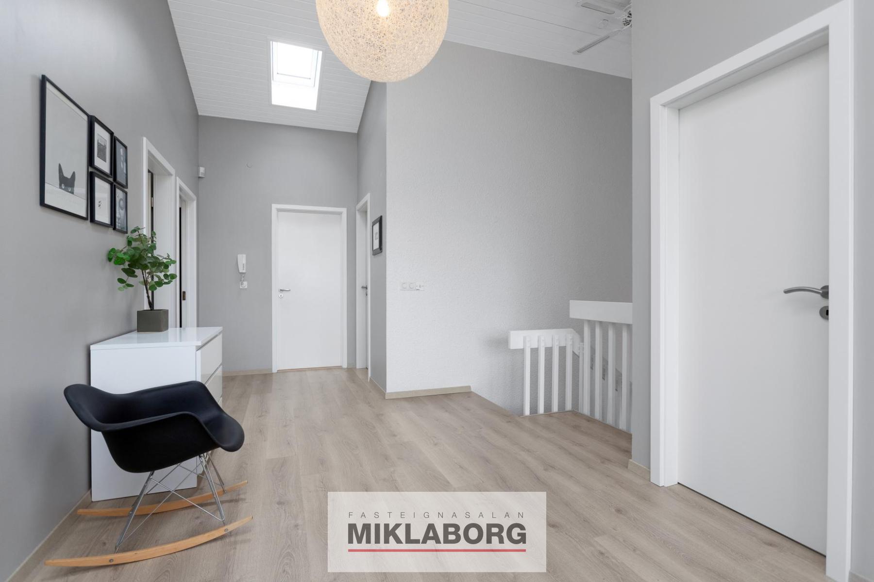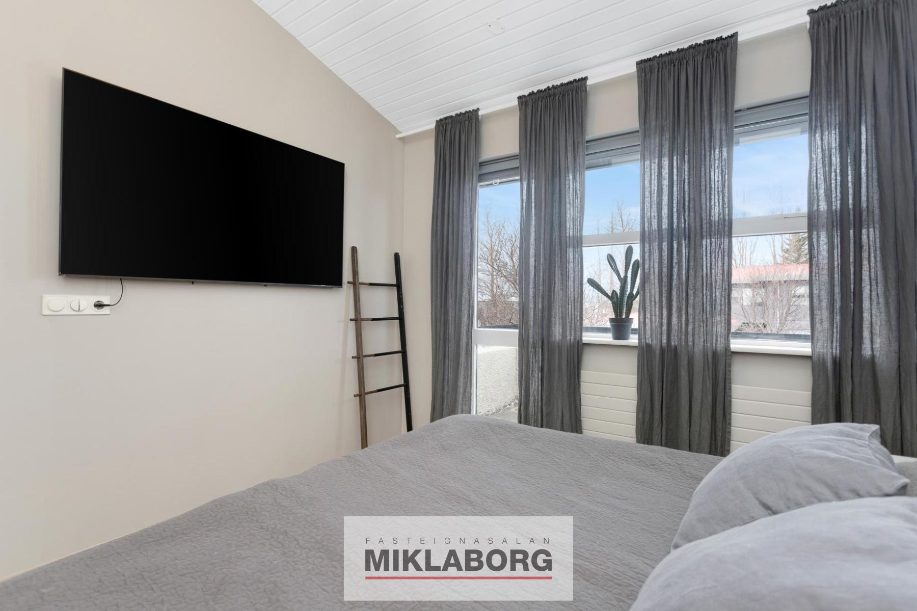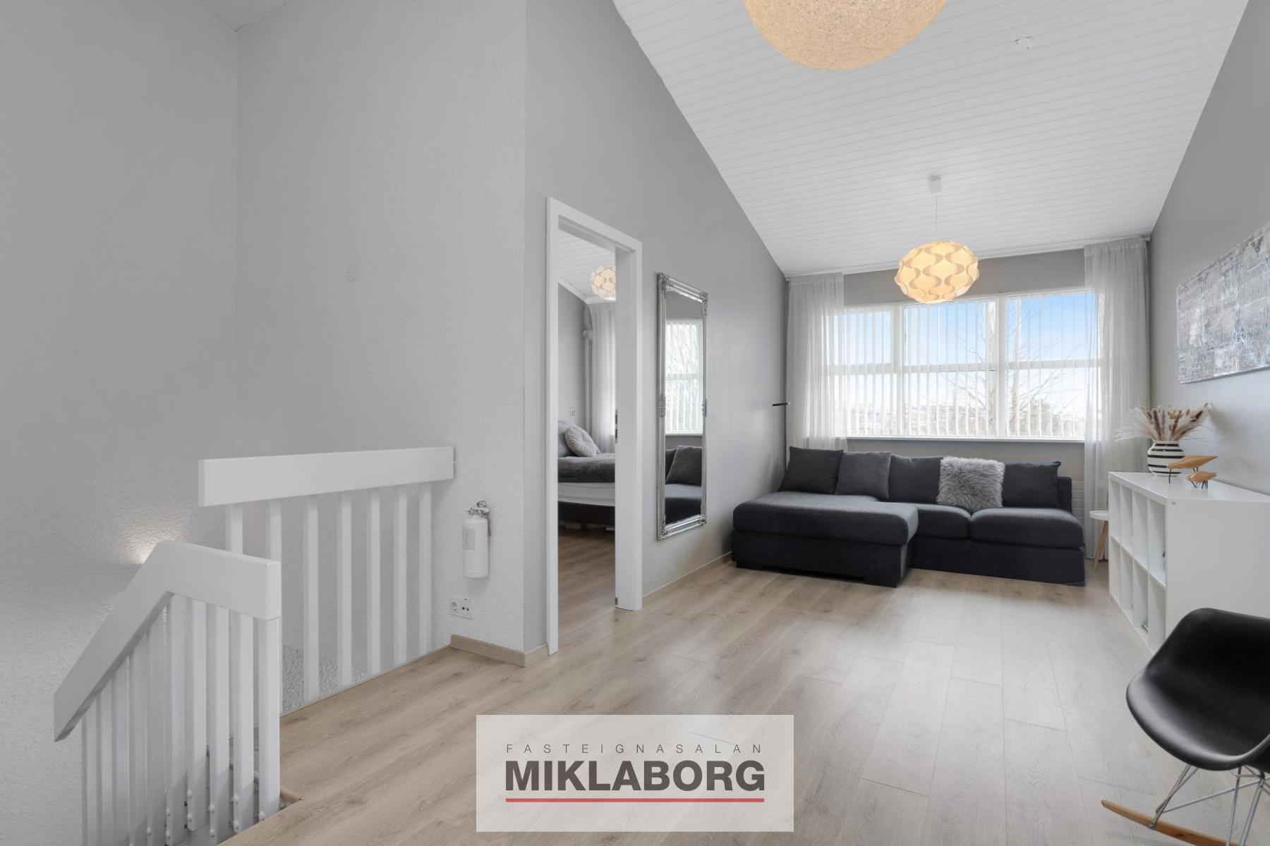Stigi með teppi liggur upp á efri hæð. Komið er upp á stigapall með rúmgóðu sjónvarpsholi, mikilli lofthæð, stórum glugga til suðurs og tveimur þakgluggum sem gefa góða birtu.