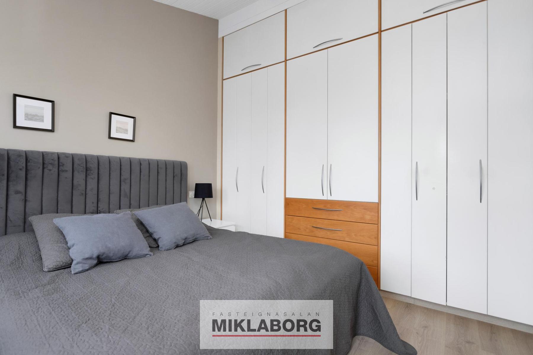 Hjónaherbergi er með stórum fataskáp og útgengt á svalir.