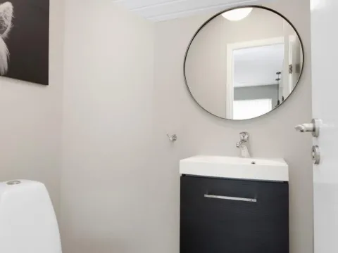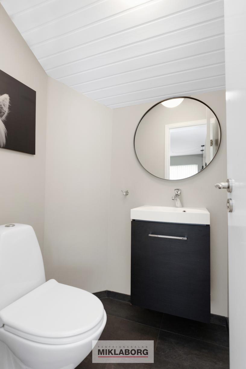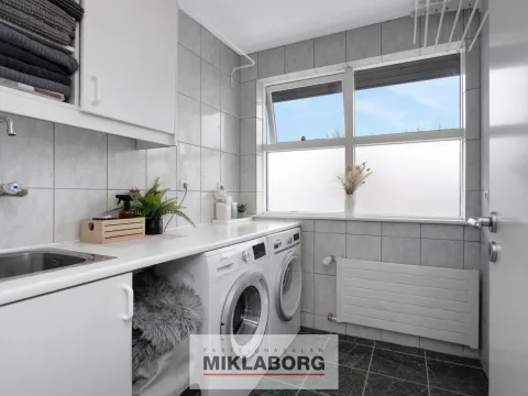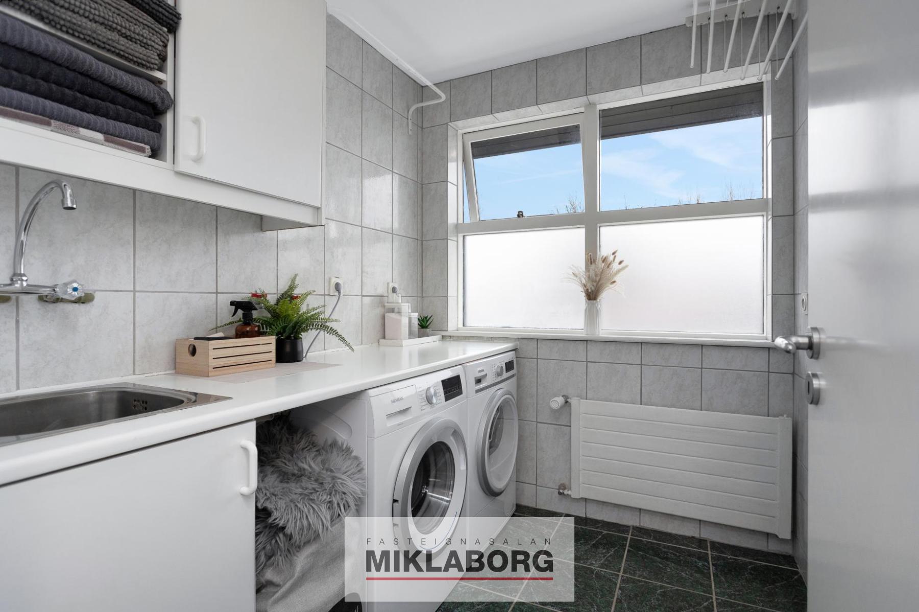 Þvottaherbergi er flísalagt með hvítri innréttingu með skolvask í borðplötu. Opnalegur gluggi.