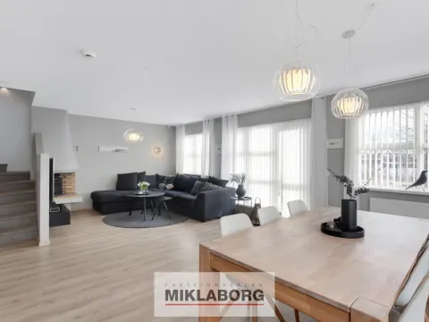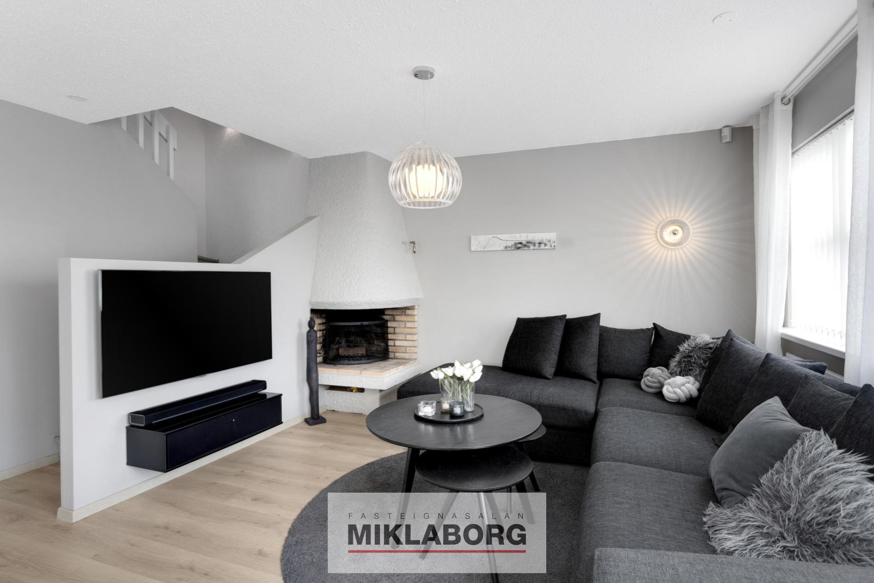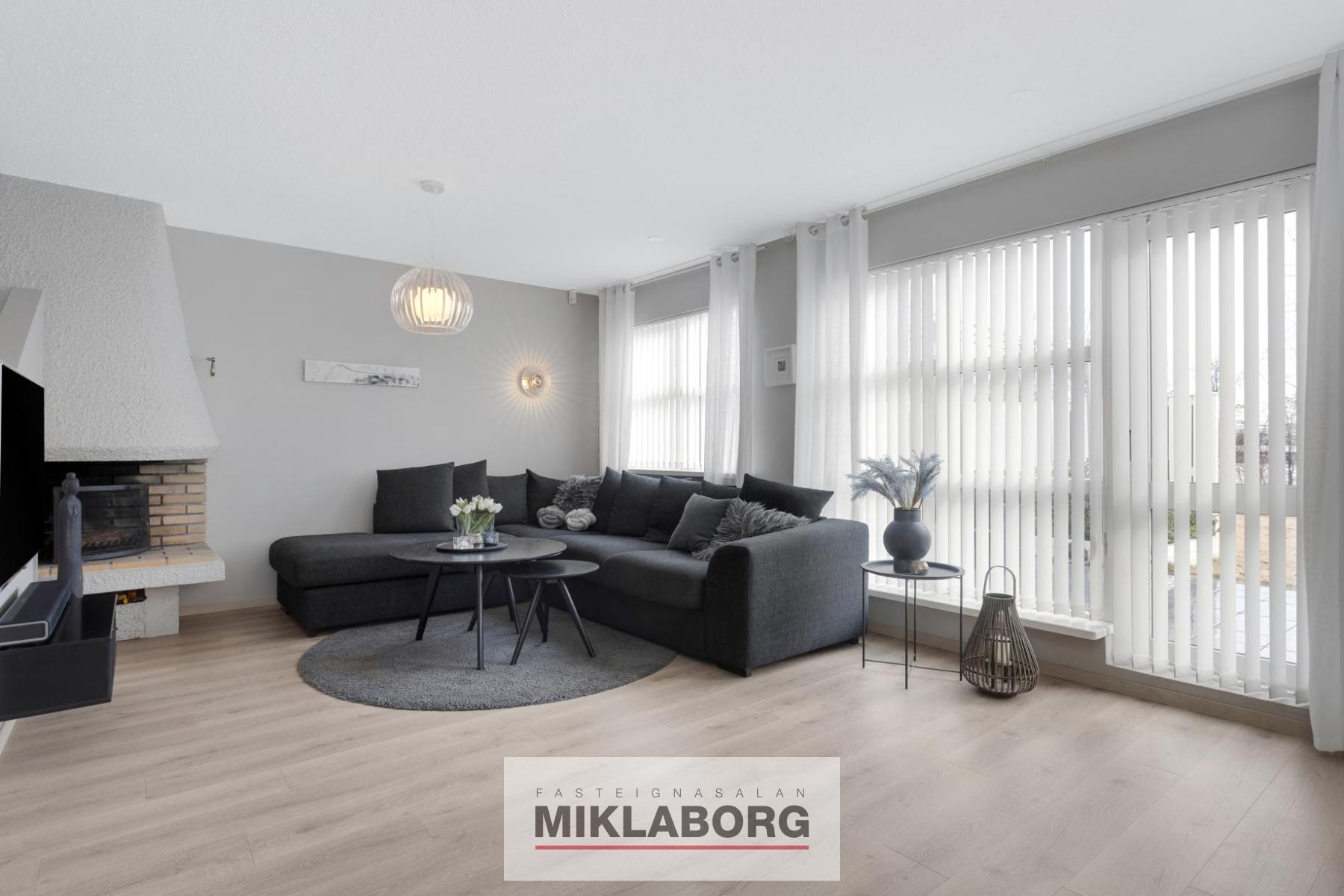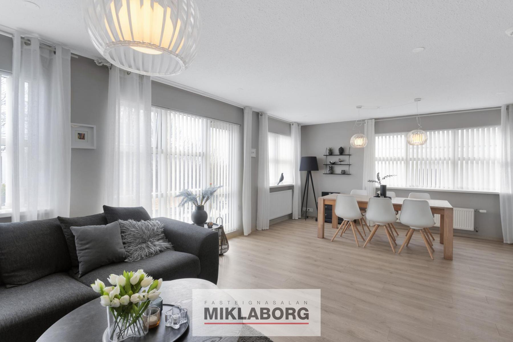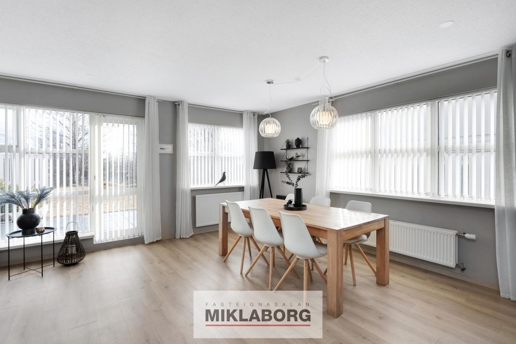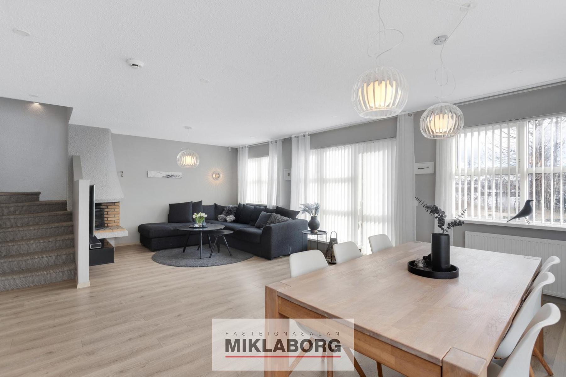 Samliggjandi stofa og borðstofa eru rúmgóðaðar og bjartar með útgengt á stóran sólpall. Arinn í stofu.