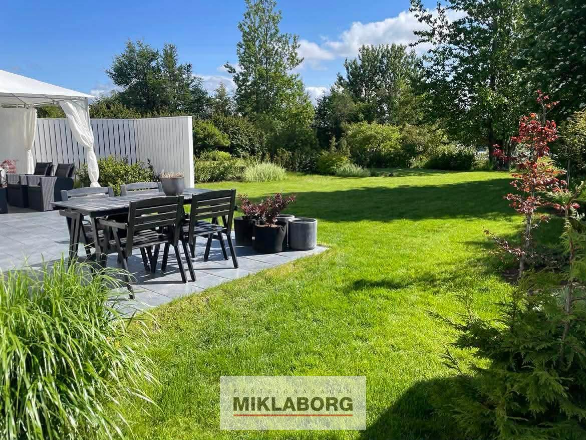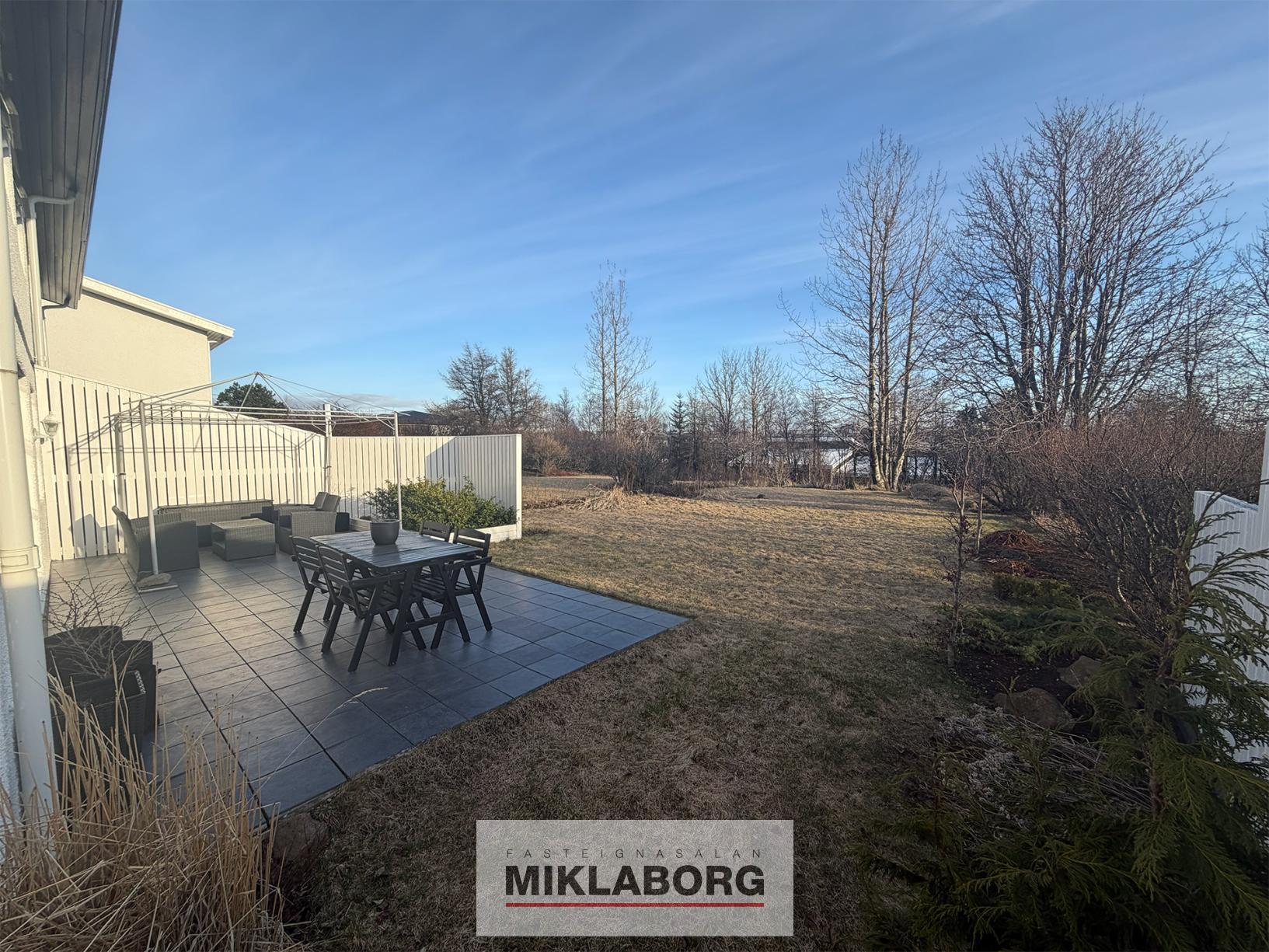 Bakgarður er skjólgóður og nýtur mikils næðis þar sem friðaður mói er við enda lóðarinnar.