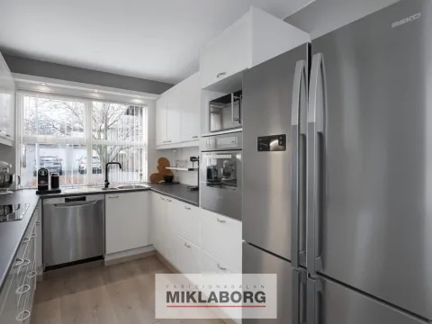 Eldhús er með hvítri innréttingu með góðu borðplássi. Bakaraofn í vinnuhæð og pláss fyrir tvöfaldan ísskáp. Hiti í gólfi. Borðkrókur tengir eldhús við borðstofu.