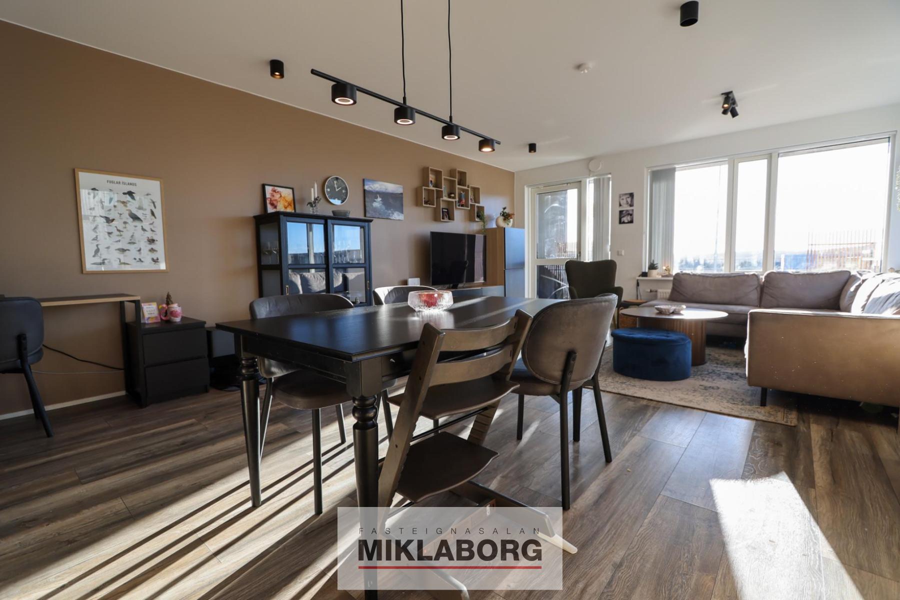 Eldhús & Alrými: Eldhúsið er haganlega hannað fyrir unnendur góðrar matreiðslu með smekklegri L-laga innréttingu og innbyggðum tækjum (ísskápur og uppþvottavél fylgja). Alrýmið er opið og flæðir náttúrulega yfir í bjarta stofu og borðstofu, þar sem harðparket á gólfum bindur rýmið fallega saman.