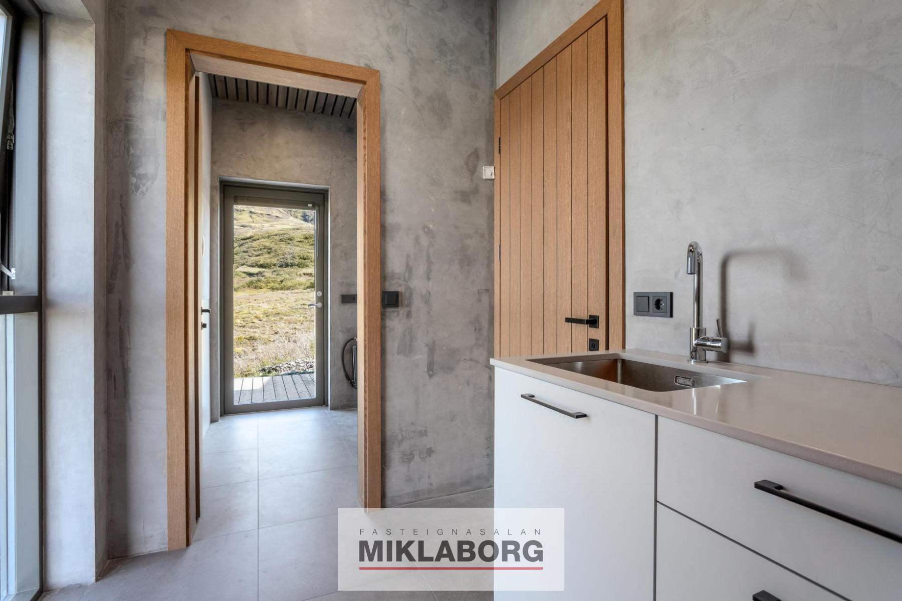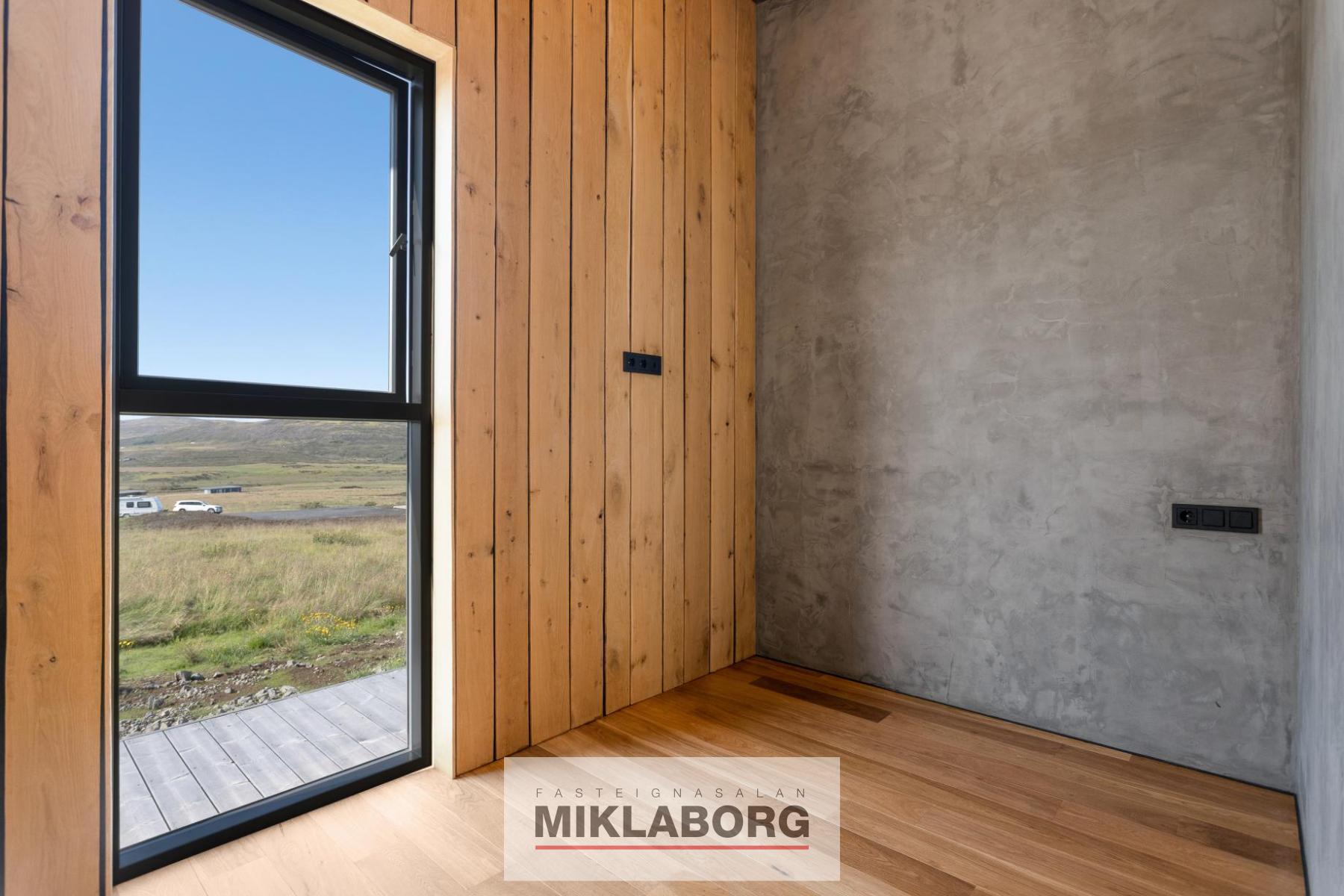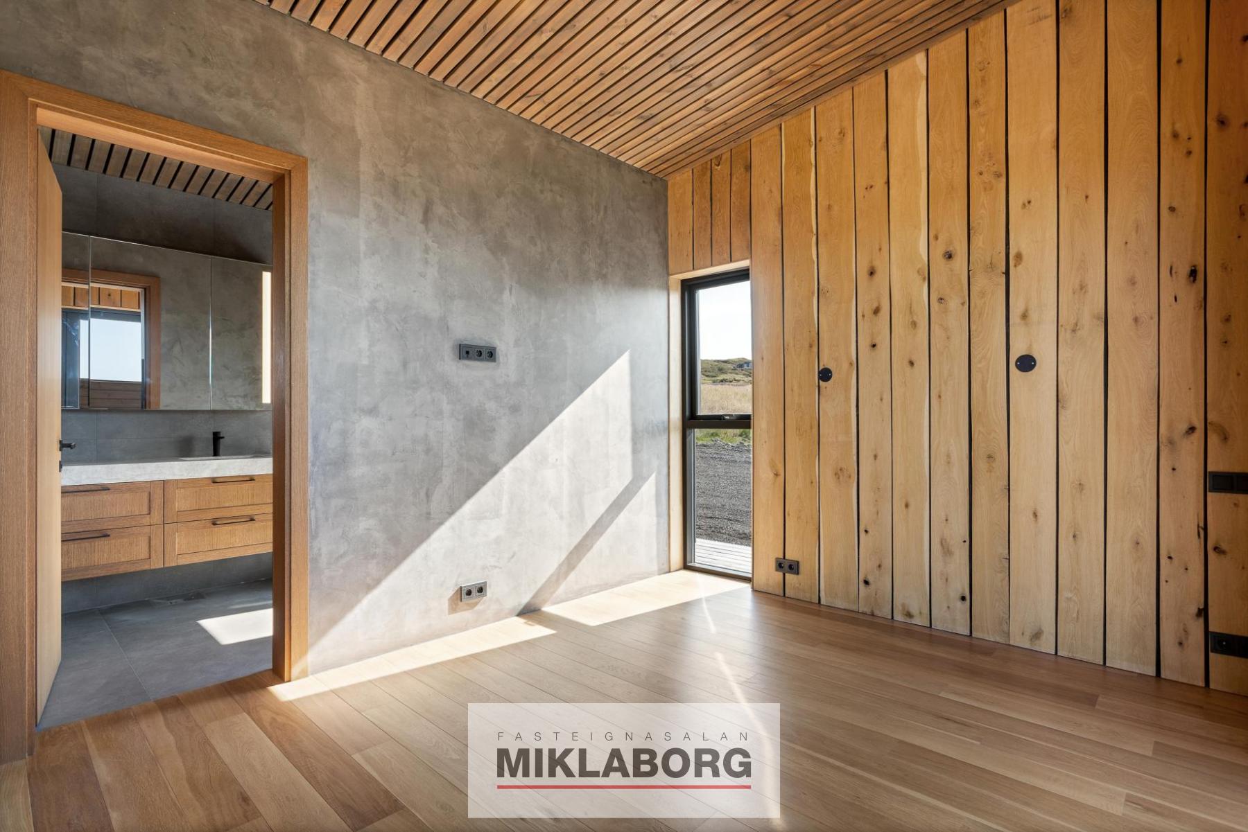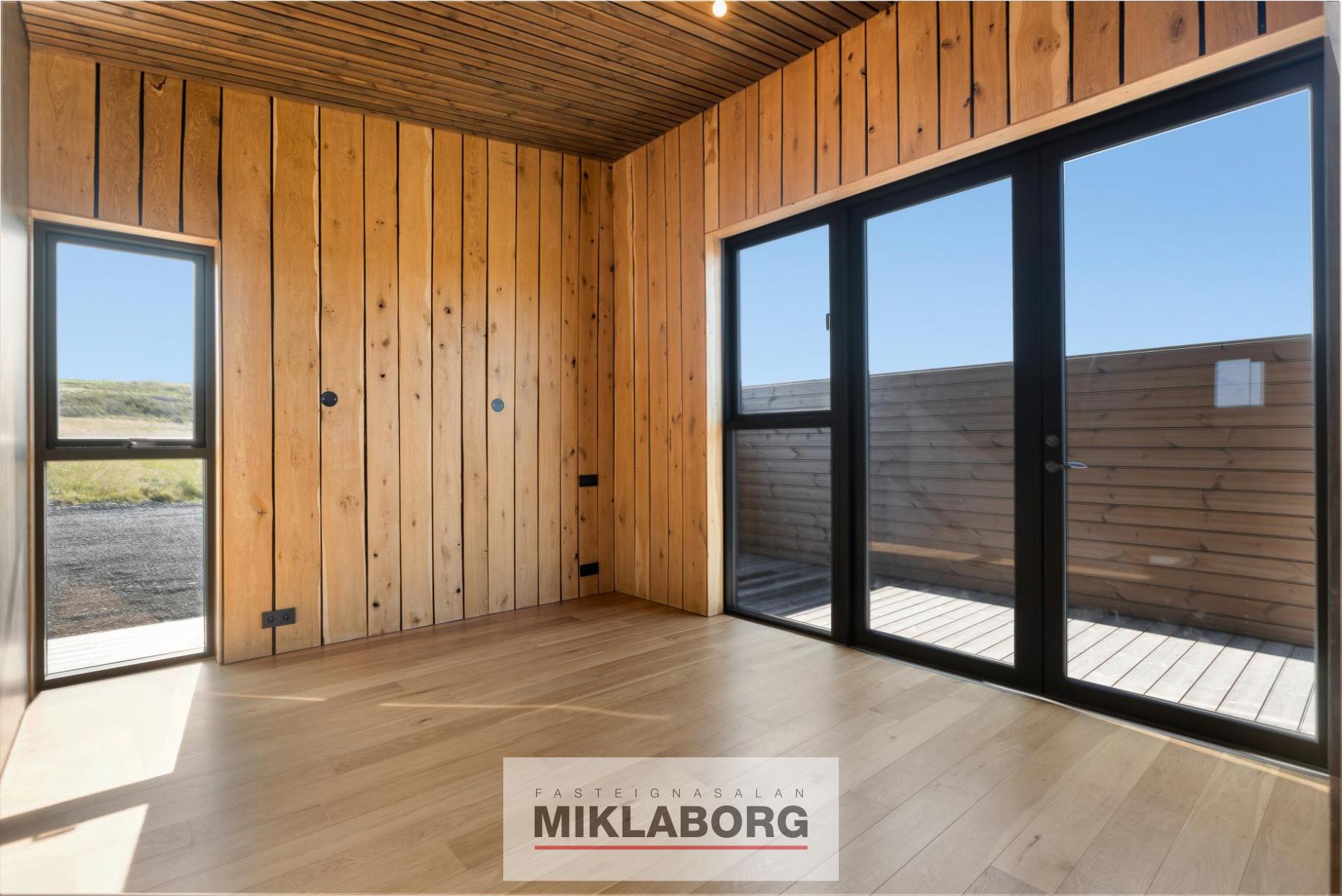 Gert er ráð fyrir heitum potti og tengingar eru fyrir hendi. Gólfplata er steypt og með hitalögn. Hitatúpa er fyrir gólfhitann og varmaskiptir fyrir neysluvatn. Að innan eru útveggir klæddir með sérskornri 12mm eikarklæðningu úr bjálkum í bland við microsement. Hurðir og innréttingar eru úr reyktri eyk. Loft eru með innfelldum ljósum. Lóð er að mestu frágengin en að öðruleiti skilast lóðin eins og hún er af náttúrunar hendi.