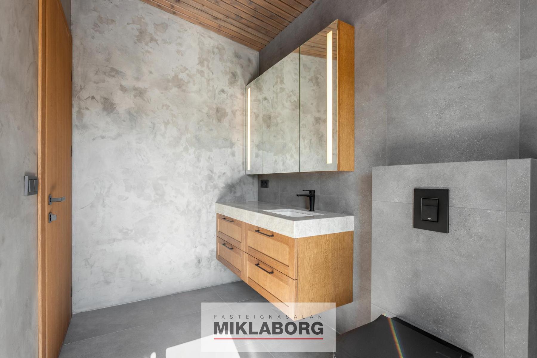 - Annað baðherbergi er flísalagt í gólf og veggi, með vandaðri viðarinnréttingu, granít borðplötu.