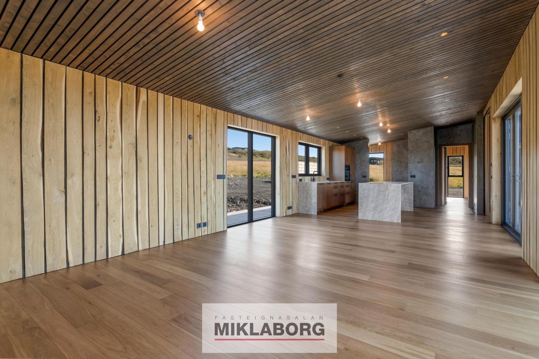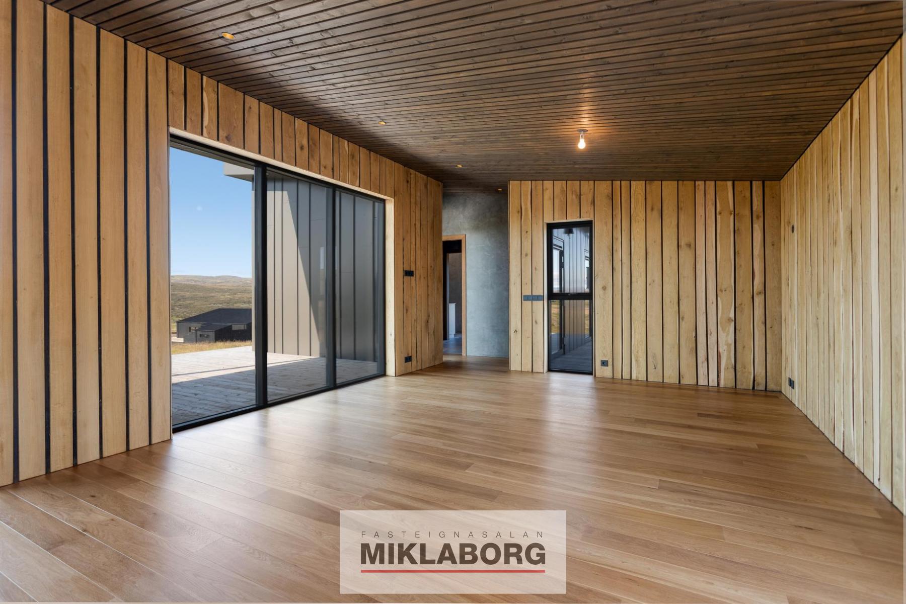 Í húsinu eru sérsmíðaðar spónlagðar innréttingar. Húsið er álklætt að utan með stuðlabergsklæðningu og með ál/tré gluggum. 120m2 Sólpallur klæddur með fallegu og endingargóðu pallaefni frá Lunawood í Finnlandi, sem hentar einstaklega vel fyrir krefjandi íslenskar aðstæður, skjólgirðing að hluta.
