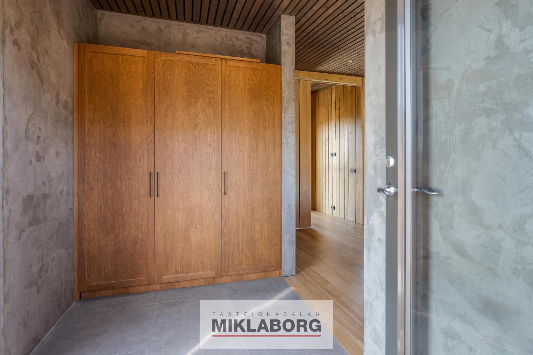 - Allir útveggir að innan eru klæddir með eikarklæðningu og steypuáferð.