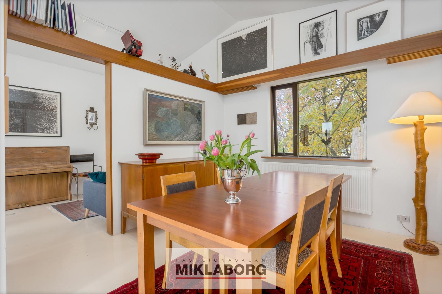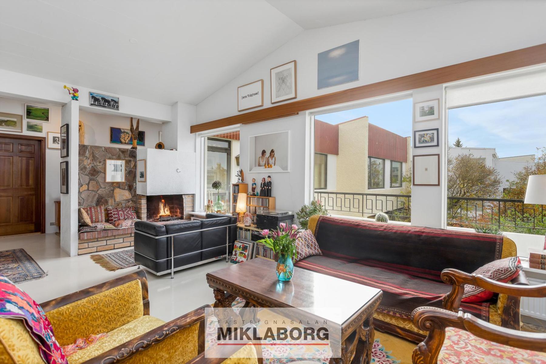 Jarðhæðin: Gengið er inn í forstofu með mynstruðum flísum á gólfi. Þaðan er gengið inn í bjart og opið rými með mikilli lofthæð þar sem stofa, borðstofa og sjónvarpshol eru, flotað gólf. Í stofu er einnig arinn við fallega steinlagðan vegg. Eldhúsið er í sér rými, góð lofthæð og vænlegur eldhúskrókur með dökkri viðarinnréttingu, gluggar á tvo vegu með opnanlegu fagi. Inn af eldhúsi er rúmgott búr með hillum, korkur á gólfi í báðum rýmum. Baðherbergið er innangengt af bæði stigapalli og hjónaherbergi. Flísar á gólfi og veggjum, hvít innrétting með handlaug, salernisskál, baðkar með sturtu. Hjónaherbergi er rúmgott með góðri lofthæð, stórum fataskáp sem nær til lofts á heilum vegg og parket á gólfi. Auka herbergi er á hæðinni við hlið eldhúss með góðri lofthæð og parket á gólfi. Af stigapalli er útgengt á stórar svalir sem snúa til suðurs.