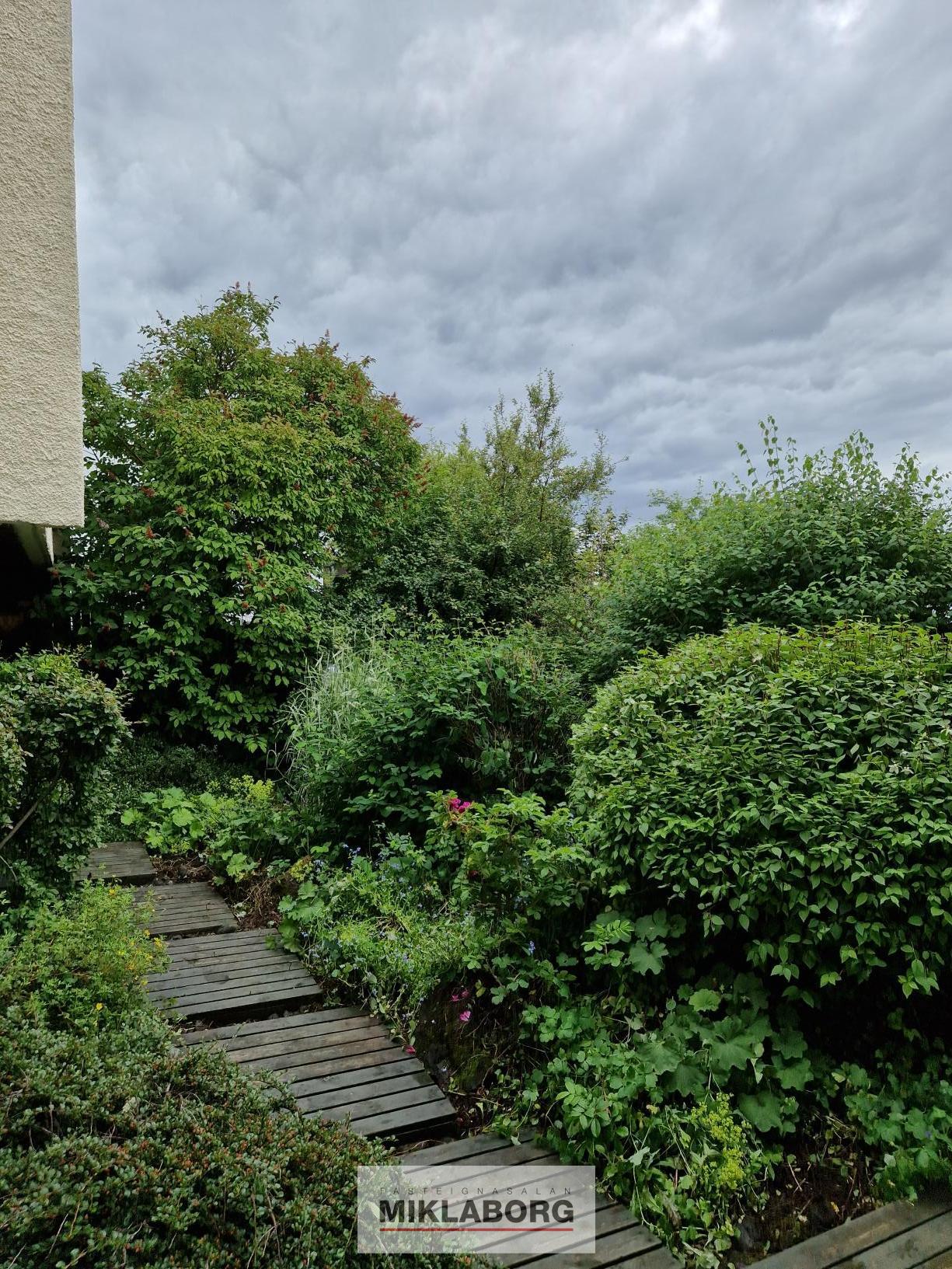 Neðri hæðin: Þegar komið er niður stiga þar sem opið vinnurými er í holi. Þvottahús og geymslur eru einnig á hæðinni. Hjá stigapalli inn af gangi er stórt svefnherbergi með parket á gólfi, einnig er útgengt af stigapalli út í gróinn garð. Í garðinum, sem er í japönskum anda, hannaður af er stórt skjólgott skýli með palli og kaldri geymslu. Á neðri hæðinni er einnig 2ja herbergja íbúð sem er í útleigu. Þar er eitt svefnherbergi, eldhús, stofa og baðherbergi. Sérinngangur að aukaíbúðinni er á vestur hlið hússins, gengið niður meðfram húsinu.