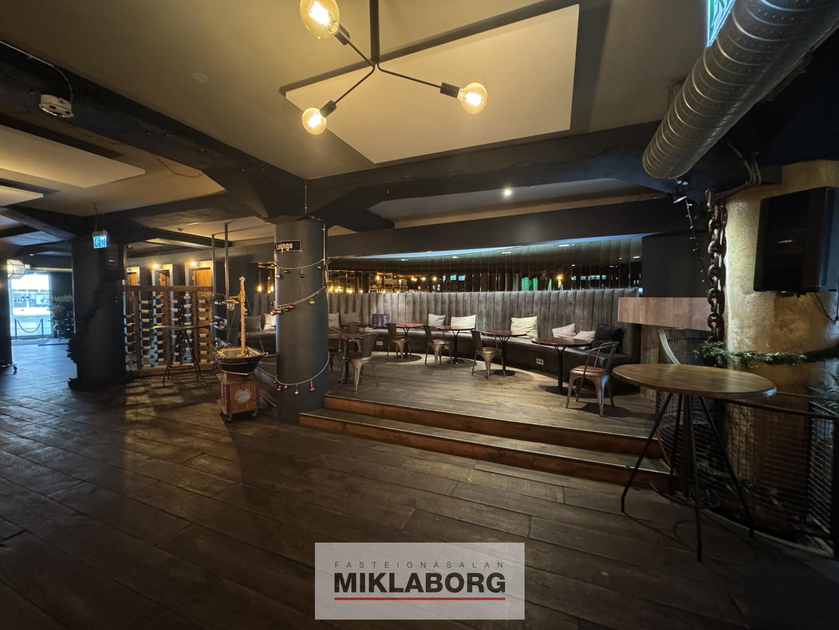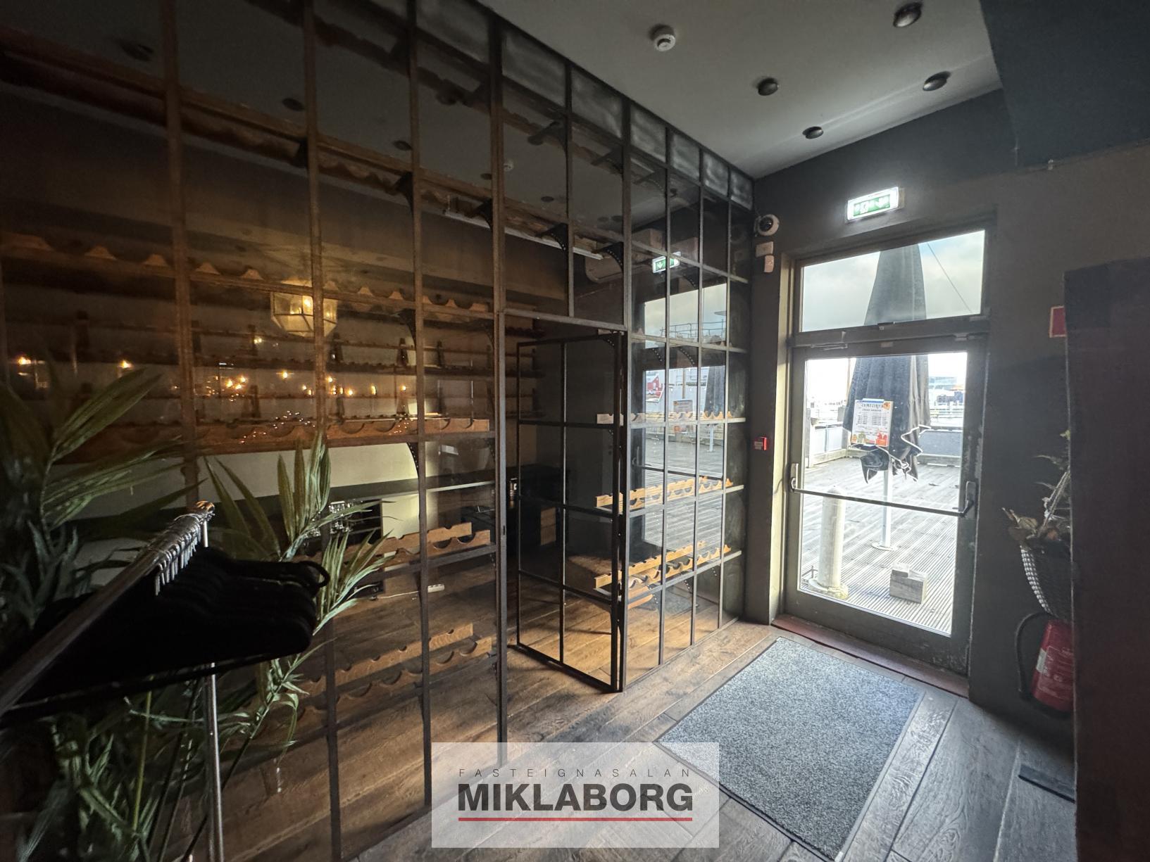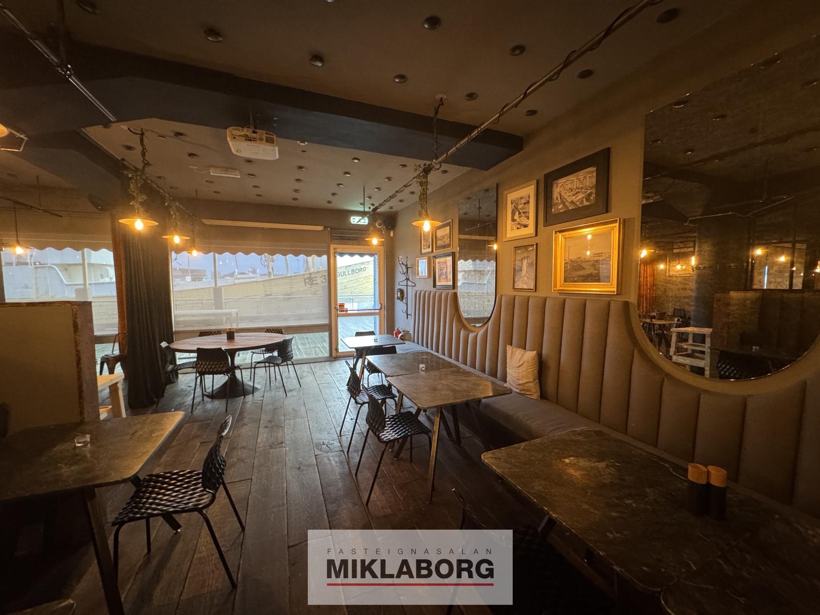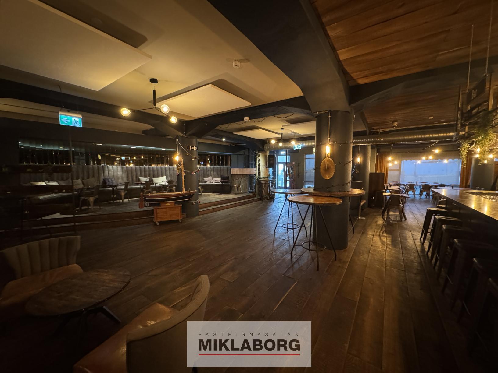 Nánari lýsing: Komið er inn í flísalagt anddyri. Stór bar er fyrir miðju og til hliðar er veitingasalur og þar eru í dag bruggtæki en staðurinn er meðal annars þekktur fyrir að brugga sinn eigin bjór. Bak við barinn er fullbúið eldhús og kælar. Meðfram suðurhlið hússins er veitingasalur sem er með gluggum sem snúa út að bryggjunni og þar fyrir utan er útisvæði með stórum timburpalli. Staðurinn er fallega innréttur með vönduðum innréttingum. Húsnæðið hefur verið í leigu en leigusamningur er útrunninn og húsnæðið því laust til afhendingar fyrir kaupanda við kaupsamning. Öll tæki og búnaður sem er til staðar í húsnæðinu getur fylgt með í kaupunum.