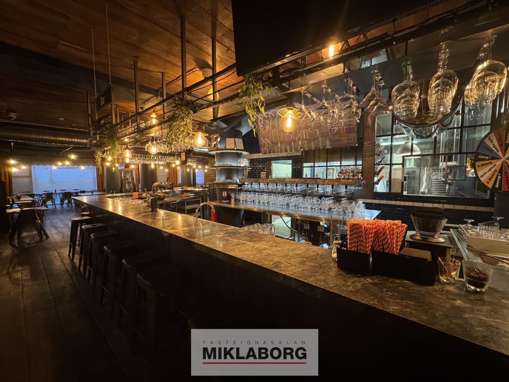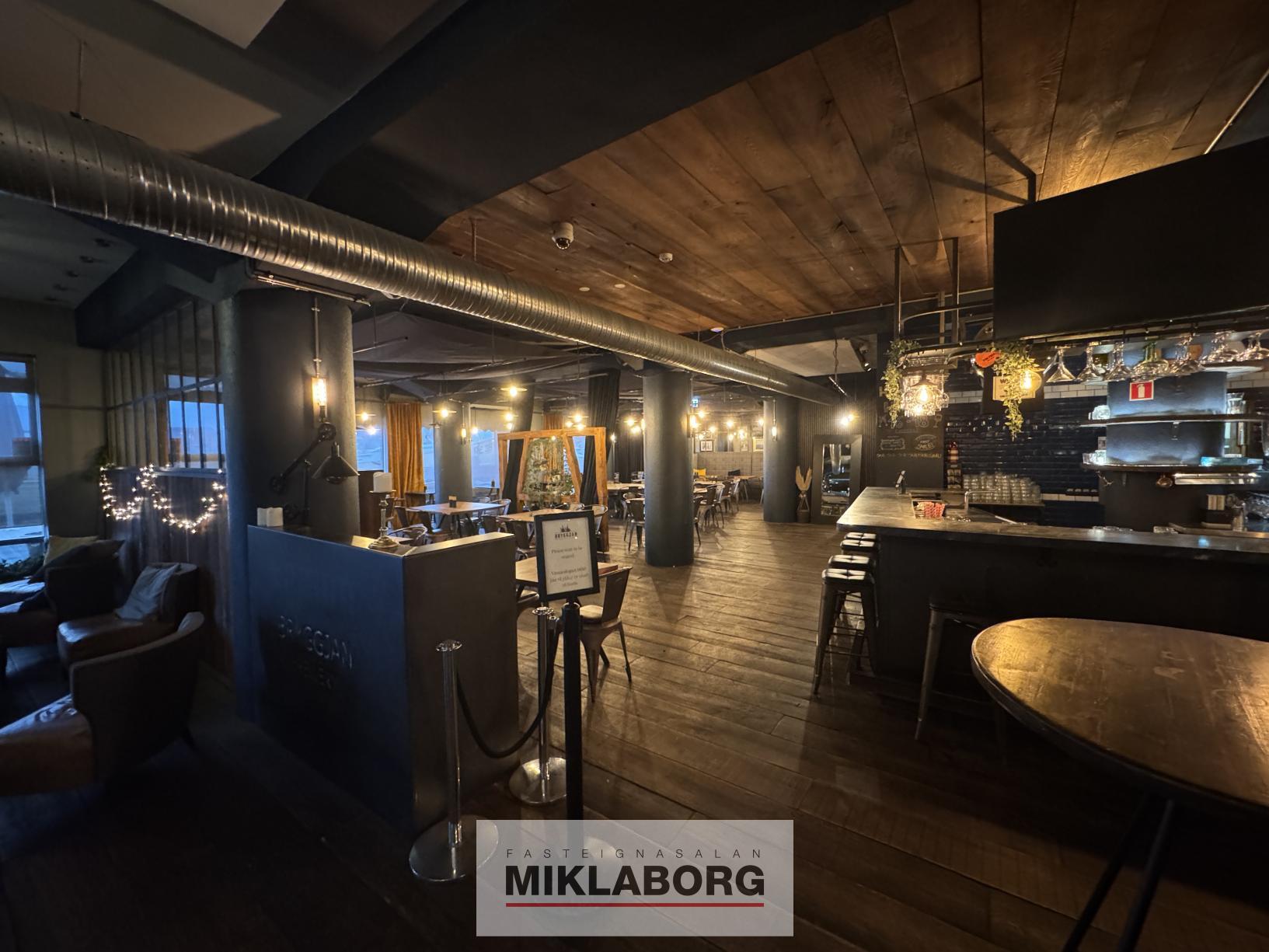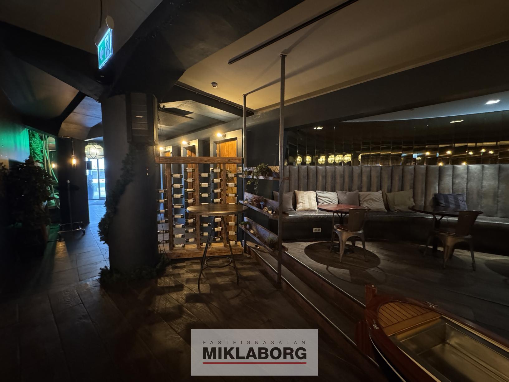 Nánari lýsing: Komið er inn í flísalagt anddyri. Stór bar er fyrir miðju og til hliðar er veitingasalur og þar eru í dag bruggtæki en staðurinn er meðal annars þekktur fyrir að brugga sinn eigin bjór. Bak við barinn er fullbúið eldhús og kælar. Meðfram suðurhlið hússins er veitingasalur sem er með gluggum sem snúa út að bryggjunni og þar fyrir utan er útisvæði með stórum timburpalli. Staðurinn er fallega innréttur með vönduðum innréttingum. Húsnæðið hefur verið í leigu en leigusamningur er útrunninn og húsnæðið því laust til afhendingar fyrir kaupanda við kaupsamning. Öll tæki og búnaður sem er til staðar í húsnæðinu getur fylgt með í kaupunum.