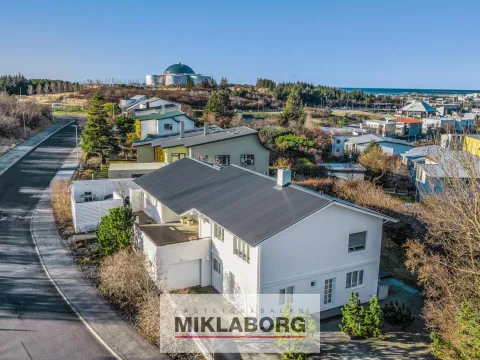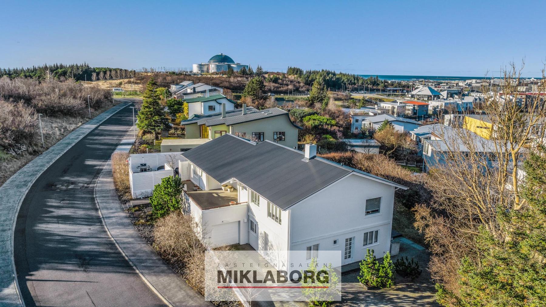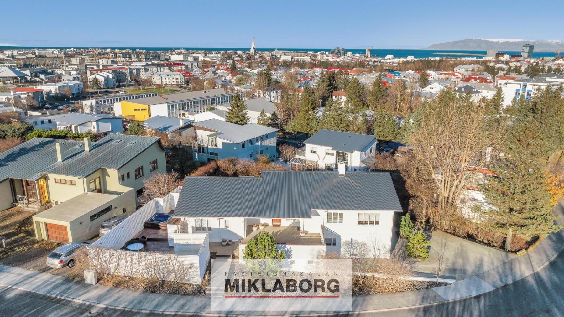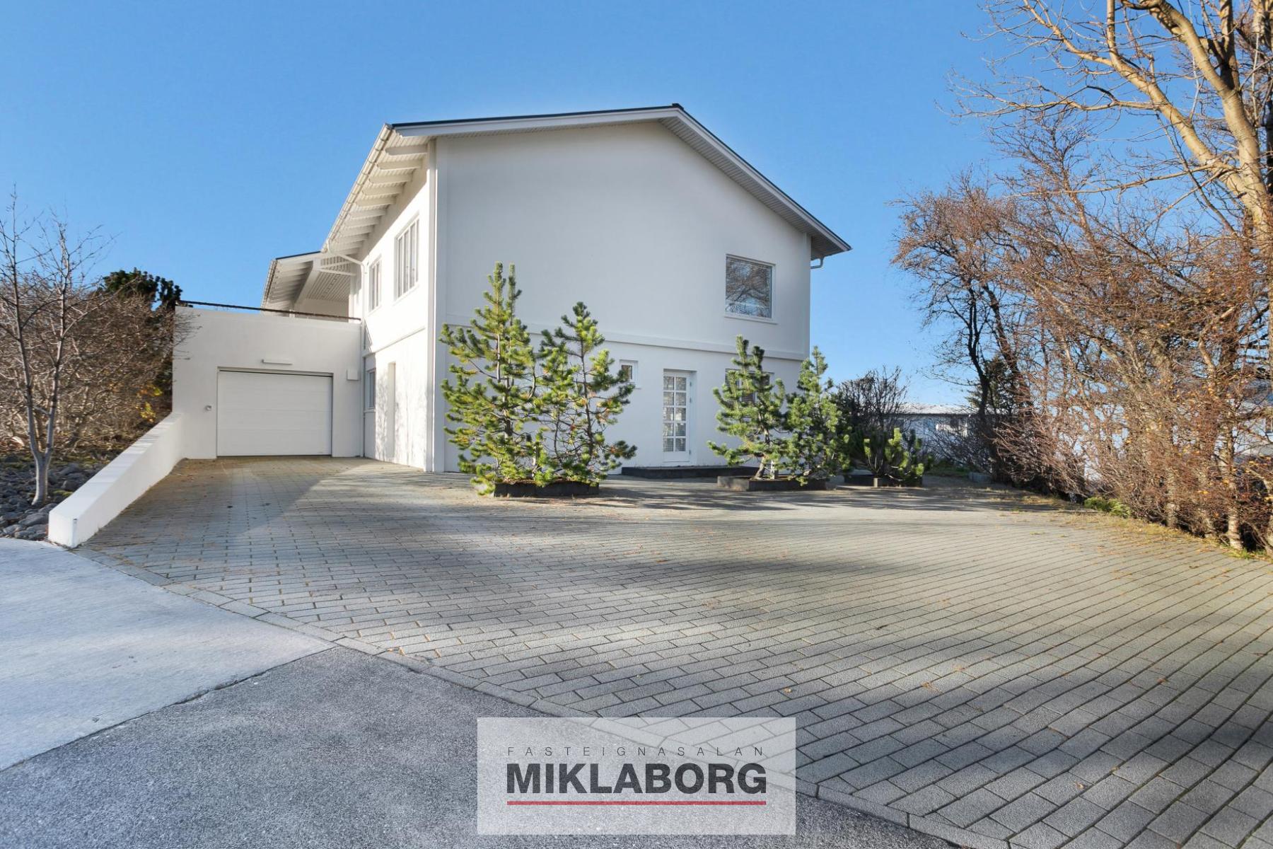 Miklaborg kynnir: Einstakt hús á einstökum stað. Húsið er tveggja hæða í lokaðari götu sem aðeins telur sex hús, fjærst umferð. Húsið er allt hið glæsilegasta, hefur fengið gott viðhald og verið endurnýjað að nær öllu leyti. Hér er um einstakt tækifæri að ræða en hús við Háuhlíð koma afar sjaldan á markað. Innbyggður bílskúr og sex bílastæði á lóð. Útipallar á þremur hliðum hússins.