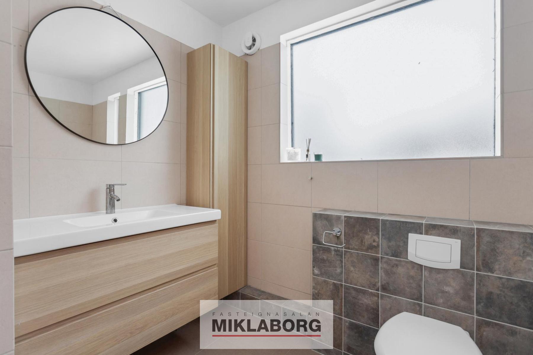 Neðri hæð - Stigi frá miðpalli. Rúmgott baðherbergi bæði með baðkari og sturtuklefa, gólf og veggir eru flísalagðir, gólfhiti og snyrtileg innrétting með vask. Fjögur svefnherbergi þar af hjónaherbergi með fataskápum en útgengi er frá hjónaherbergi út á afgirtan sólpall. Pallurinn snýr í suðvestur og er með hliði sem er aðgengilegt frá enda hússins. Á hæðinni er þvottahús með góðum innréttingum og vask í innréttingu og loftræstingu. Inn af þvottahúsi er rúmgóð geymsla. Lítið vinnuherbergi gluggalaust er á milli þvottahúss og herbergis. Gólfefni hússins er að hluta til harðparket og að hluta flísar en gólfefnin eru frekar nýleg. Útihurð og svalahurðir eru nýlegar. Bílskúr er skráður 19,2 fm og er hann með rafdrifinni bílskúrshurð en auka geymslurými er á millilofti bílskúrsins. Snjóbræðsla er í aðkomu að húsi og bílskúr. Lóðin er frekar lítil en trjágróður er götumegin við húsið.