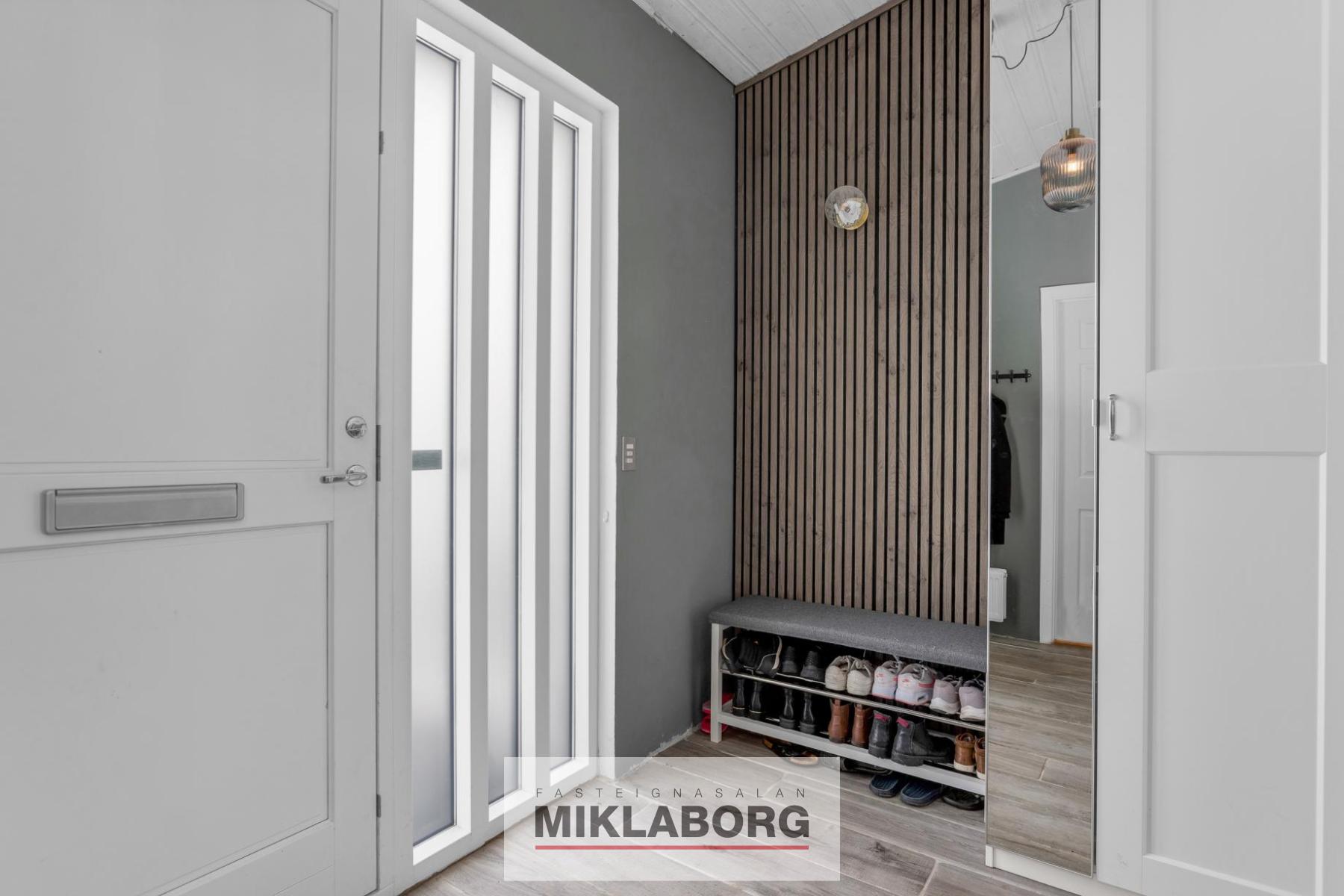 Miðpallur - Inngangur í húsið og þar er forstofa með fataskáp, gott svefnherbergi og falleg gestasnyrting.