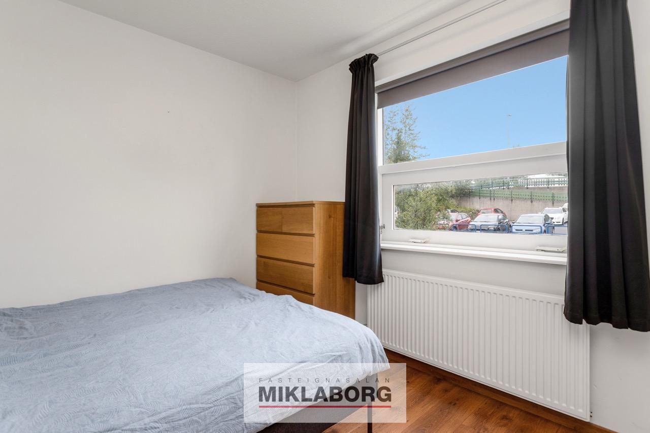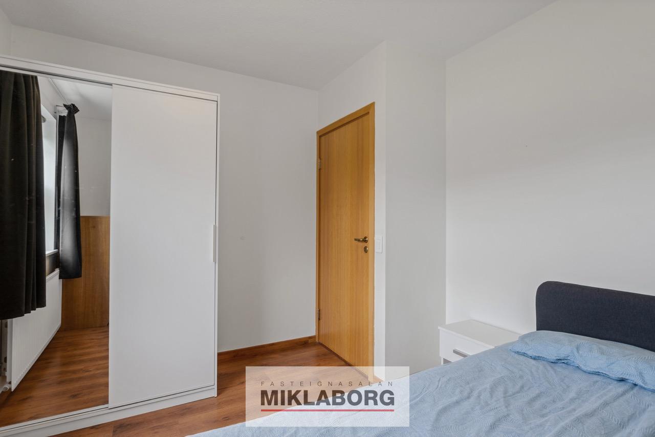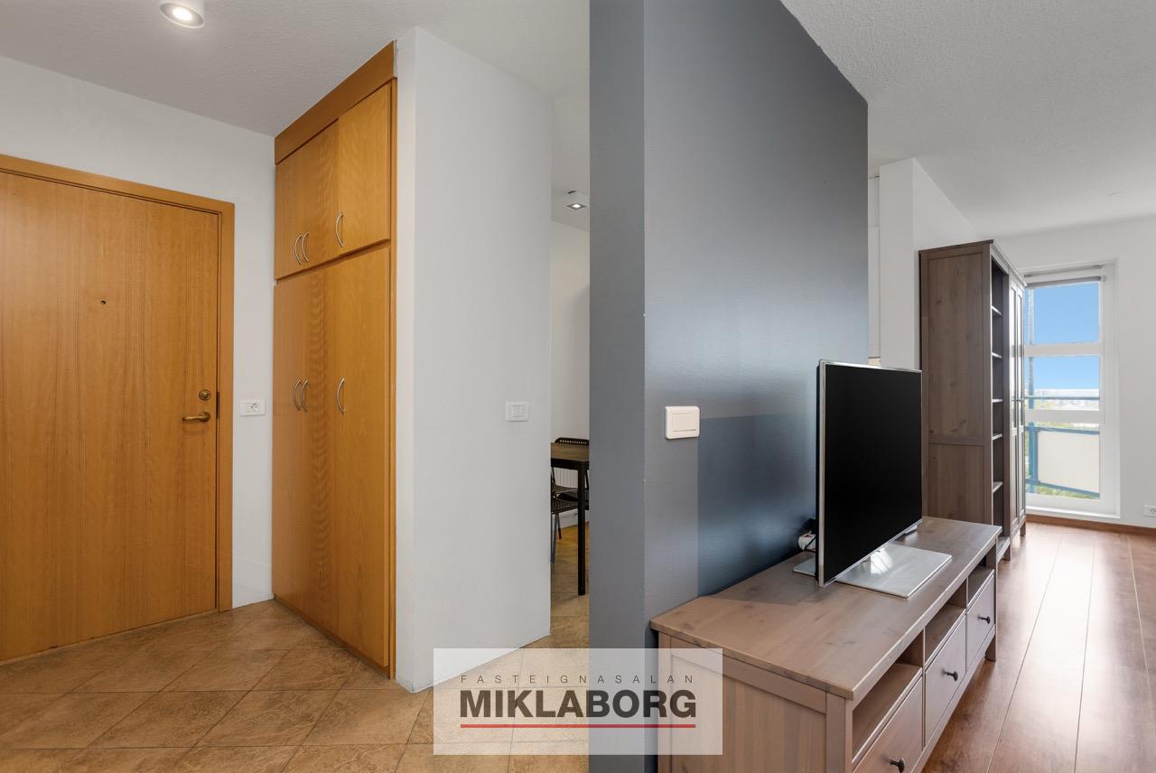 Komið er inn í forstofu með flísum á gólfi og fataskáp. Eldhús með flísum á gólfi, ljósri innréttingu með dökkri borðplötu, eldavél, háf og plássi fyrir uppþvottavél og ísskáp. Stofa með parketi á gólfi og útgengi út á svalir til suð-vesturs. Hjónaherbergi með parketi á gólfi og fataskáp. barnaherbergi með parketi á gólfi og fataskáp. Baðherbergi með flísum á gólfi, innréttingu með vask, salerni, baðkari með sturtuaðstöðu og innréttingu fyrir þvottavél og þurrkara. Sér geymsla er í kjallara hússins sem og sameiginleg hjólageymsla.