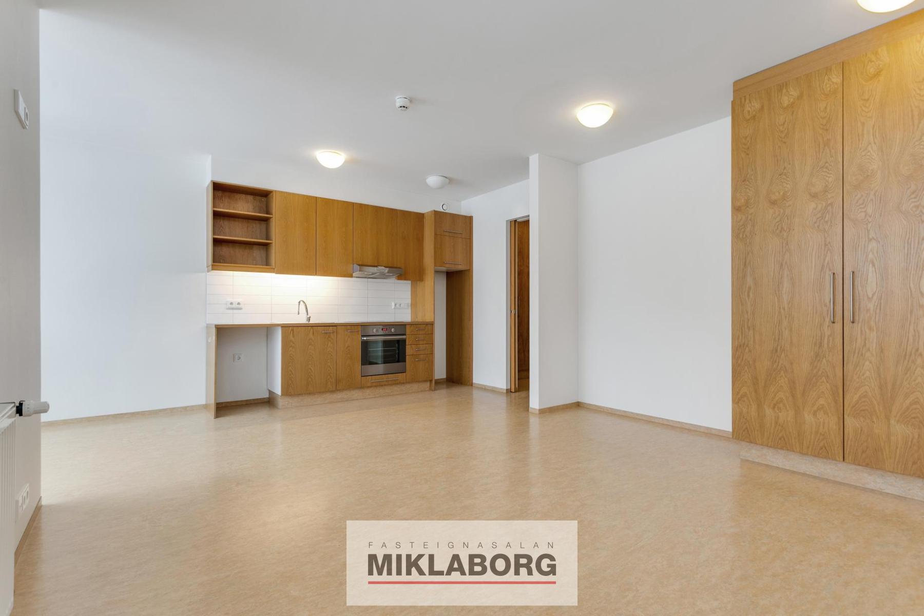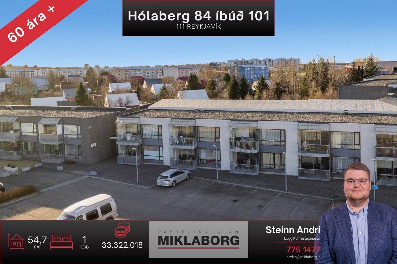 Miklaborg kynnir: Bjarta stúdíó íbúð á 1. hæð við Hólaberg 84. Eignin er skráð 54,7fm en þar ef er 8,2 fm geymsla. Eignin skiptist í anddyri, baðherbergi með sturtu og tengi fyrir þvottavél, rúmgott alrými með eldhús innréttingu, fataskáp og útgengt út á yfirbyggðar svalir sem snúa til suð-vesturs. Innangengt í þjónustumiðstöðina Gerðubergi þar sem er m.a. mötuneyti, bókasafn og ýmisleg þjónusta.