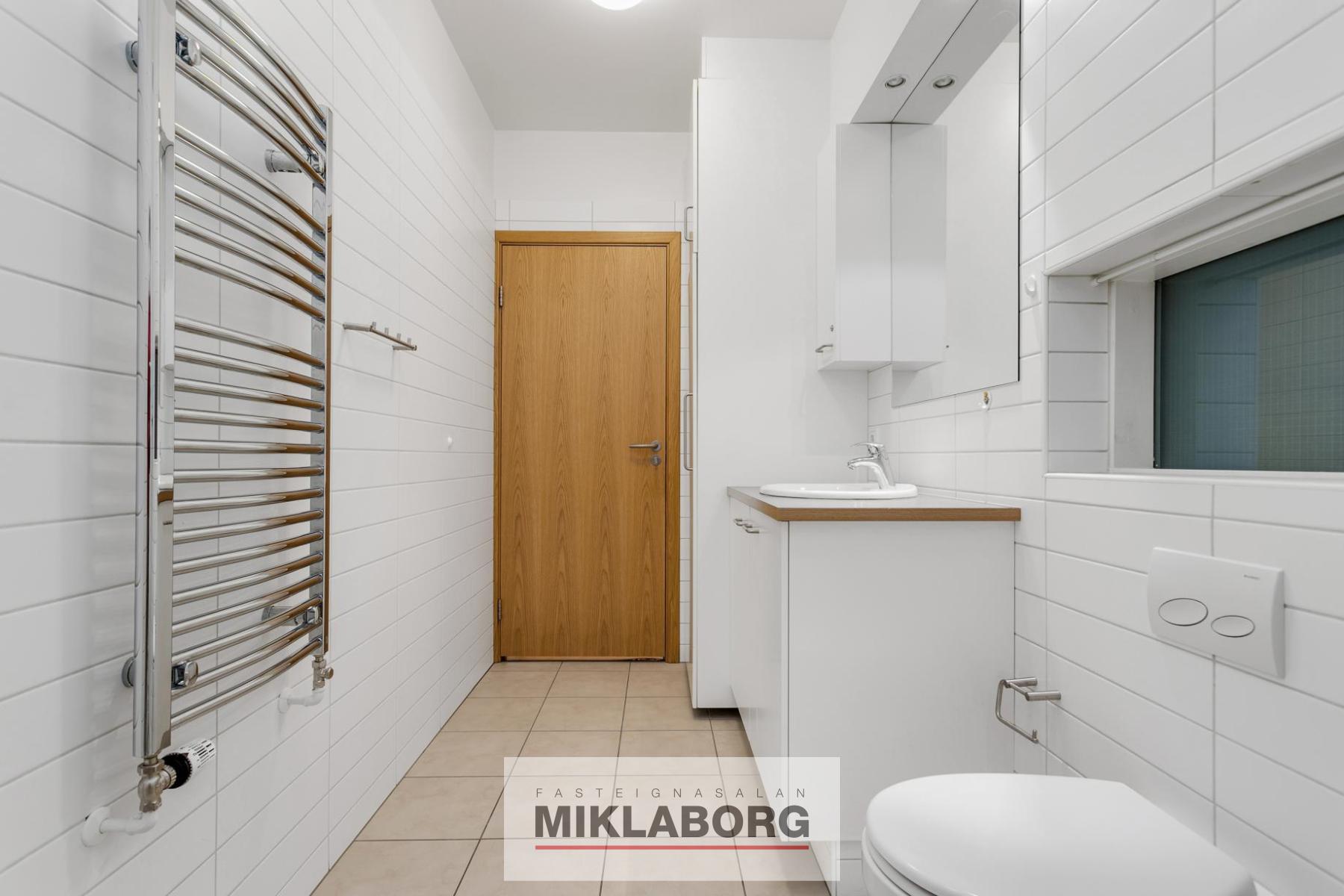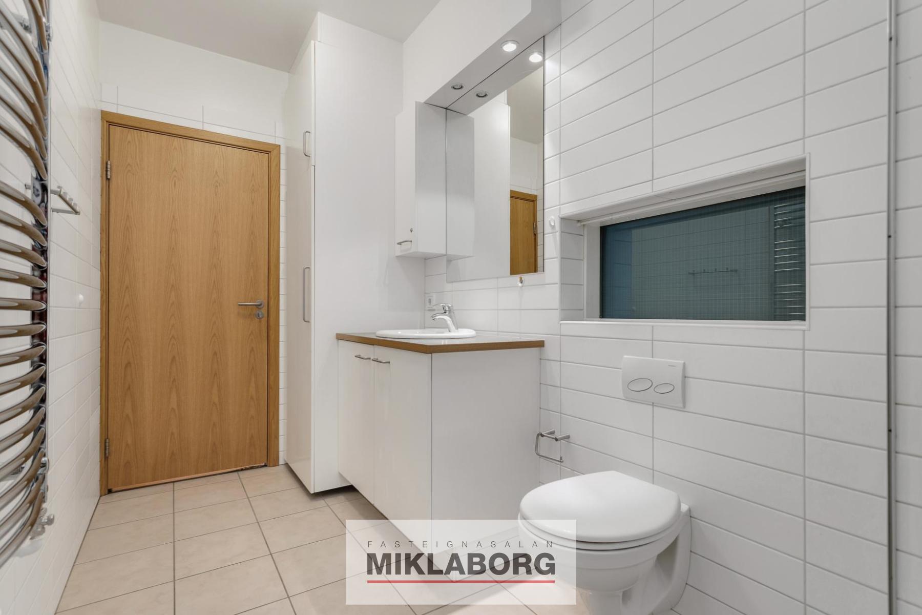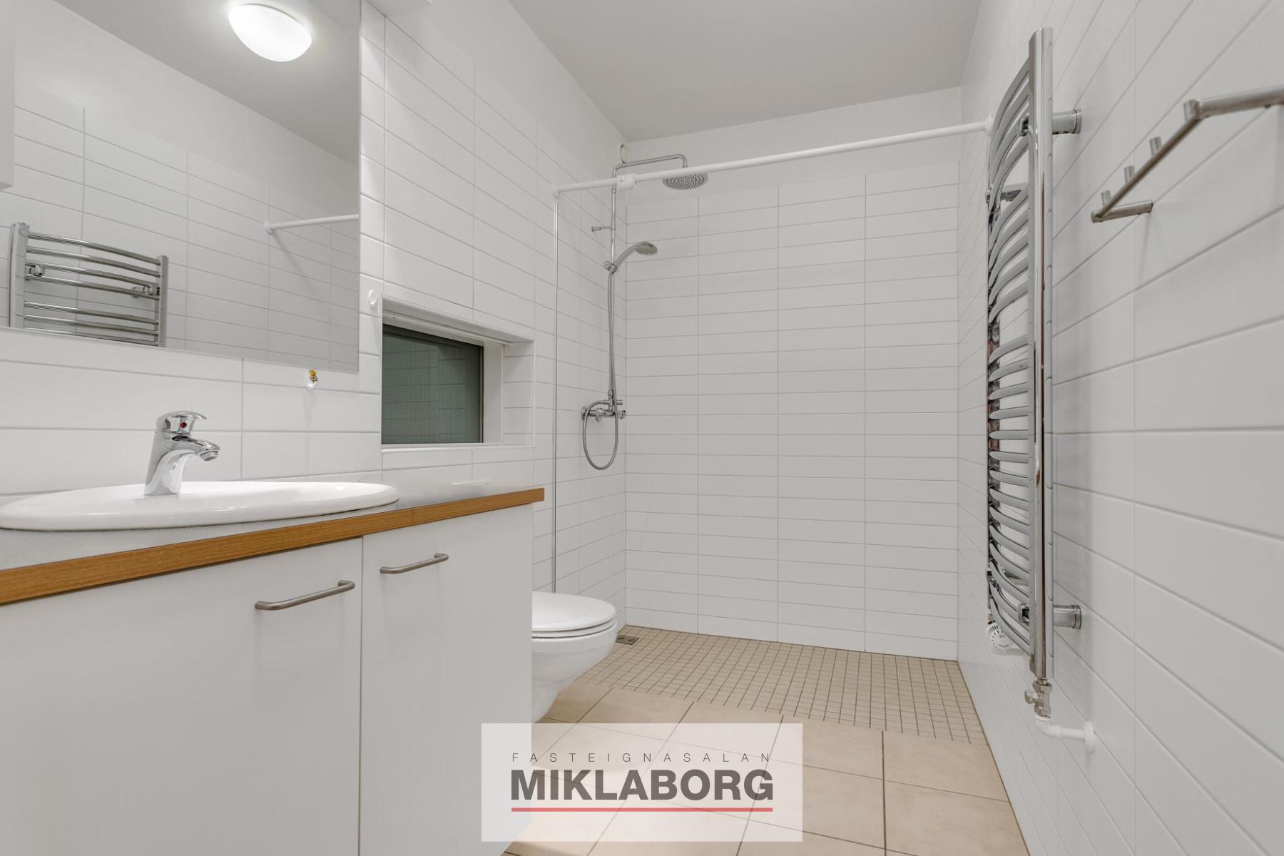 Baðherbergi: Flísar á gólfi og upp veggi. Hvít innrétting. Sturta og upphengt klósett. Tengi fyrir þvottavél í innrettingu.