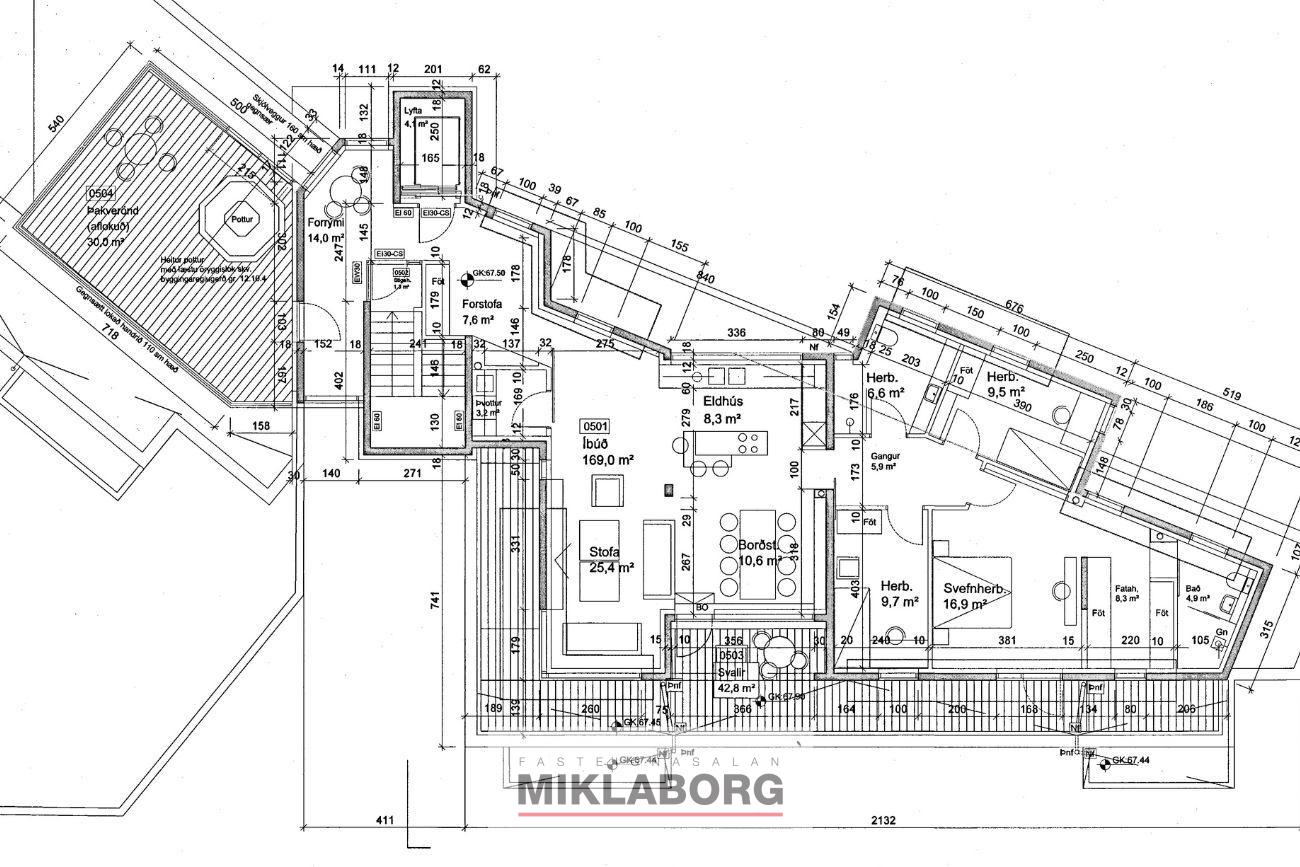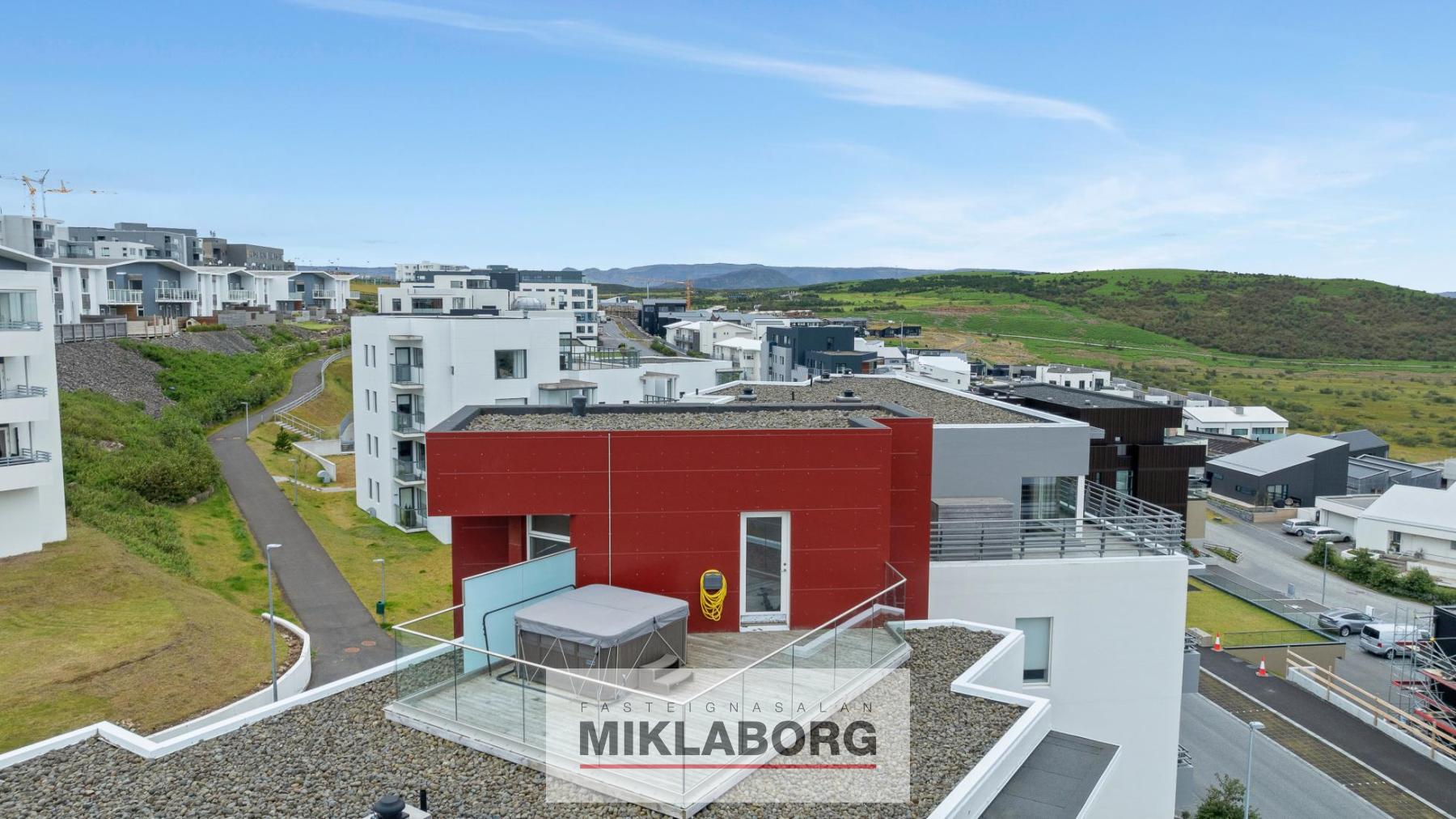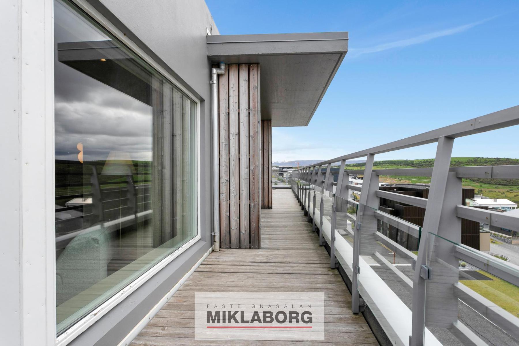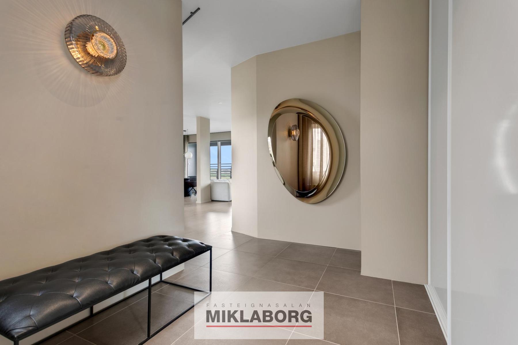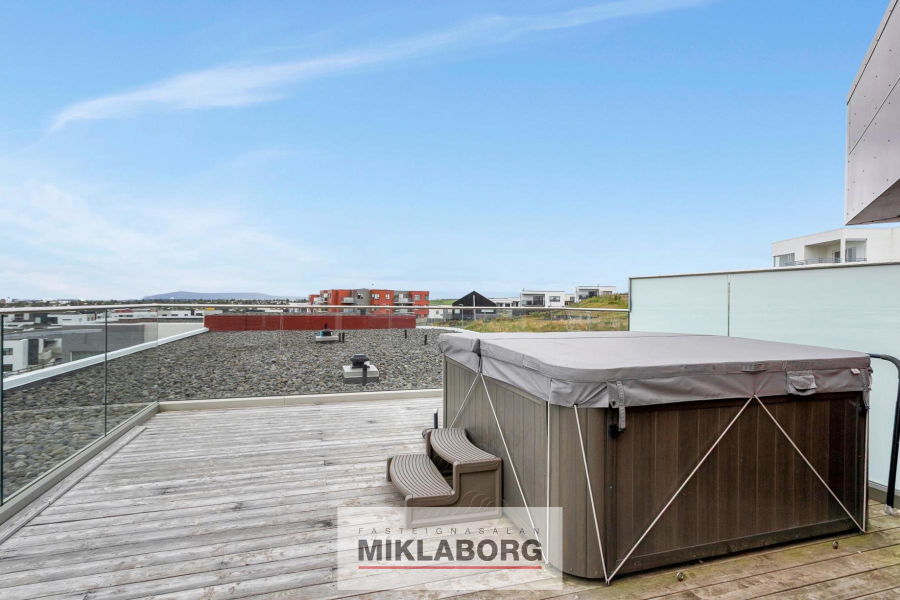 Forstofa: mjög rúmgóð, björt og flísalögð með miklum gluggum, frábæru útsýni og útgengi á um 30 fermetra þaksvalir með heitum potti og glerhandriði á stálfprófílum. Frá svölum nýtur einstaks útsýnis til norðurs, vesturs og suðurs.