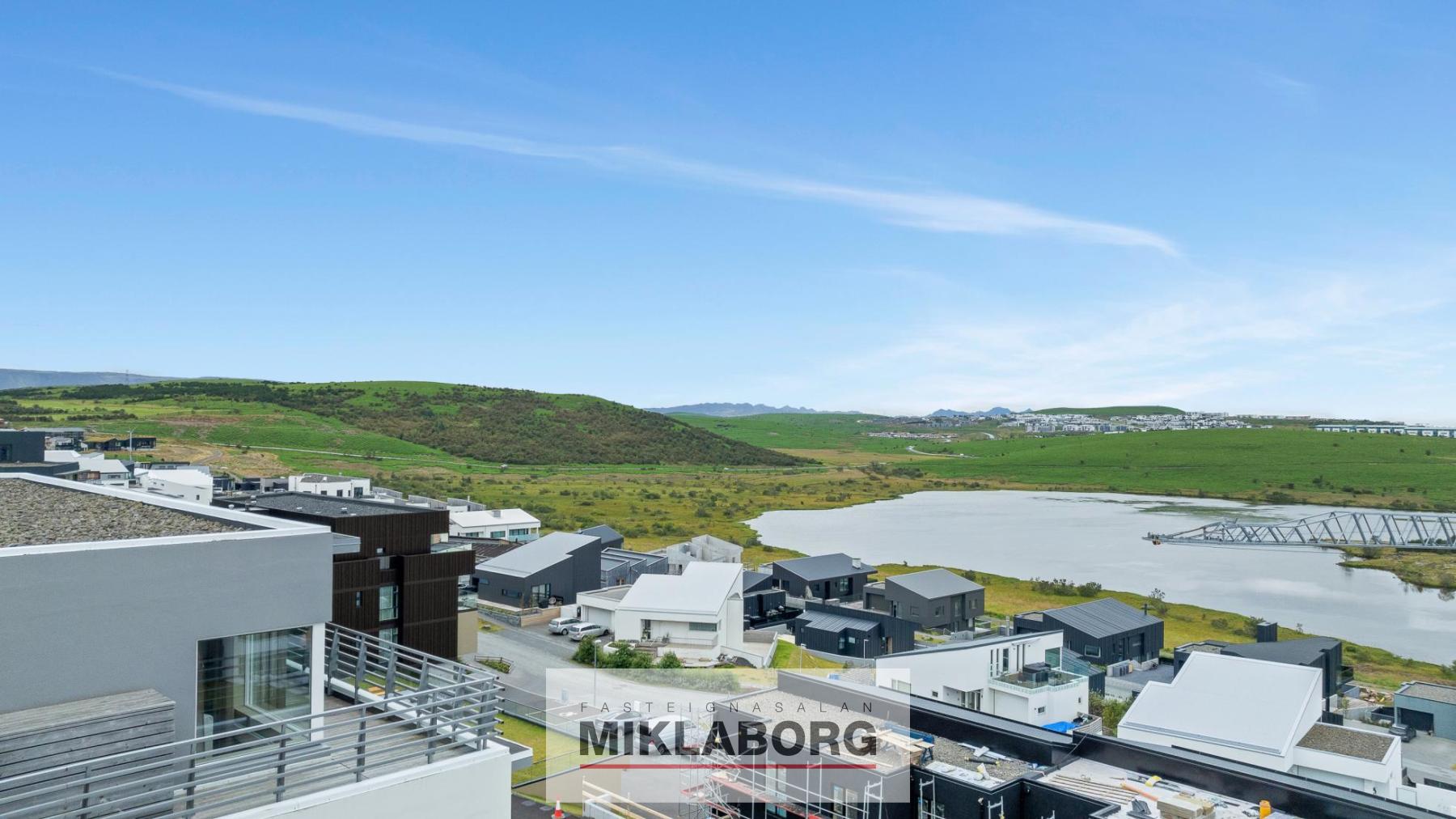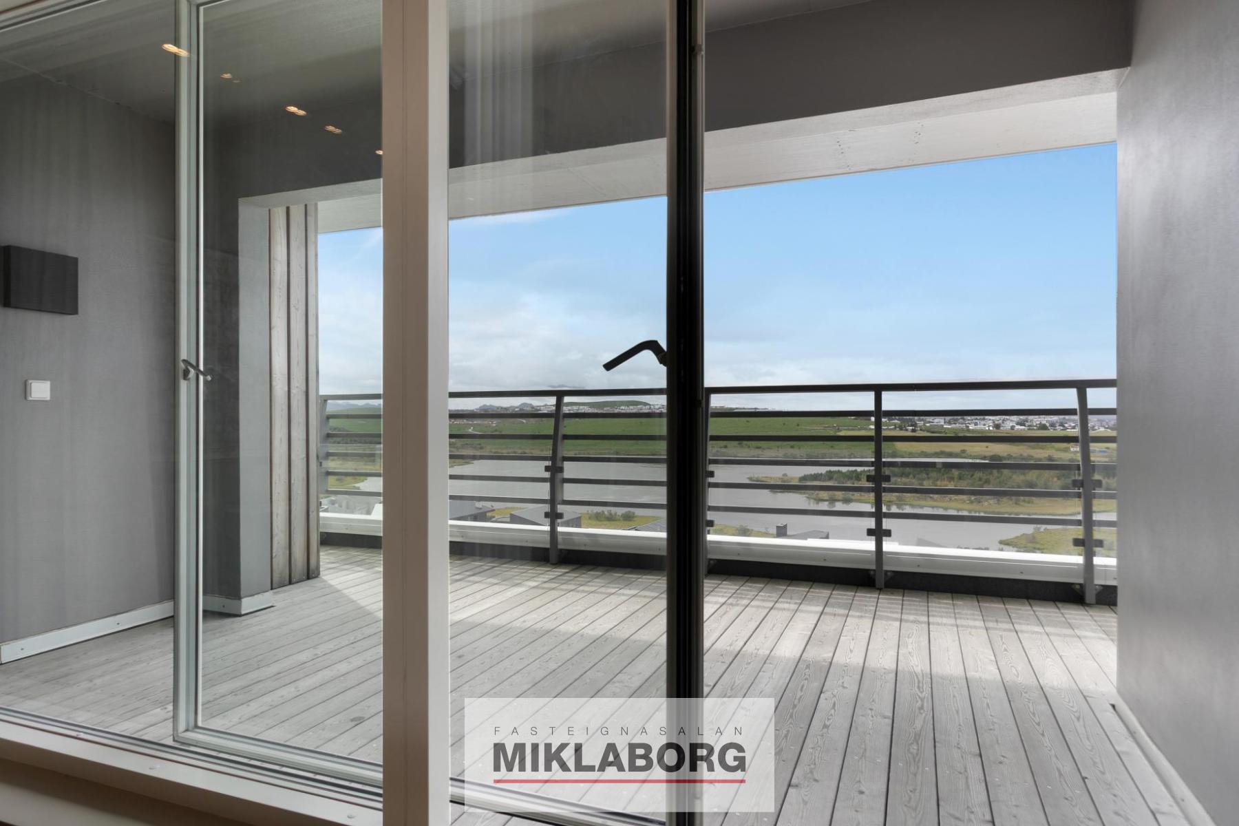 Stofa: parketlögð og björt með gólfsíðum gluggum, einstöku útsýni yfir Urriðakotsvatn, að Reykjanesi, Snæfellsjökli og víðar. Úr stofu er útgengi á um 40,0 fermetra svalir til suðurs, vesturs og norðurs sem eru með þaki yfir að hluta, glerhandriði á stálprófílum og frábæru útsýni.